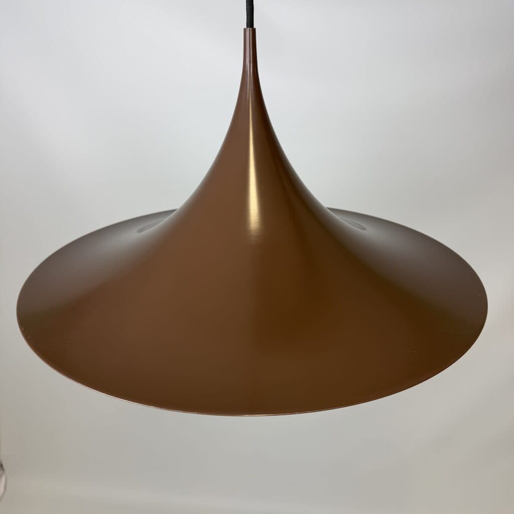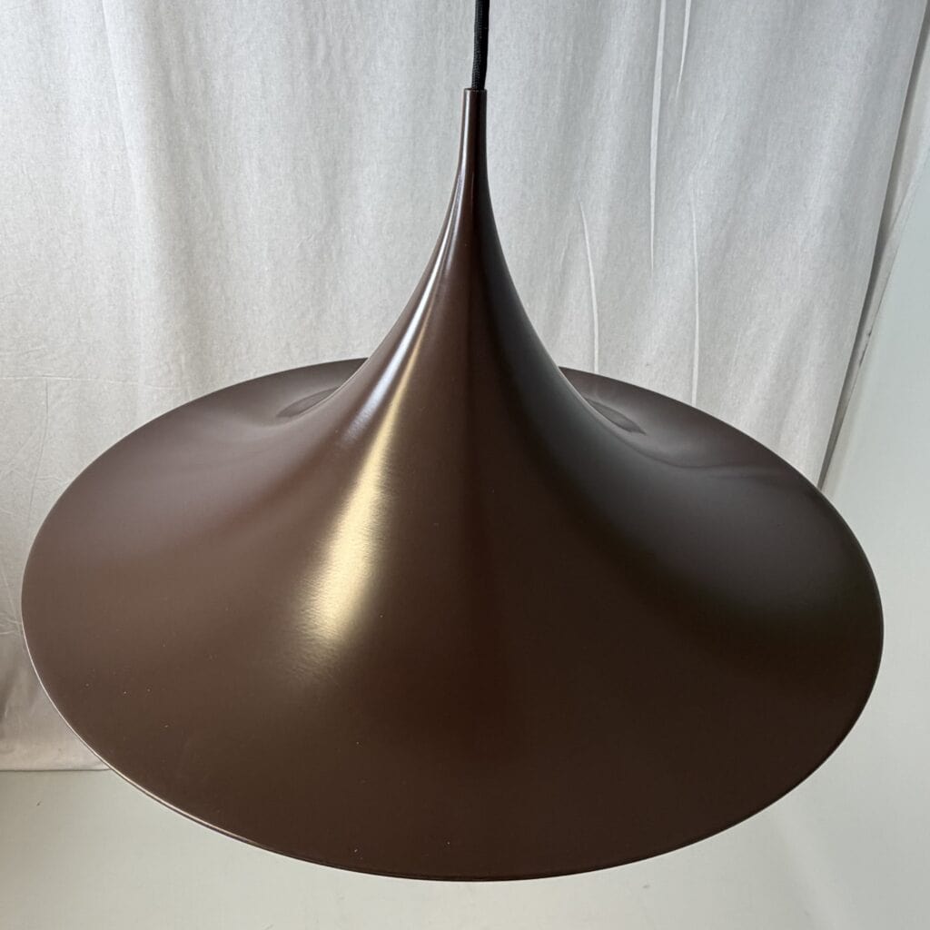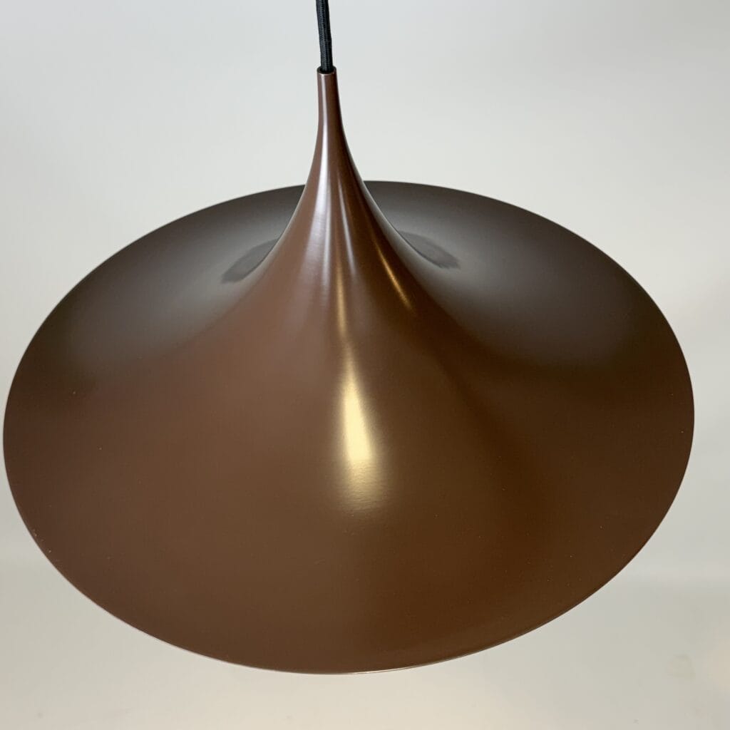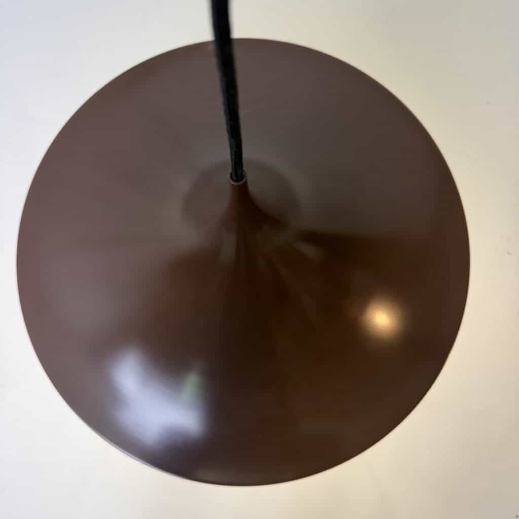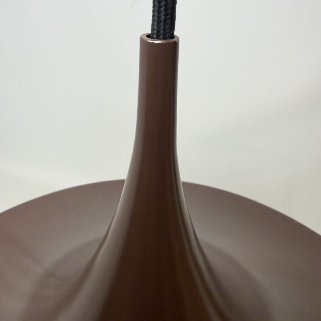 This metal lamp with has a lacquered brown exterior and white interior for optimal light reflection It has a cord for hanging it to the ceiling