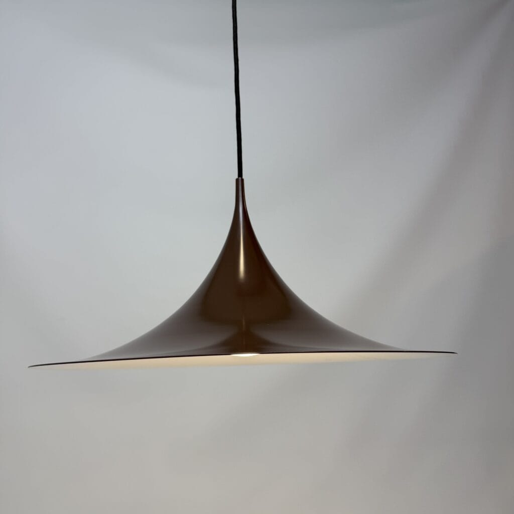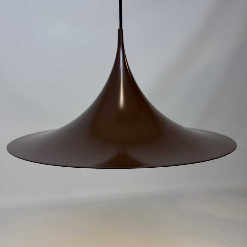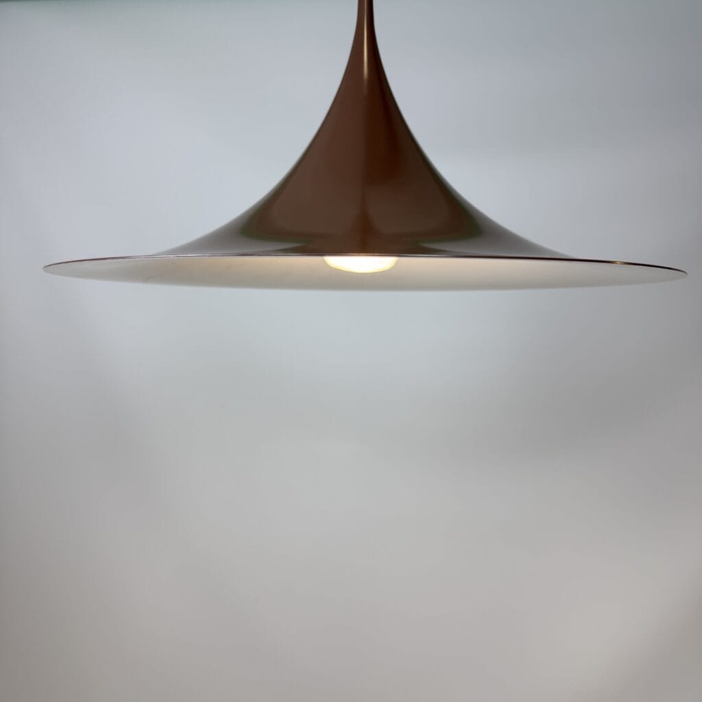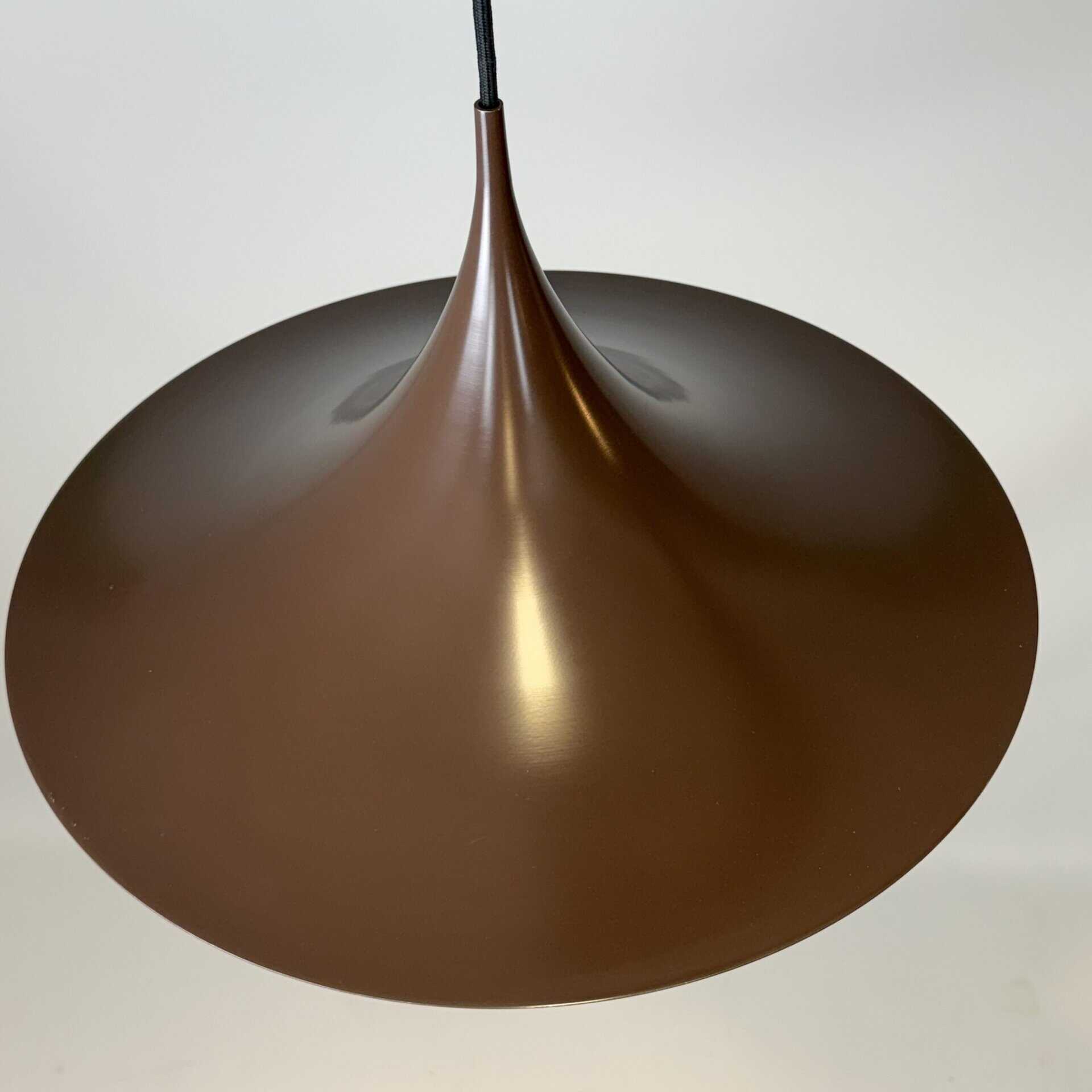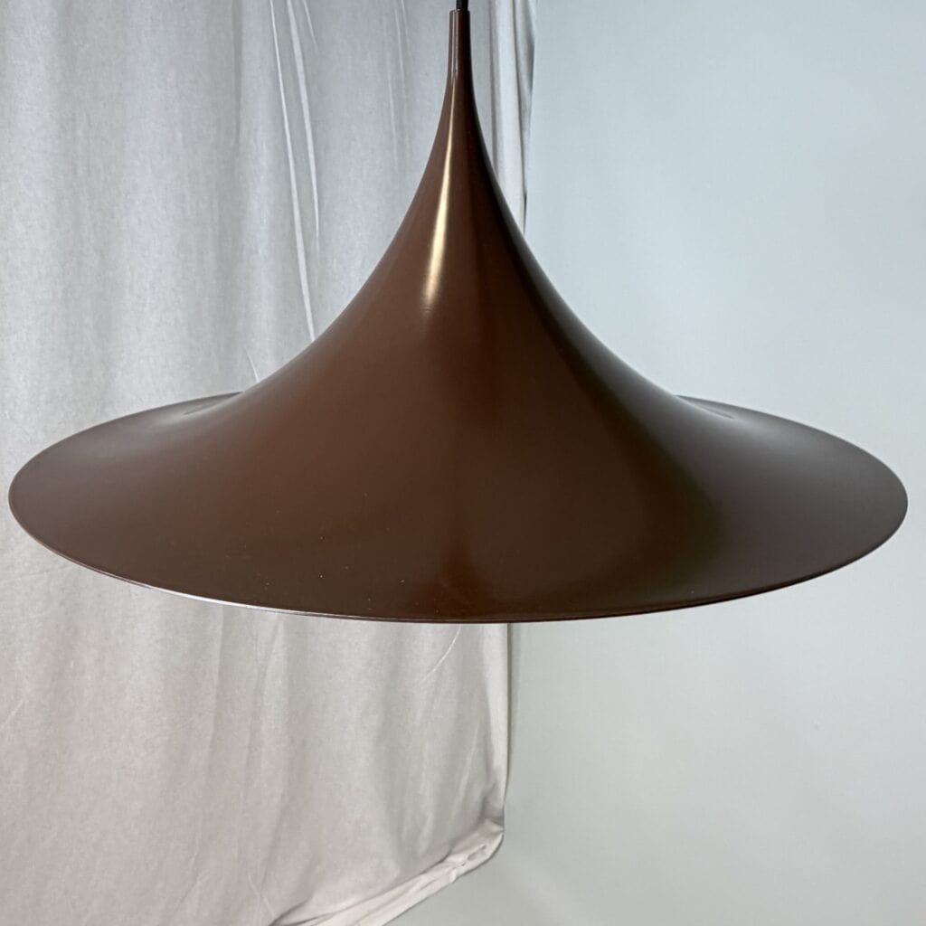 This metal lamp with has a lacquered brown exterior and white interior for optimal light reflection It has a cord for hanging it to the ceiling