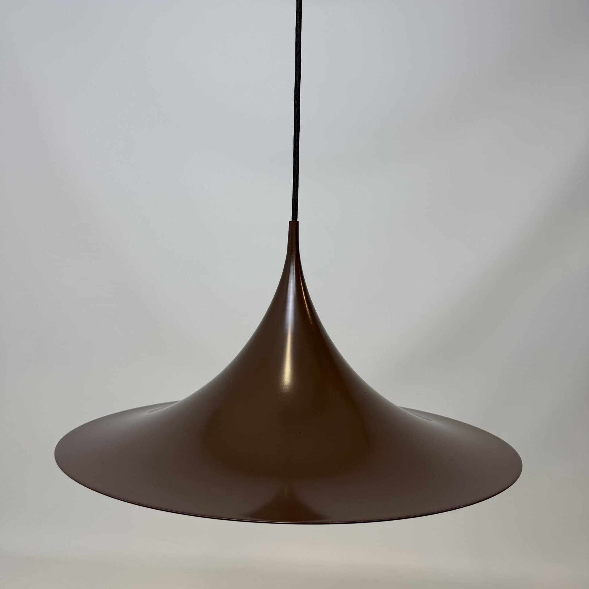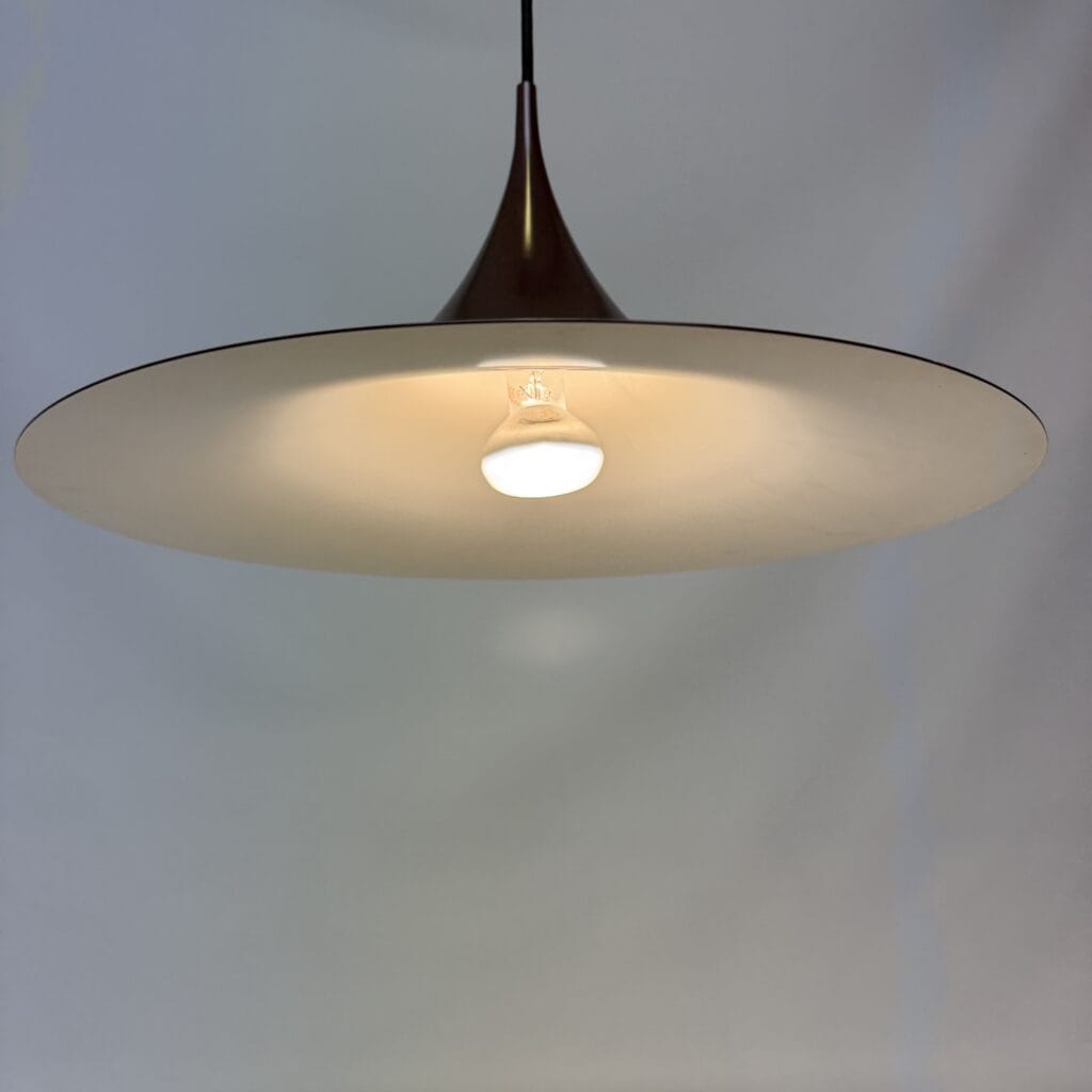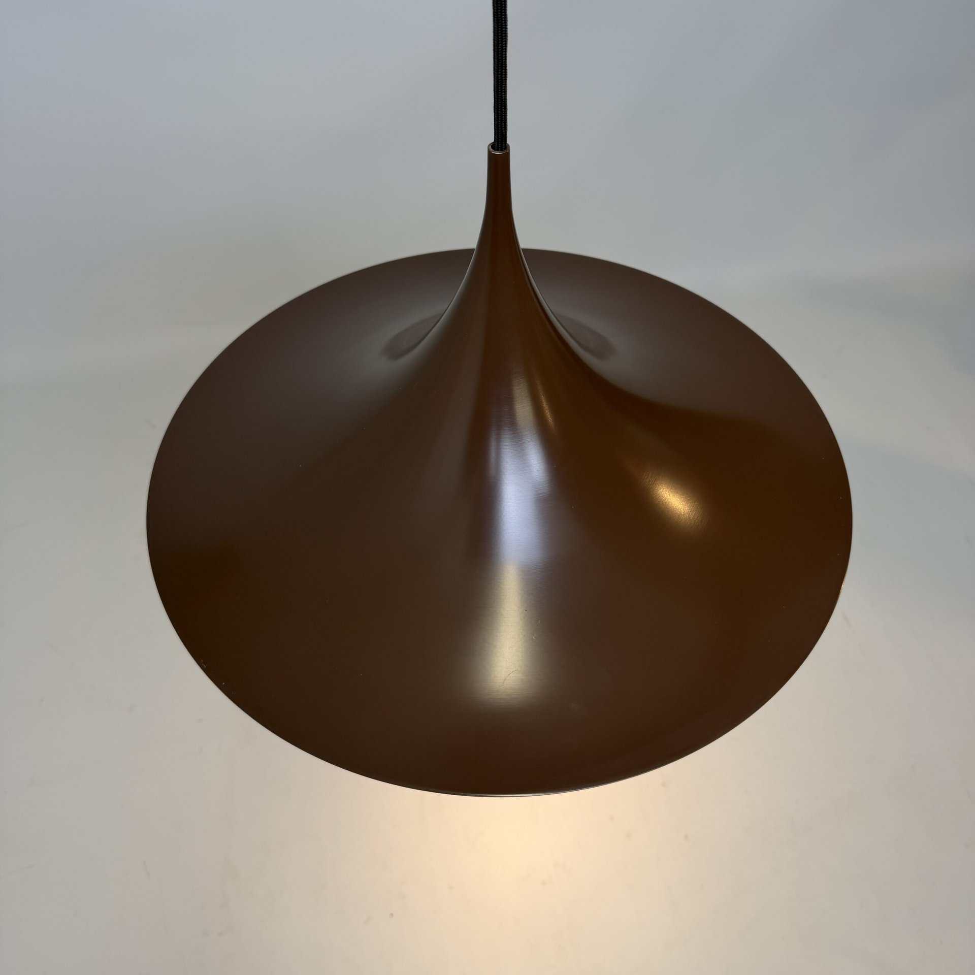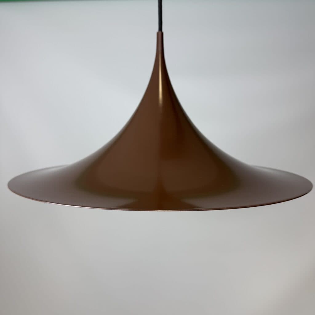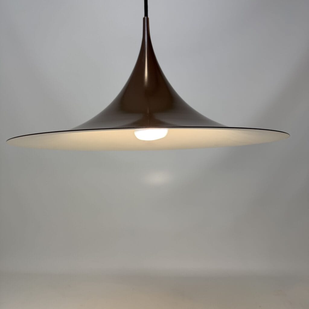 This metal lamp with has a lacquered brown exterior and white interior for optimal light reflection It has a cord for hanging it to the ceiling