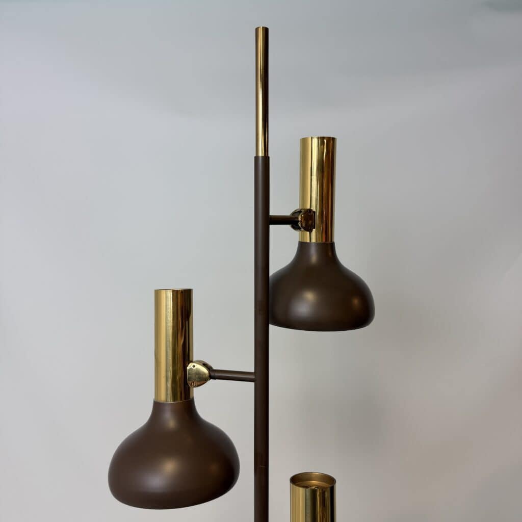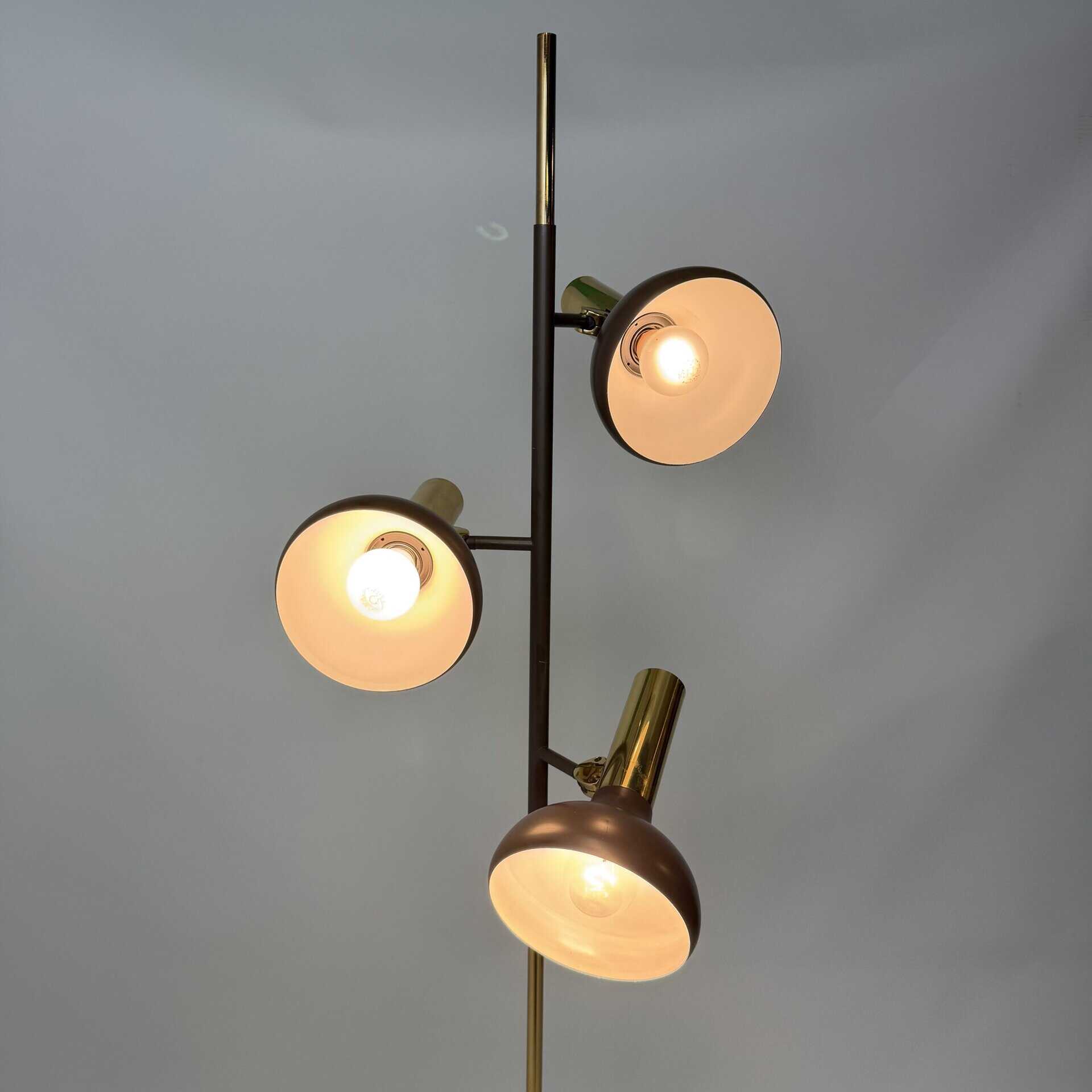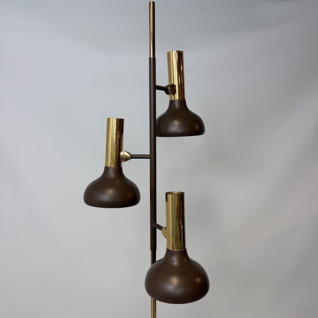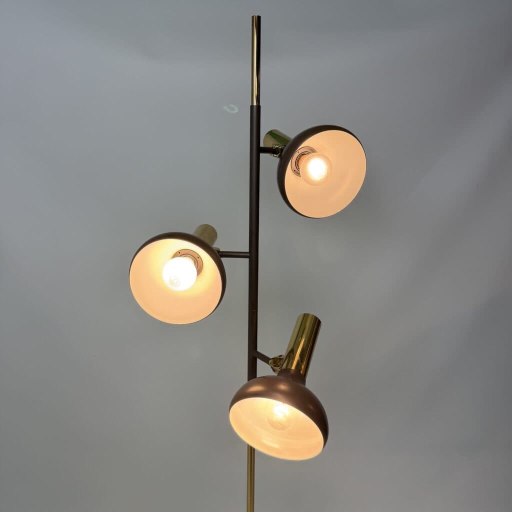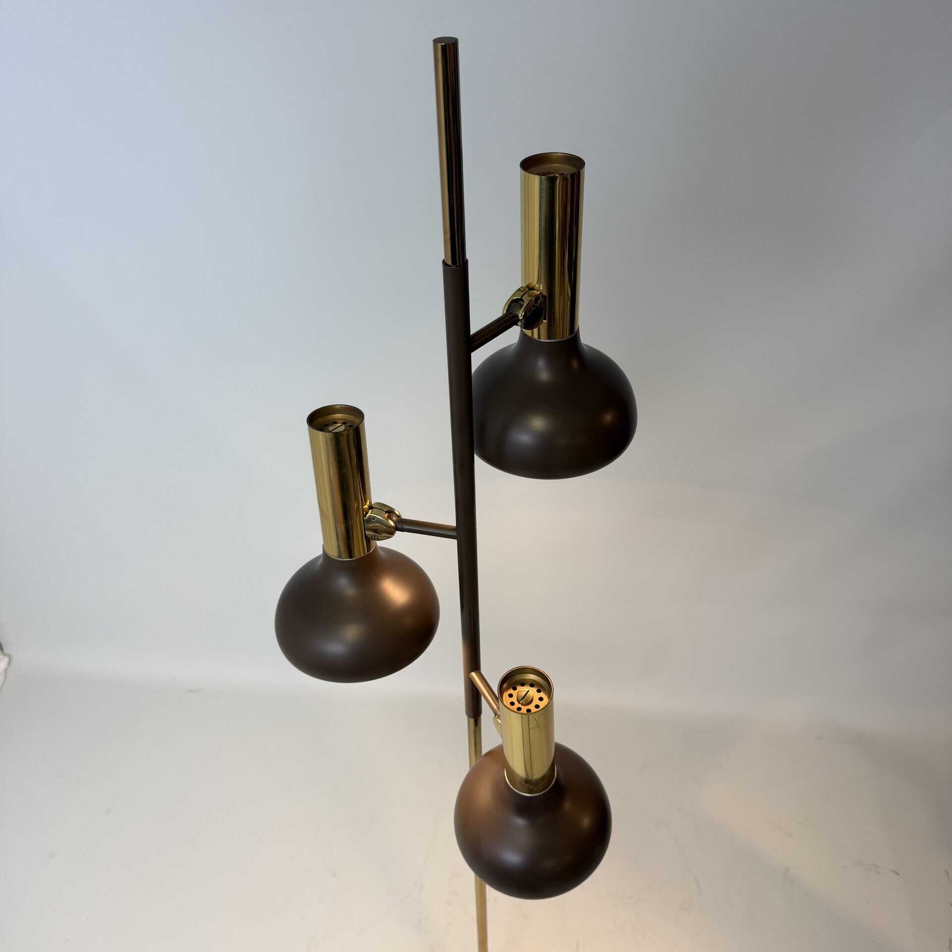Floorlamp with gilded brass and brown lacquered aluminium with 3 spotlights and disc base