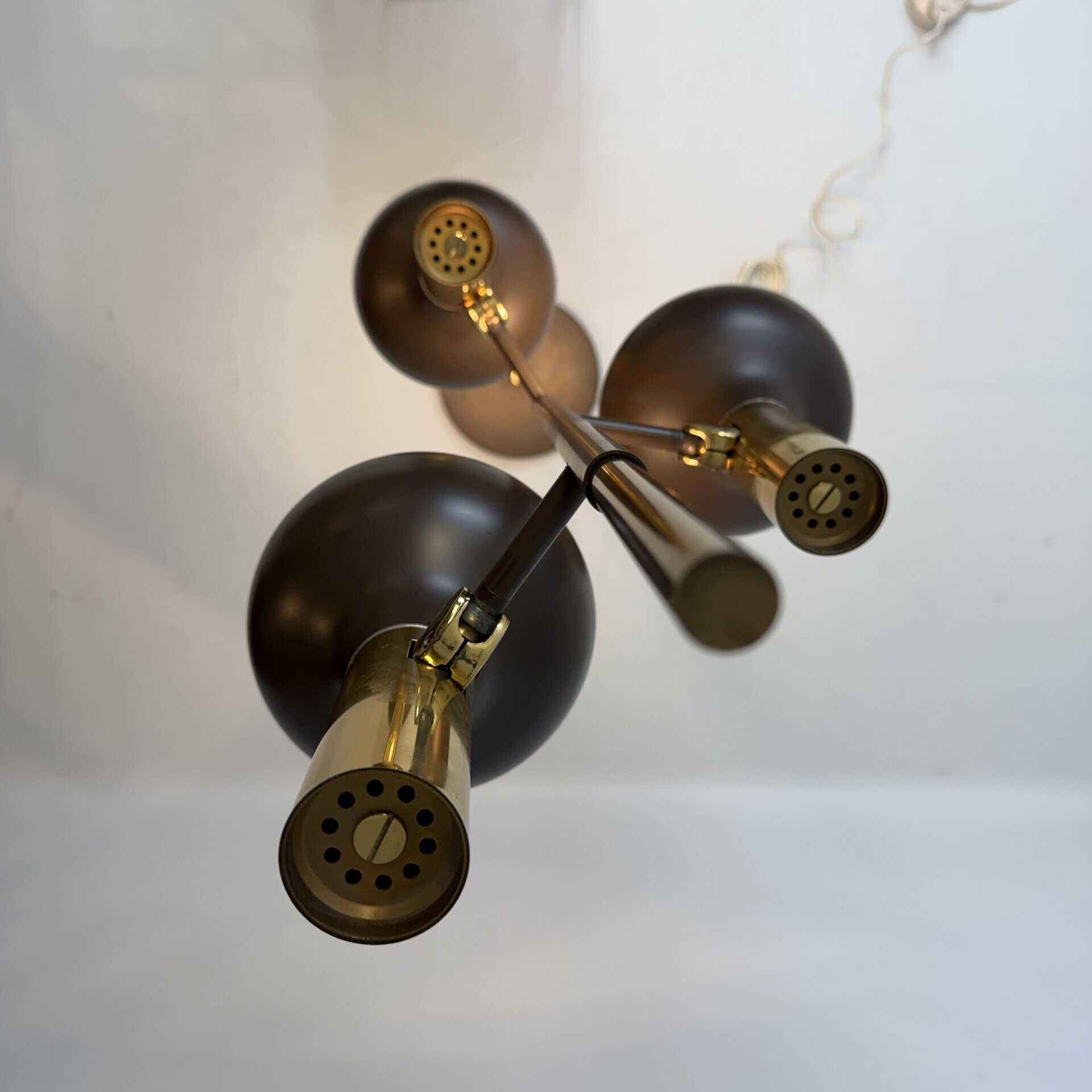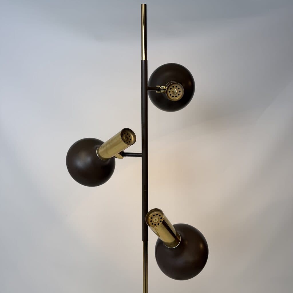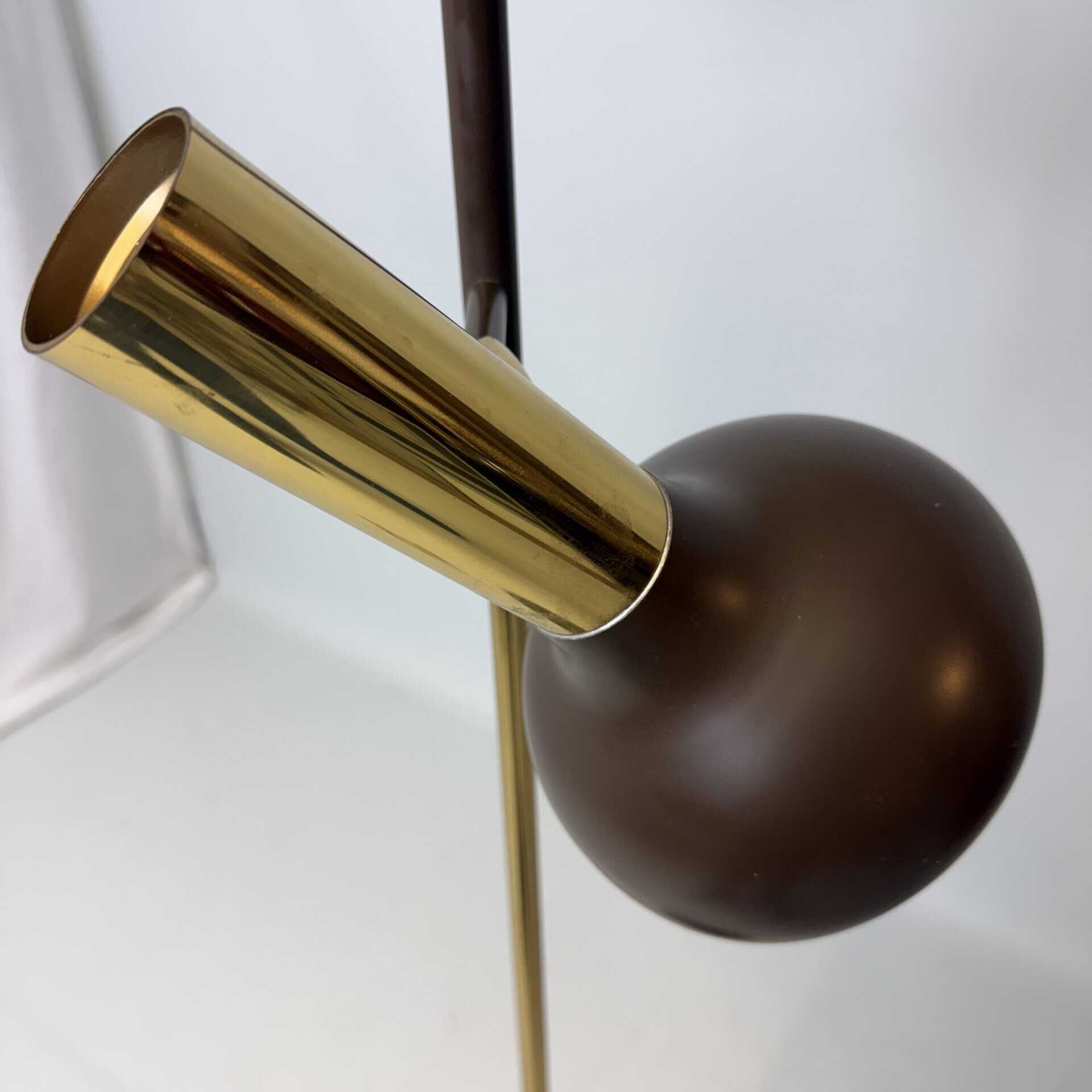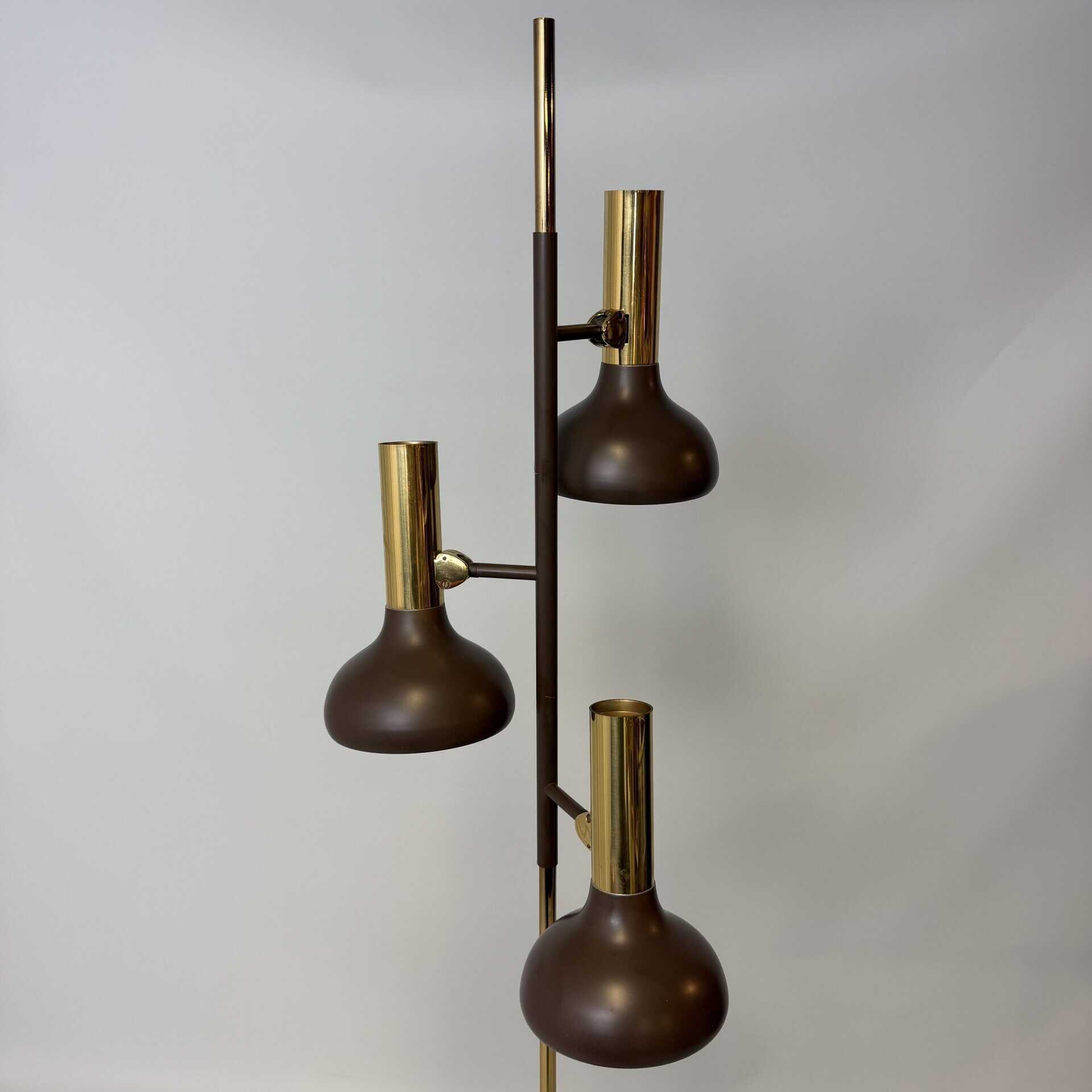 Floorlamp with gilded brass and brown lacquered aluminium with 3 spotlights and disc base