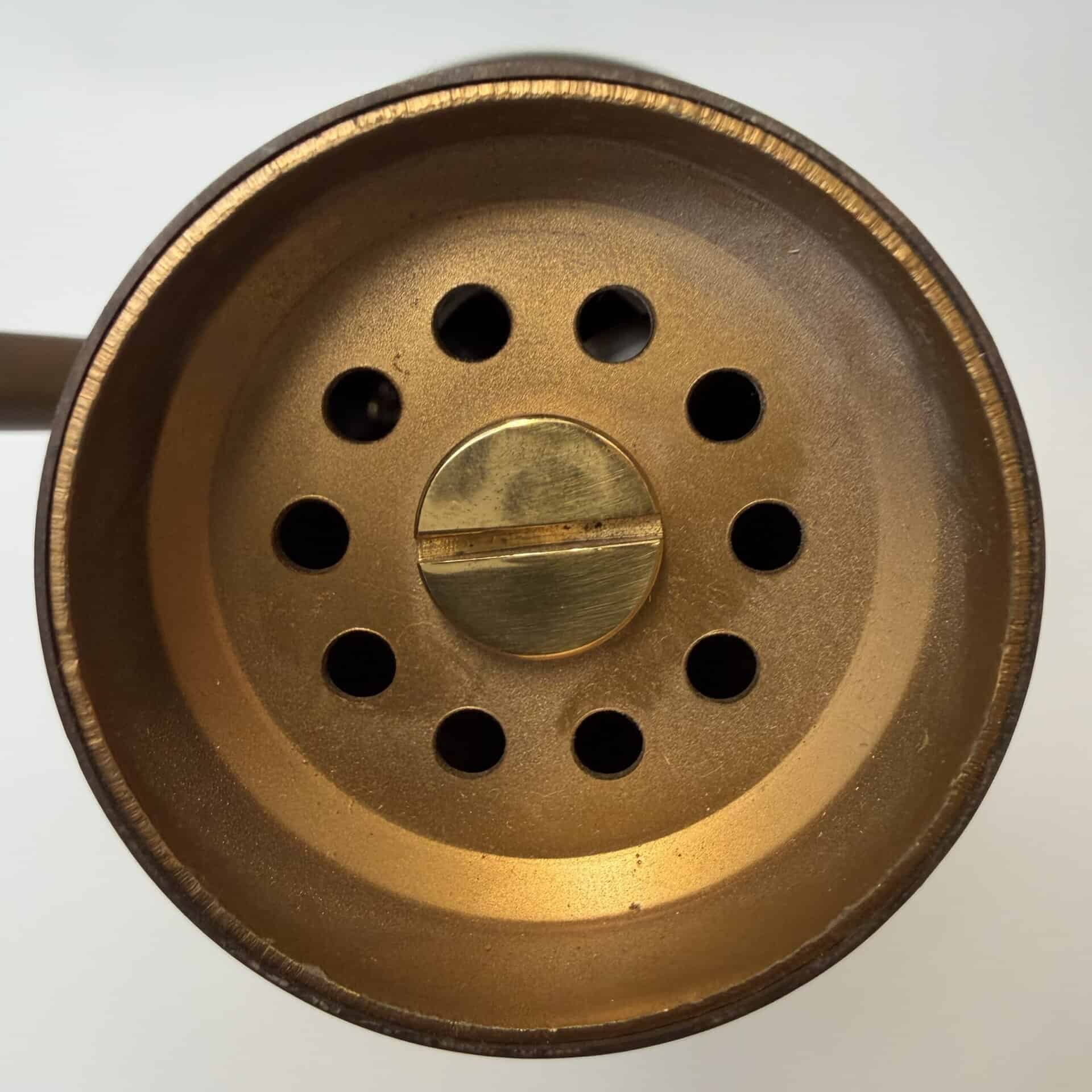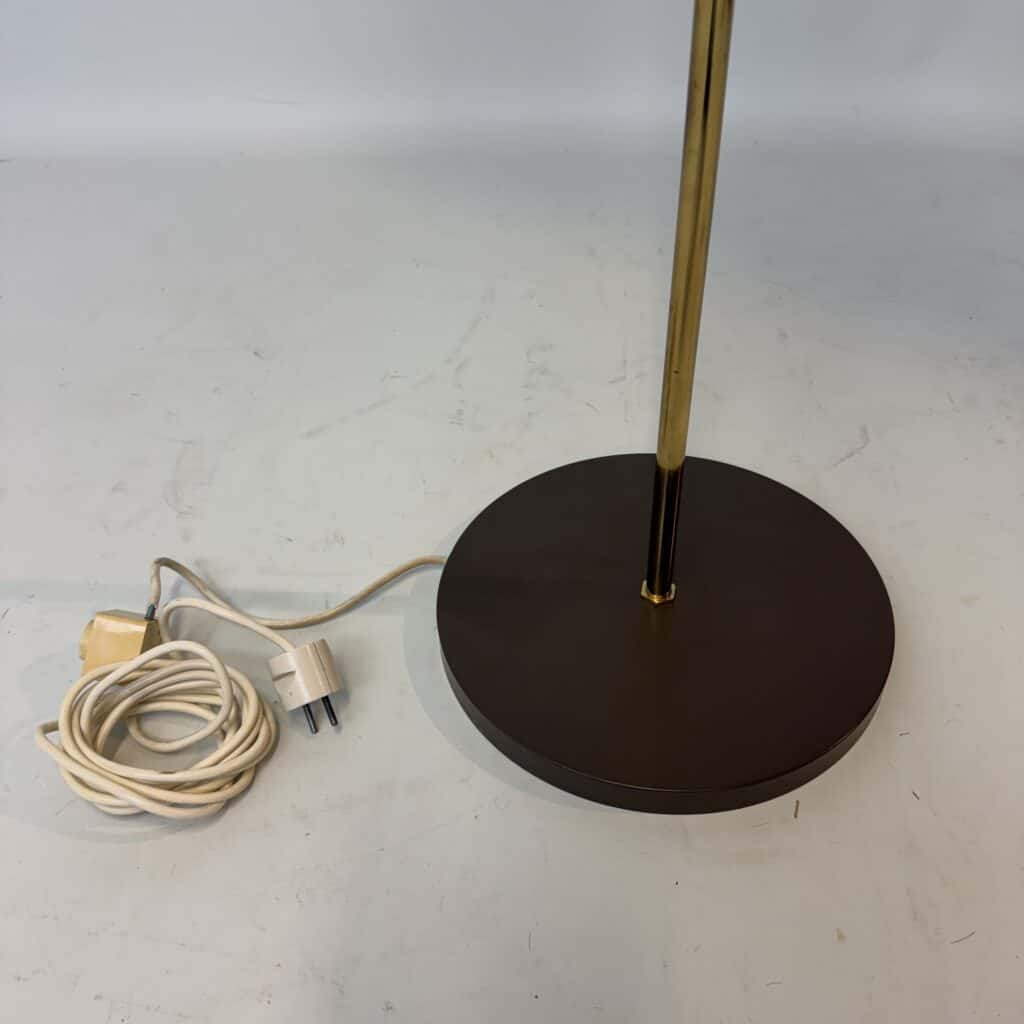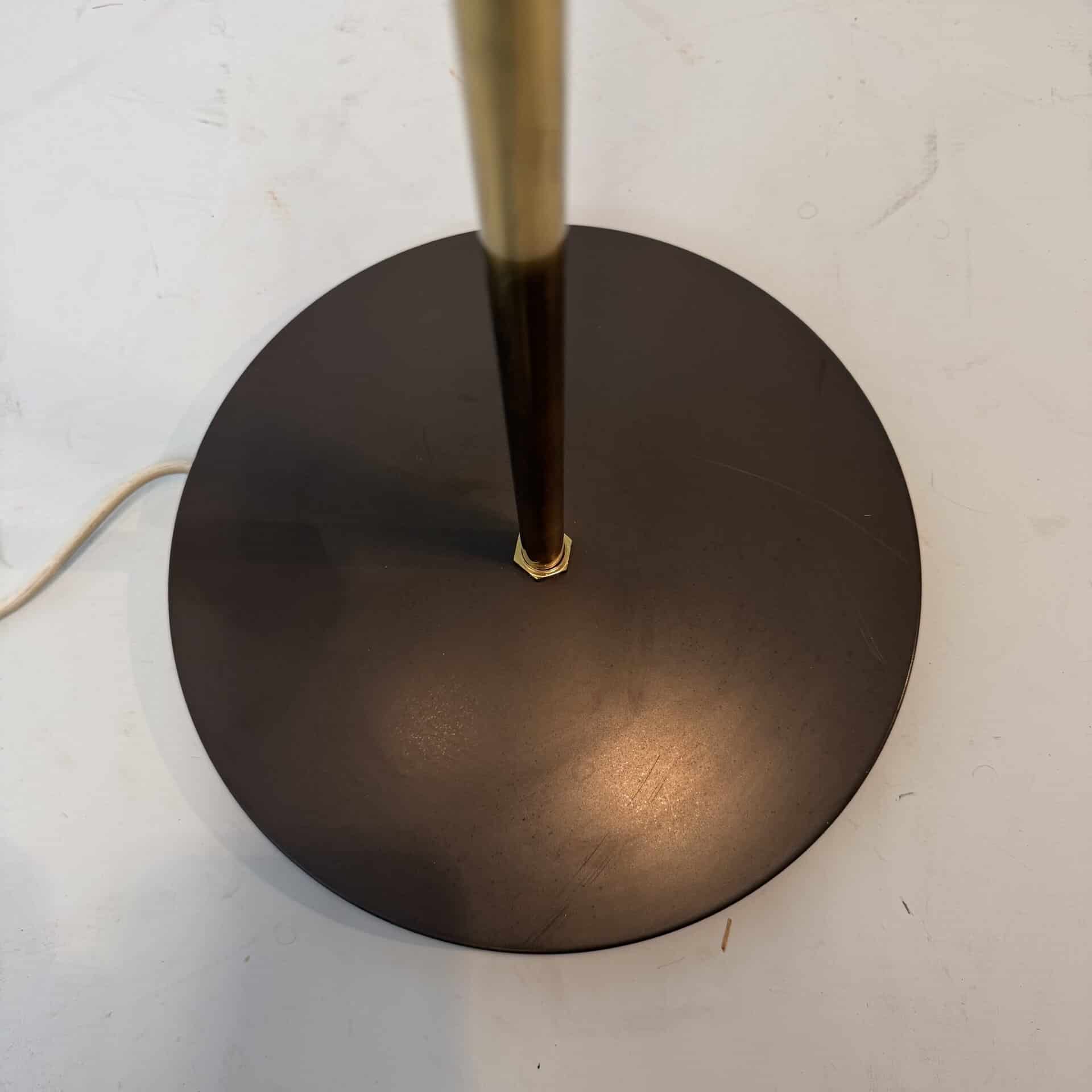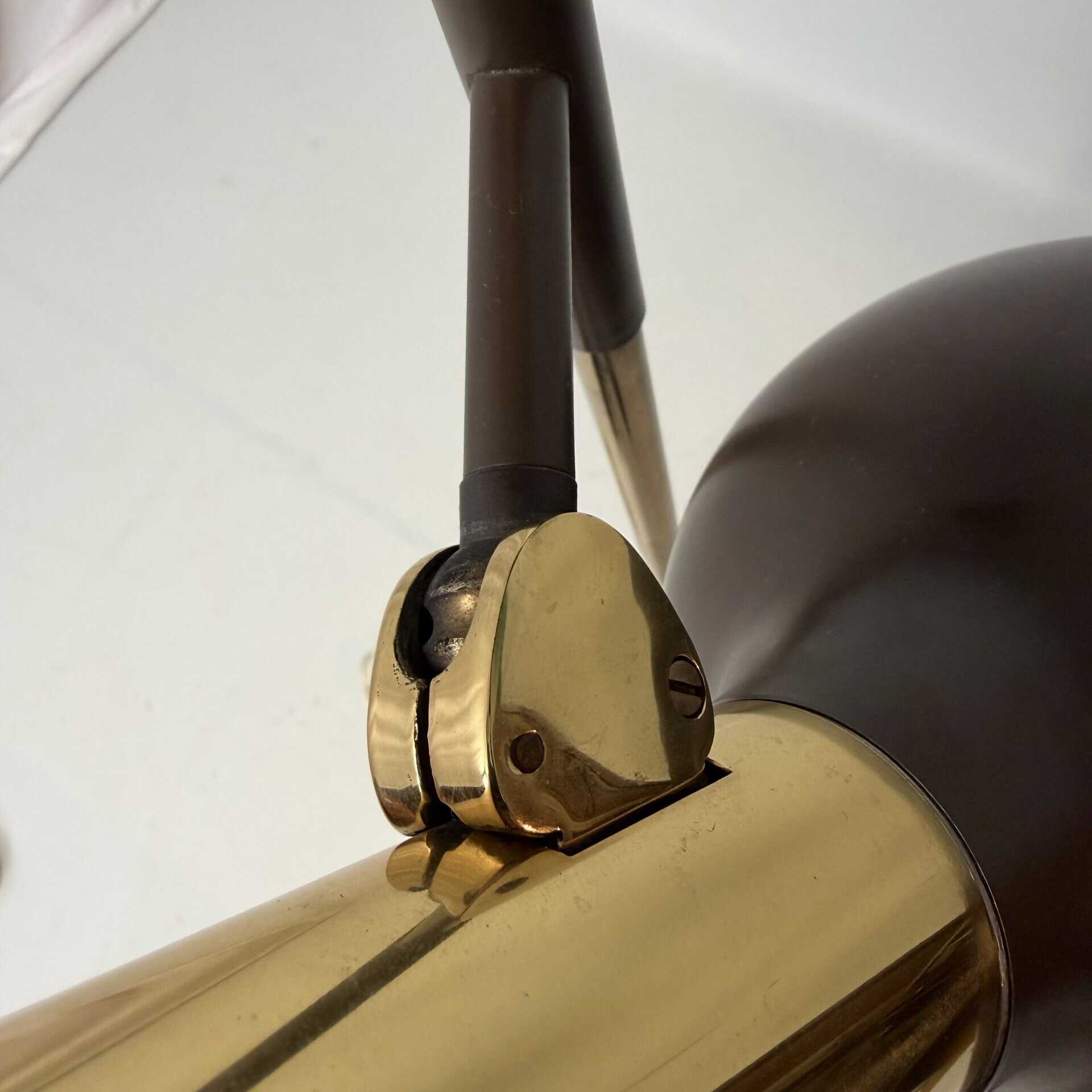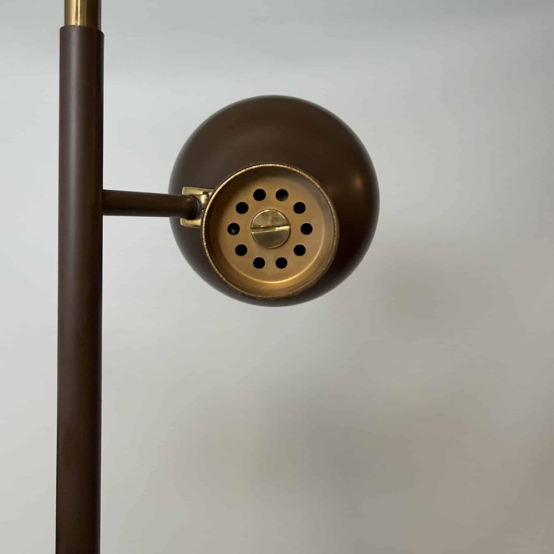 Floorlamp with gilded brass and brown lacquered aluminium with 3 spotlights and disc base