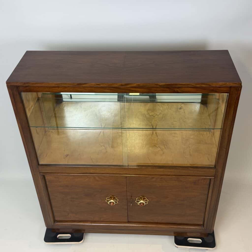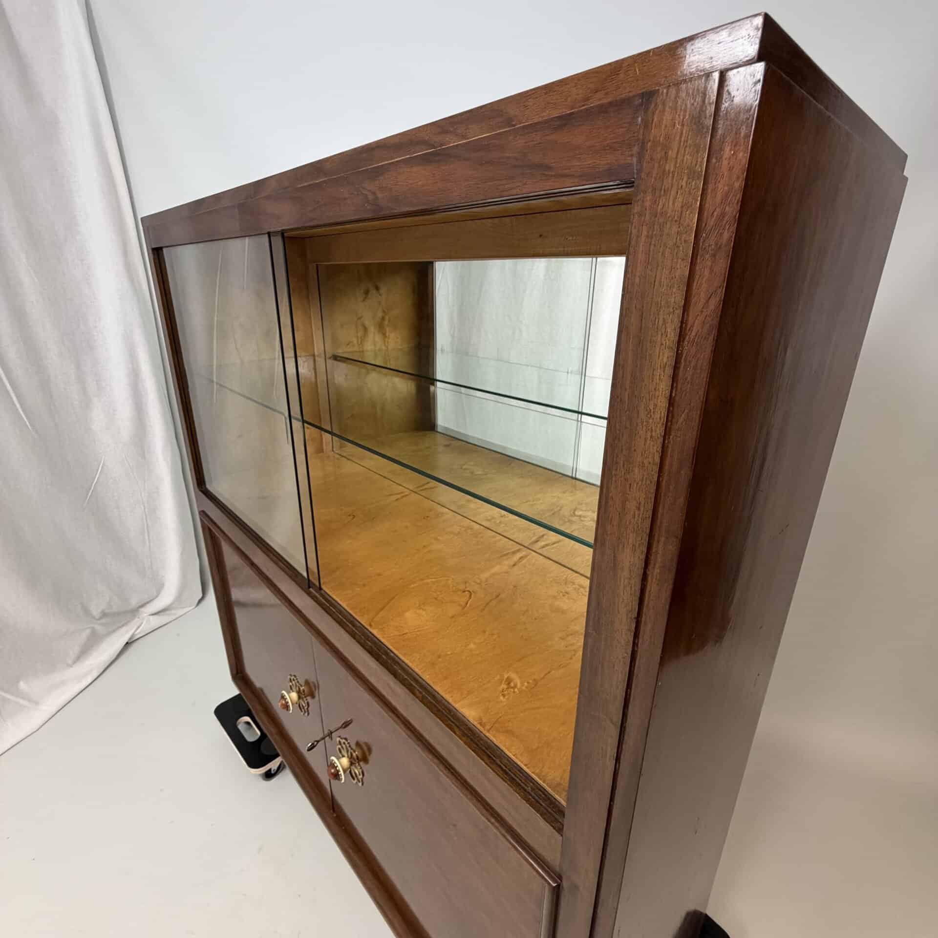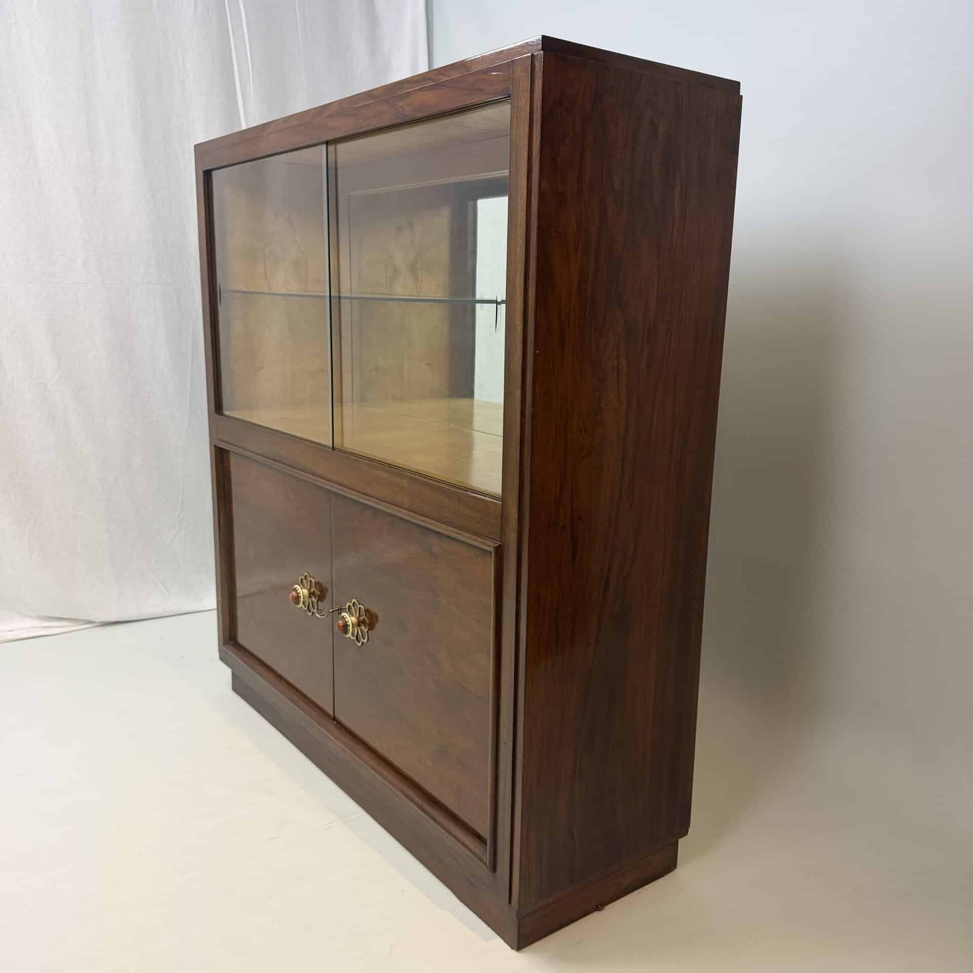 The cabinet consists of two parts: a glass upper section with sliding glass doors and a closed lower section with wooden doors and brass flower-shaped handles