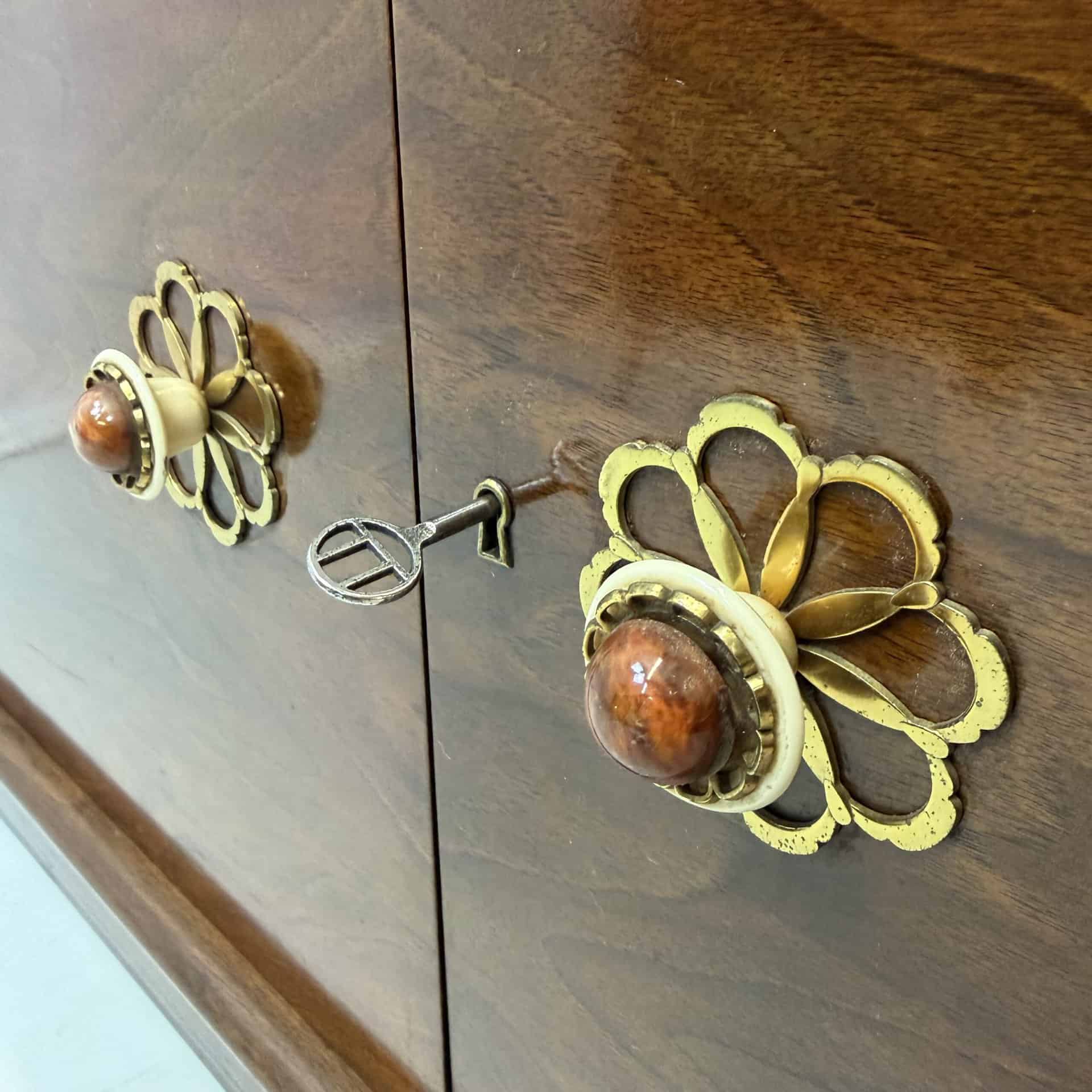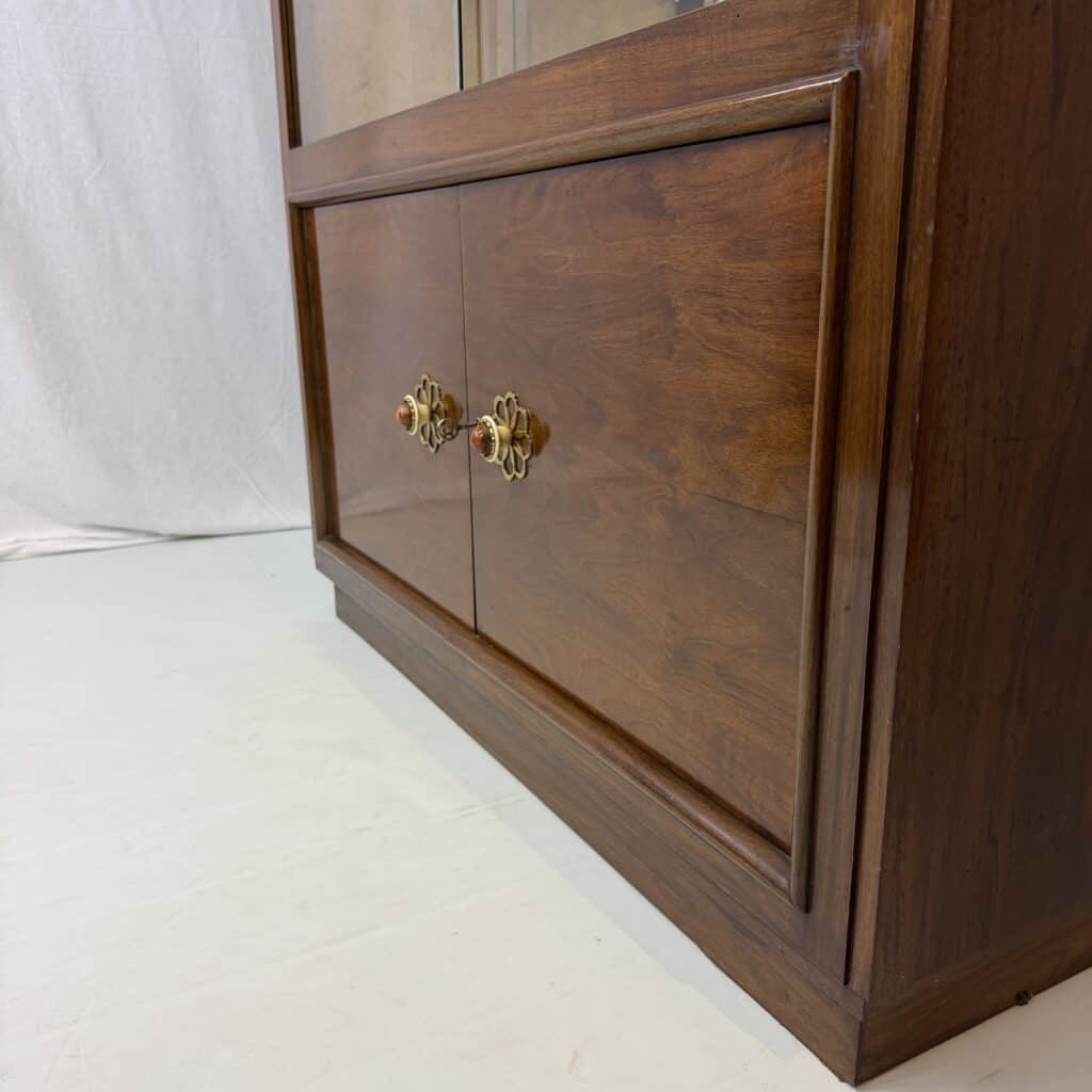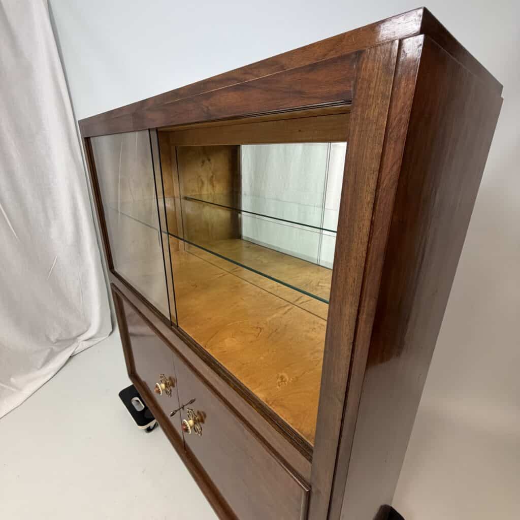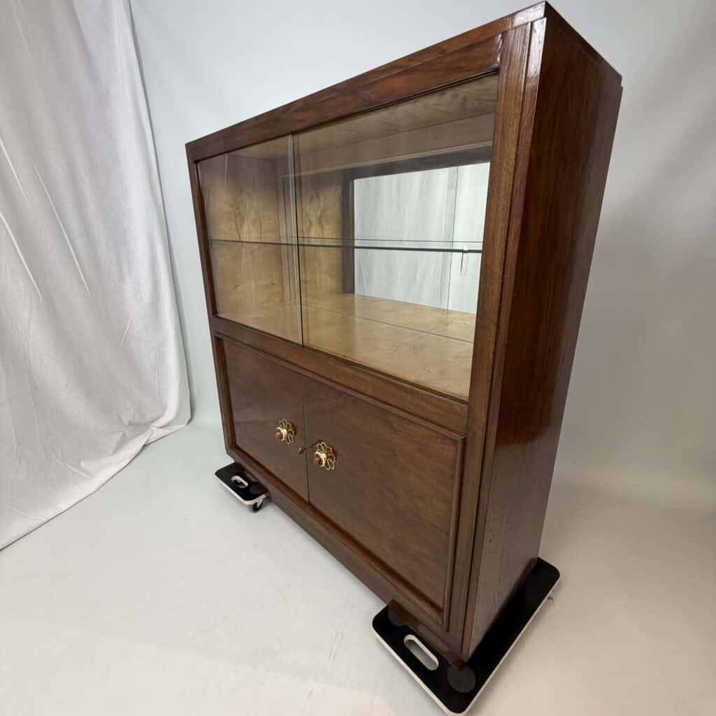 The cabinet consists of two parts: a glass upper section with sliding glass doors and a closed lower section with wooden doors and brass flower-shaped handles