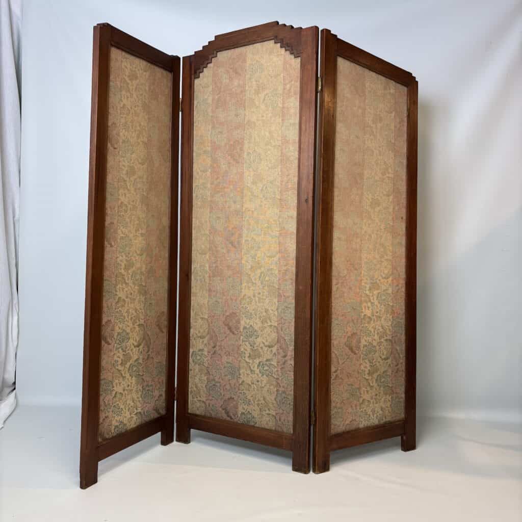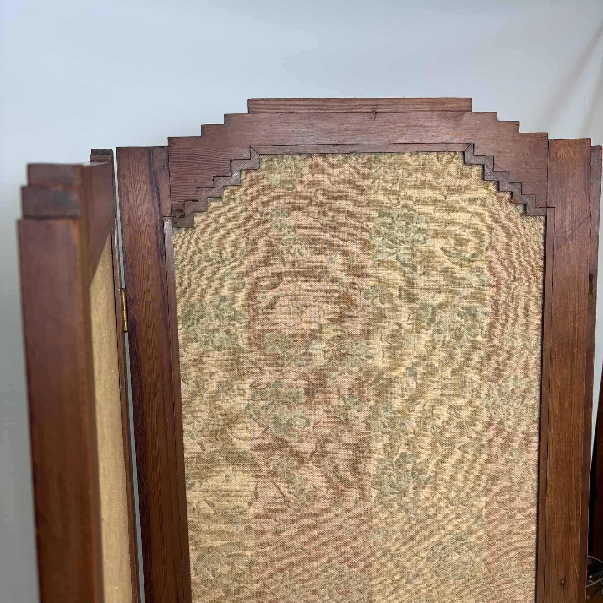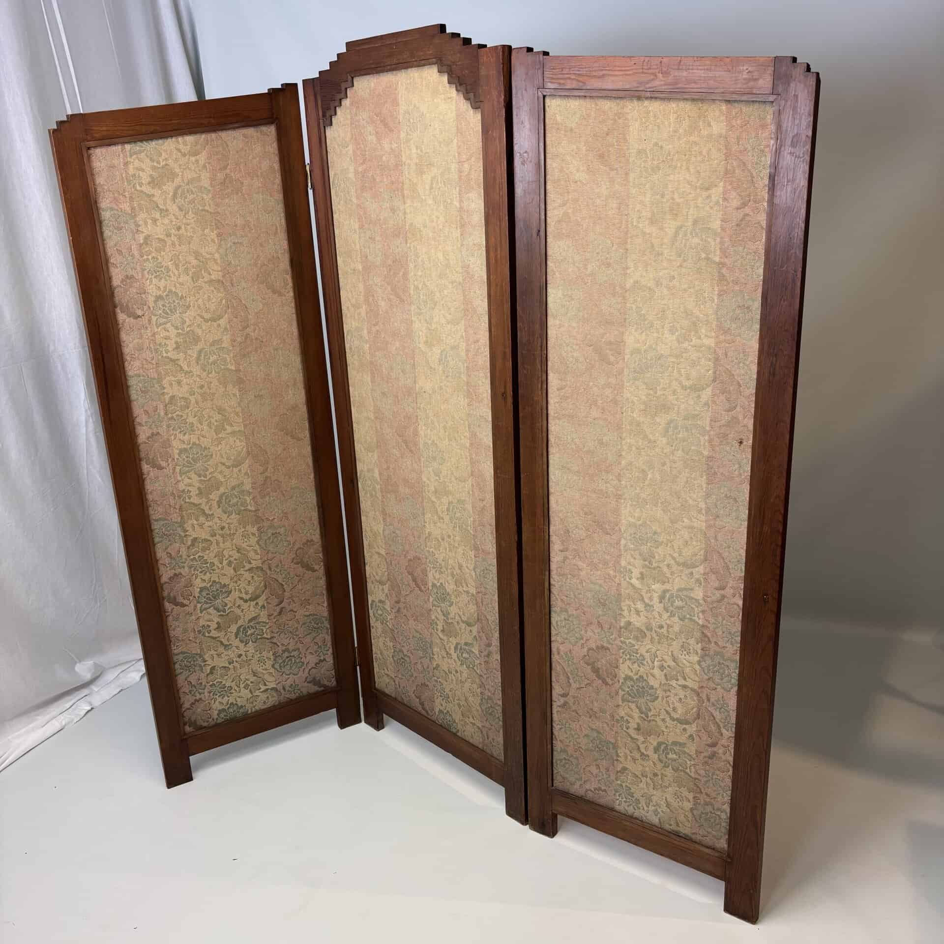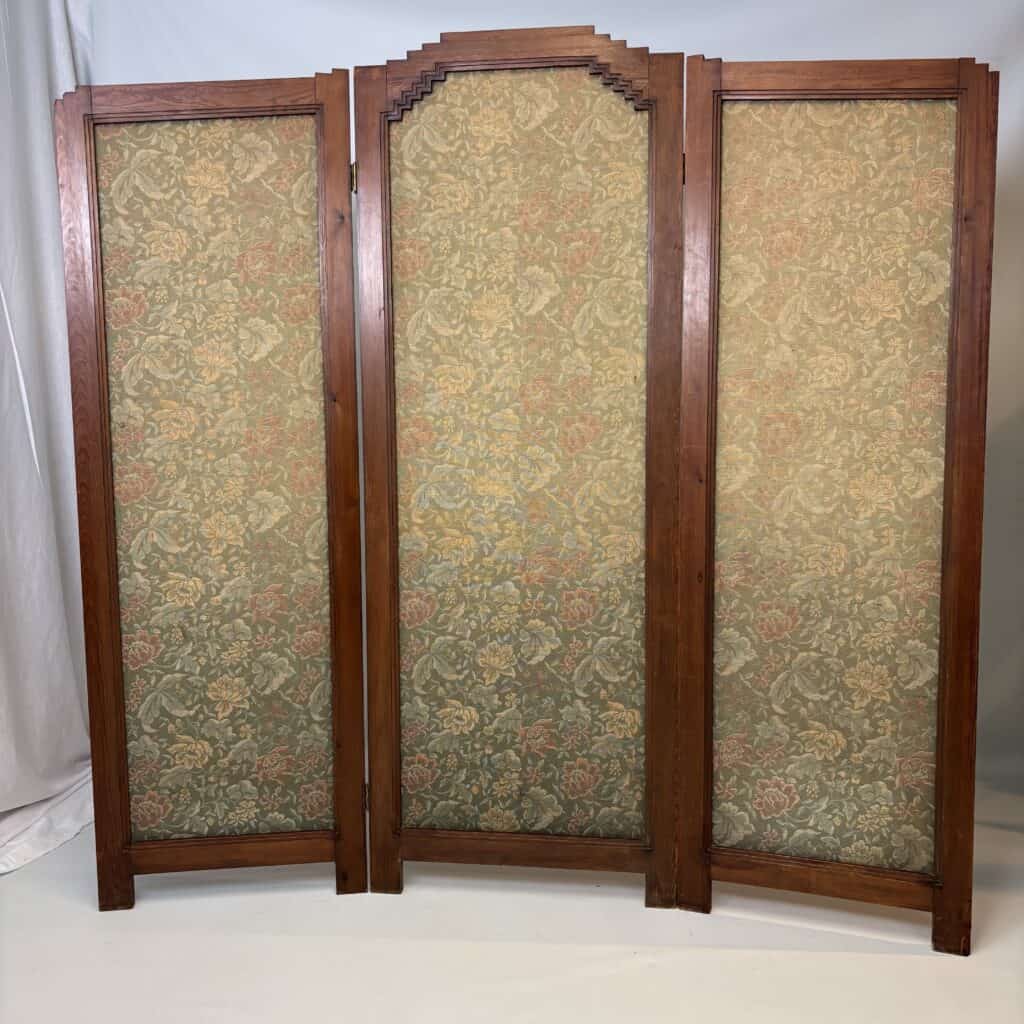 The screen consists of three hinged panels, each framed in wood with the decorative textile