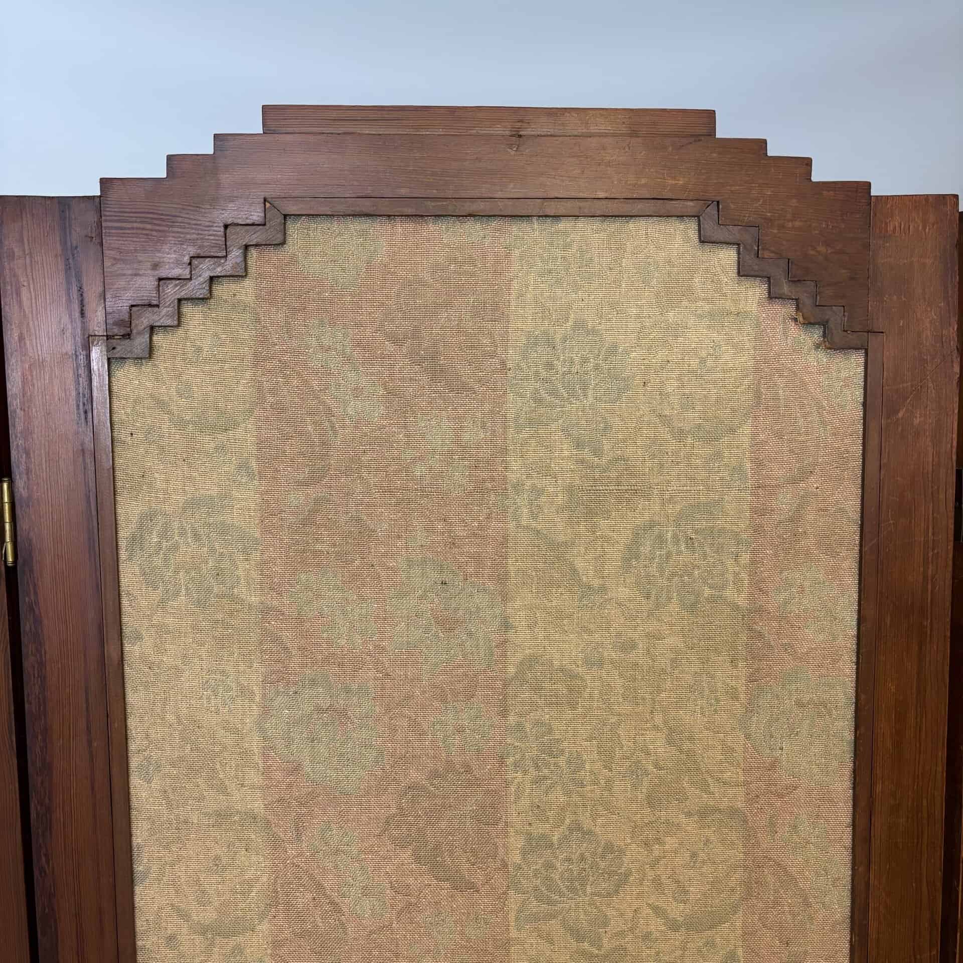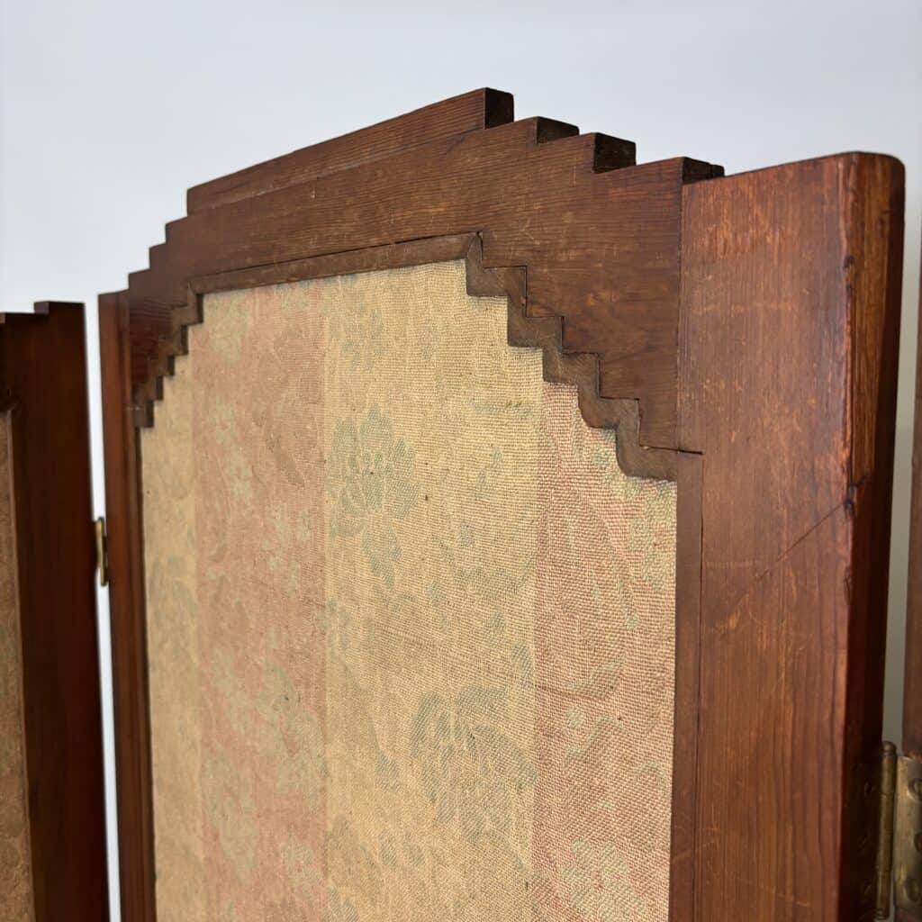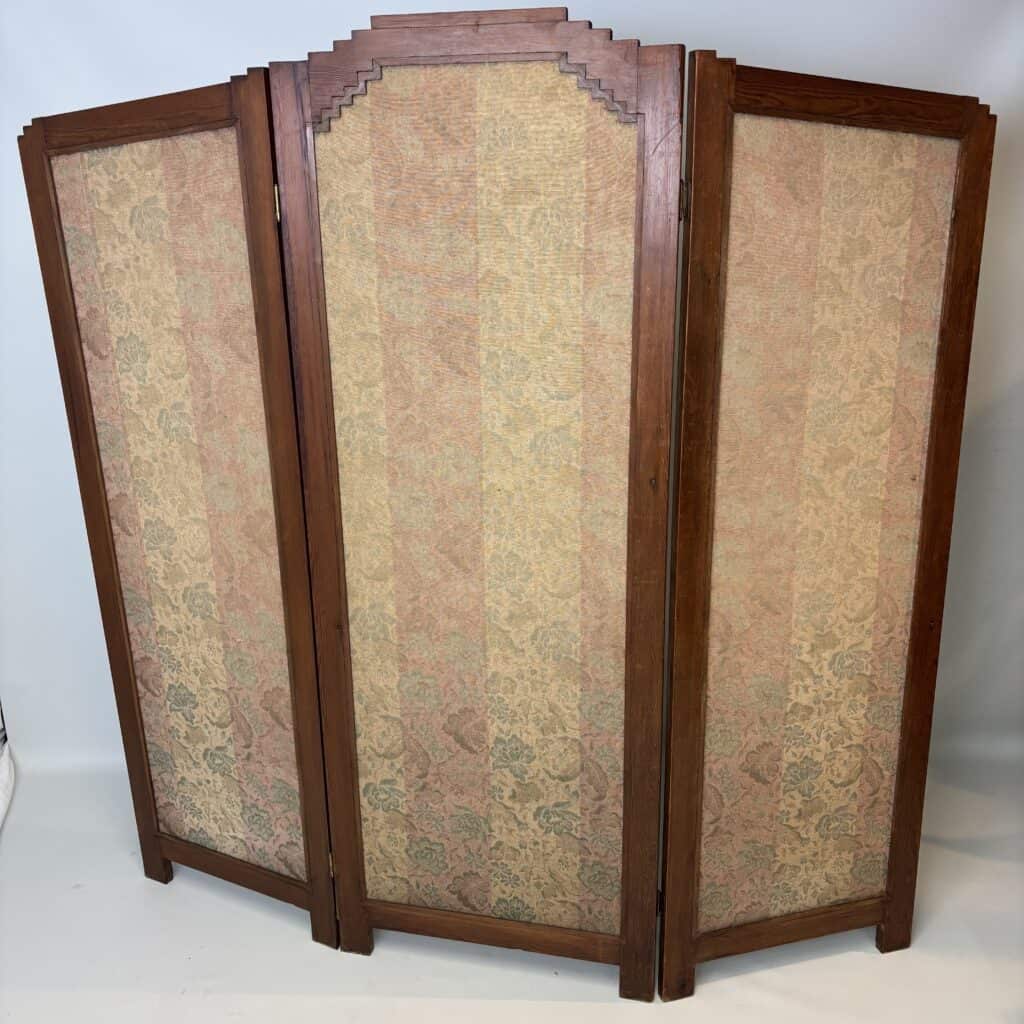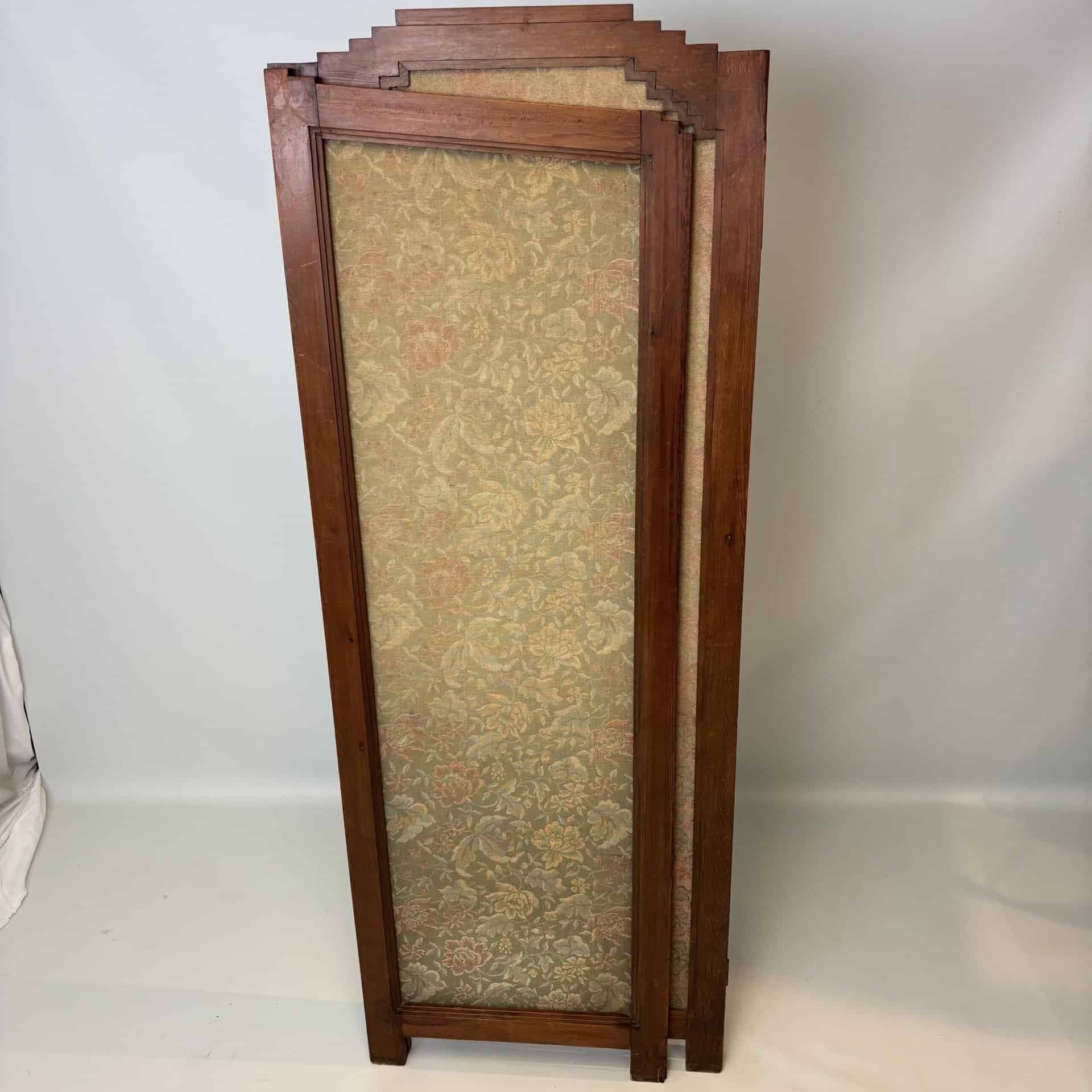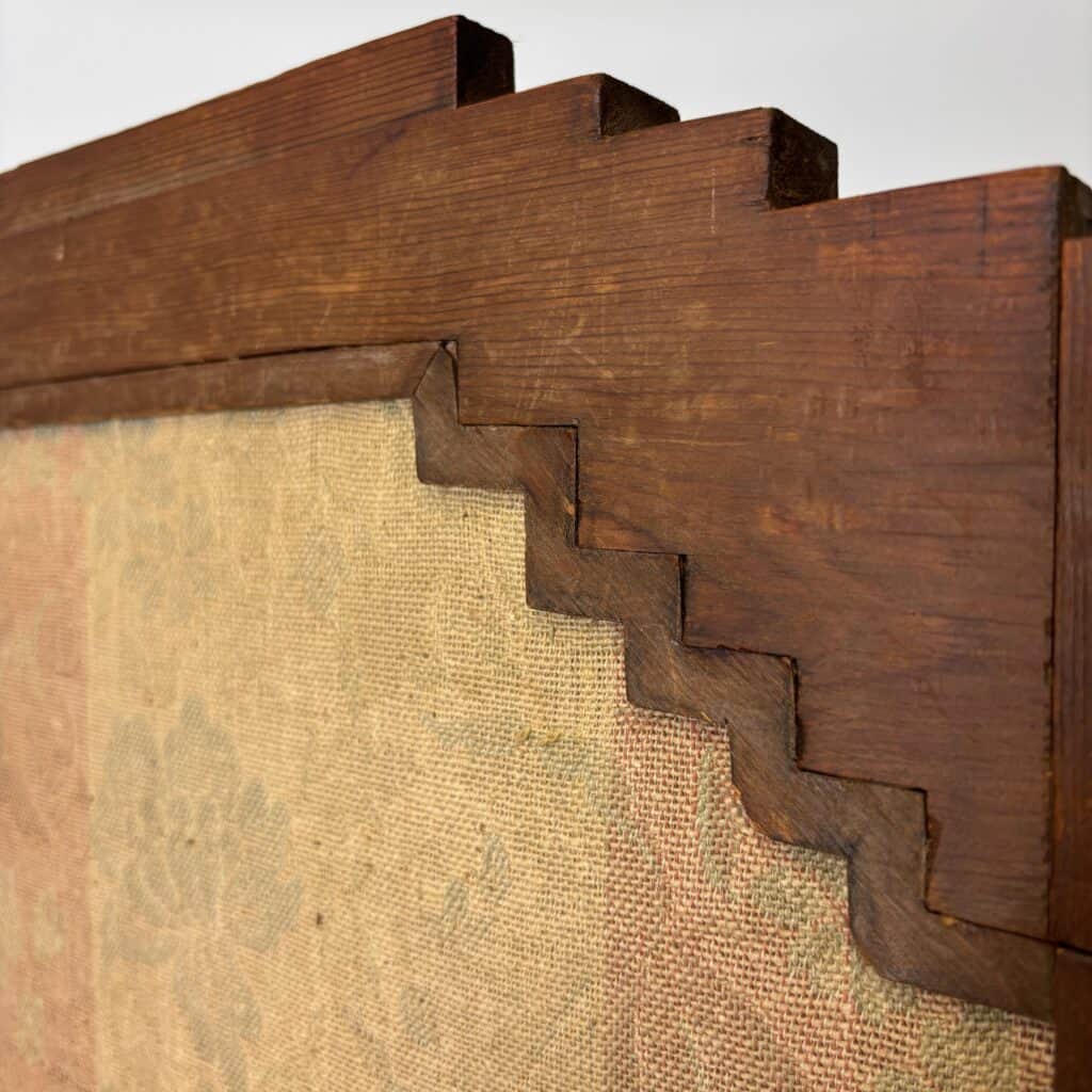 The screen consists of three hinged panels, each framed in wood with the decorative textile