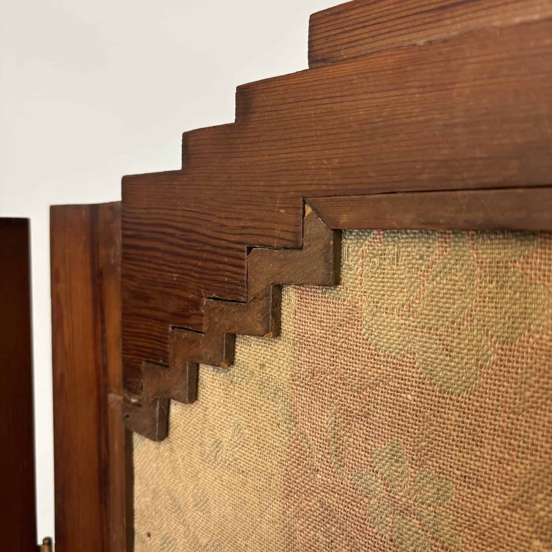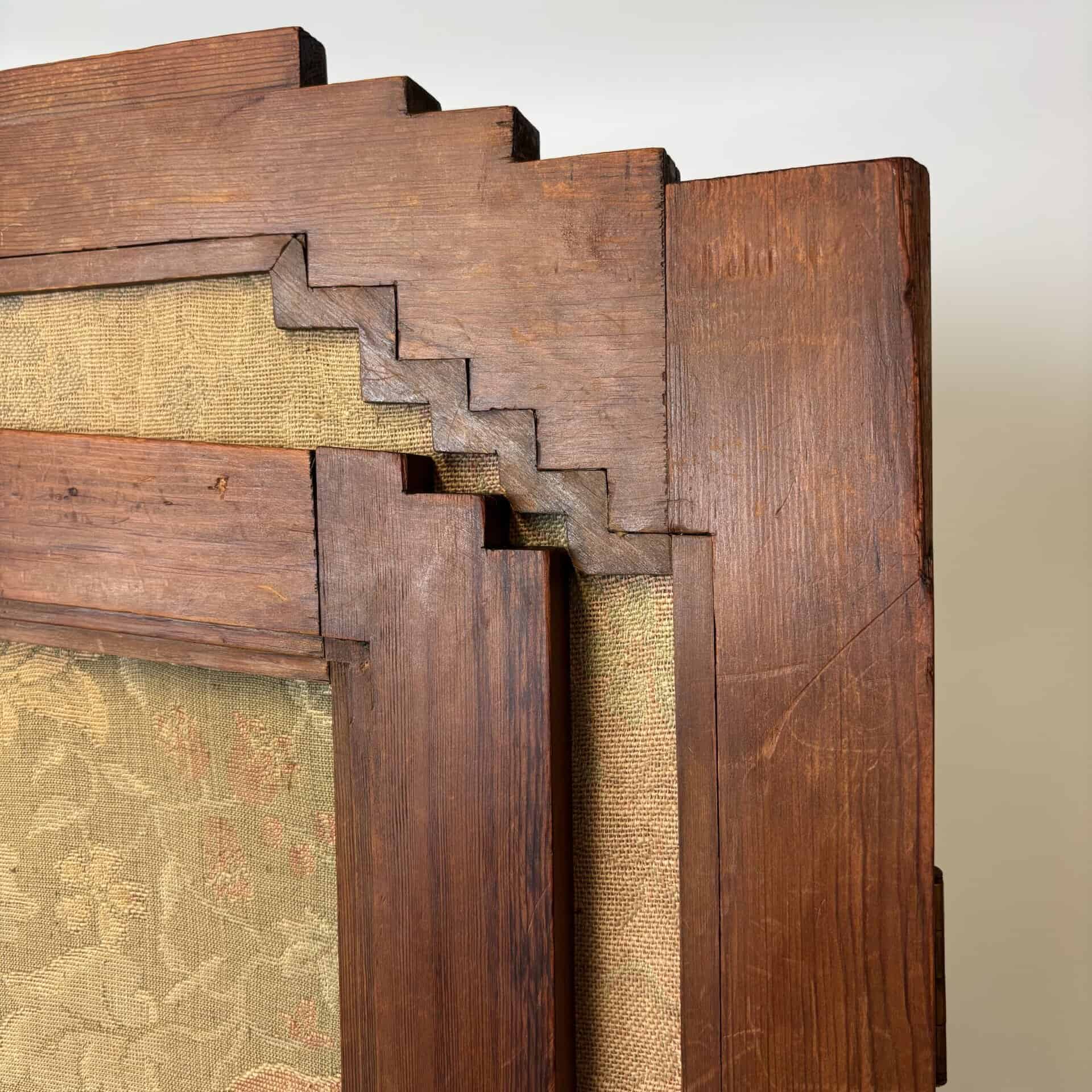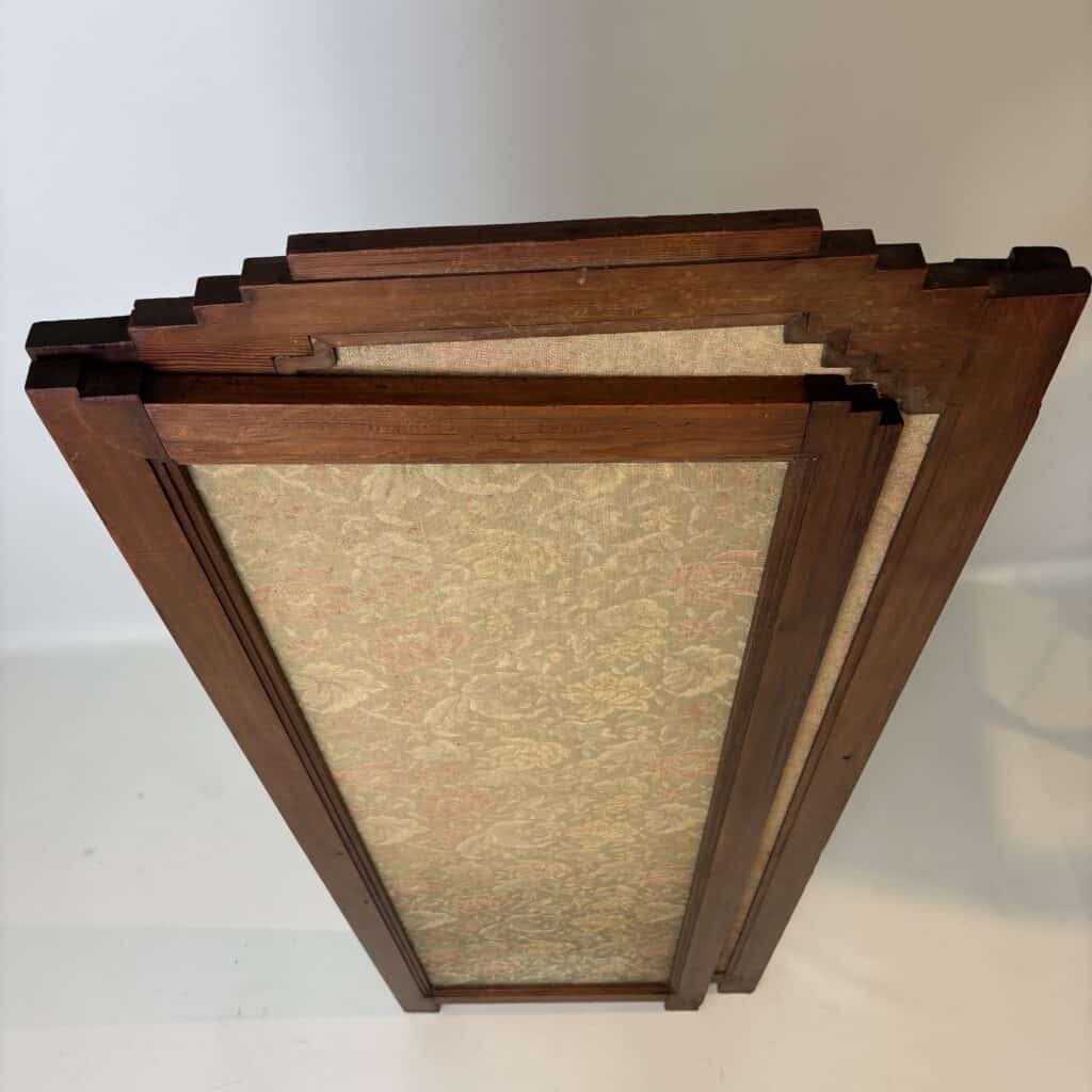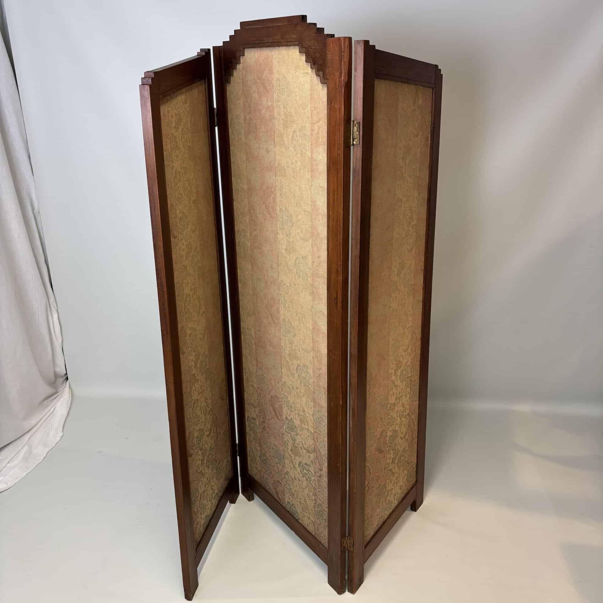 The screen consists of three hinged panels, each framed in wood with the decorative textile