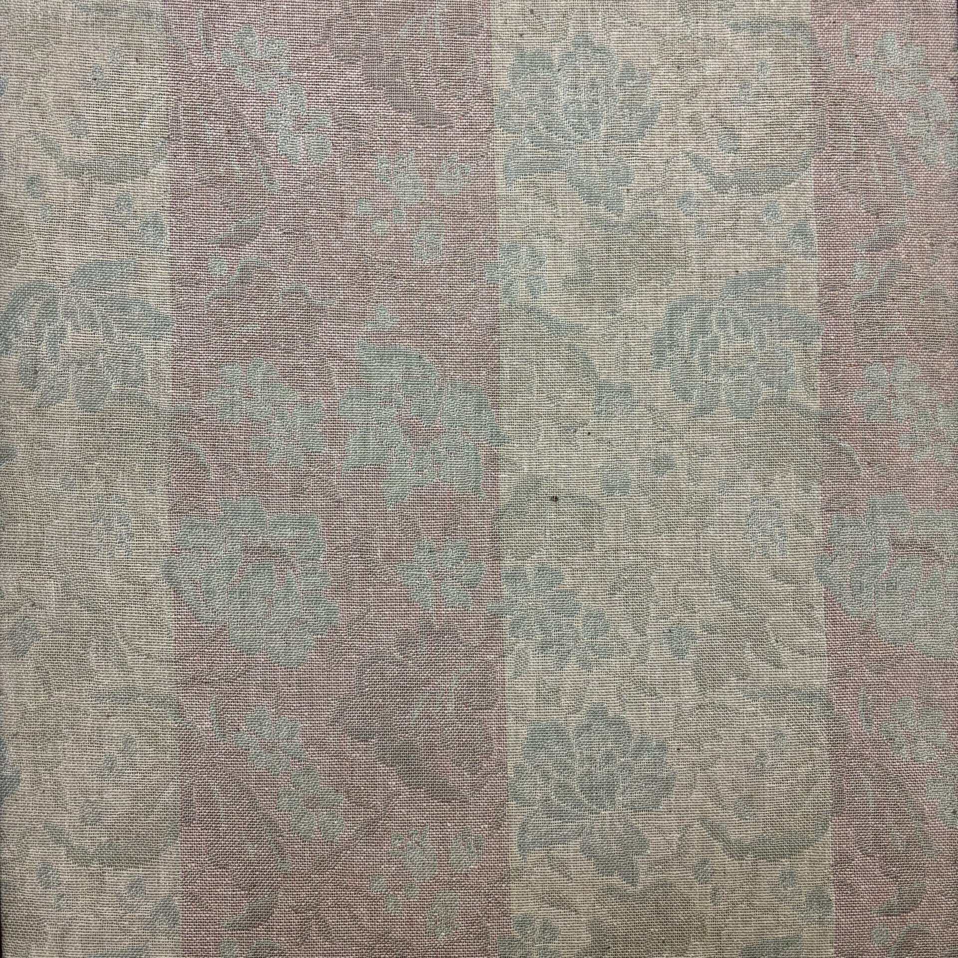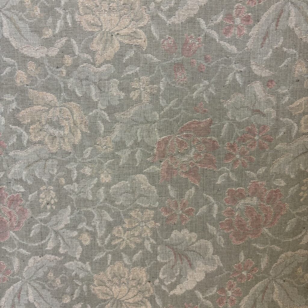 The textile feature a floral damask or brocade pattern with muted tones of green, gold, and rose. The front and back panel have another motif