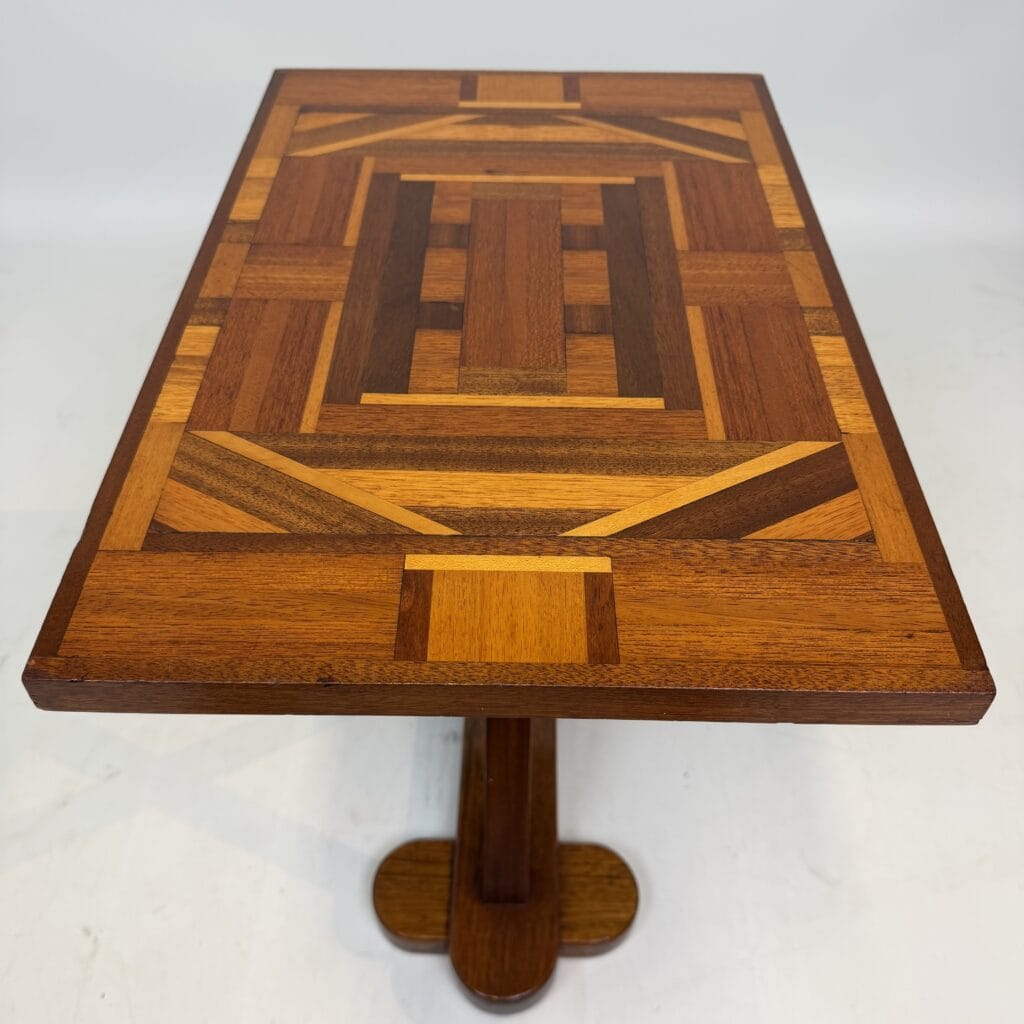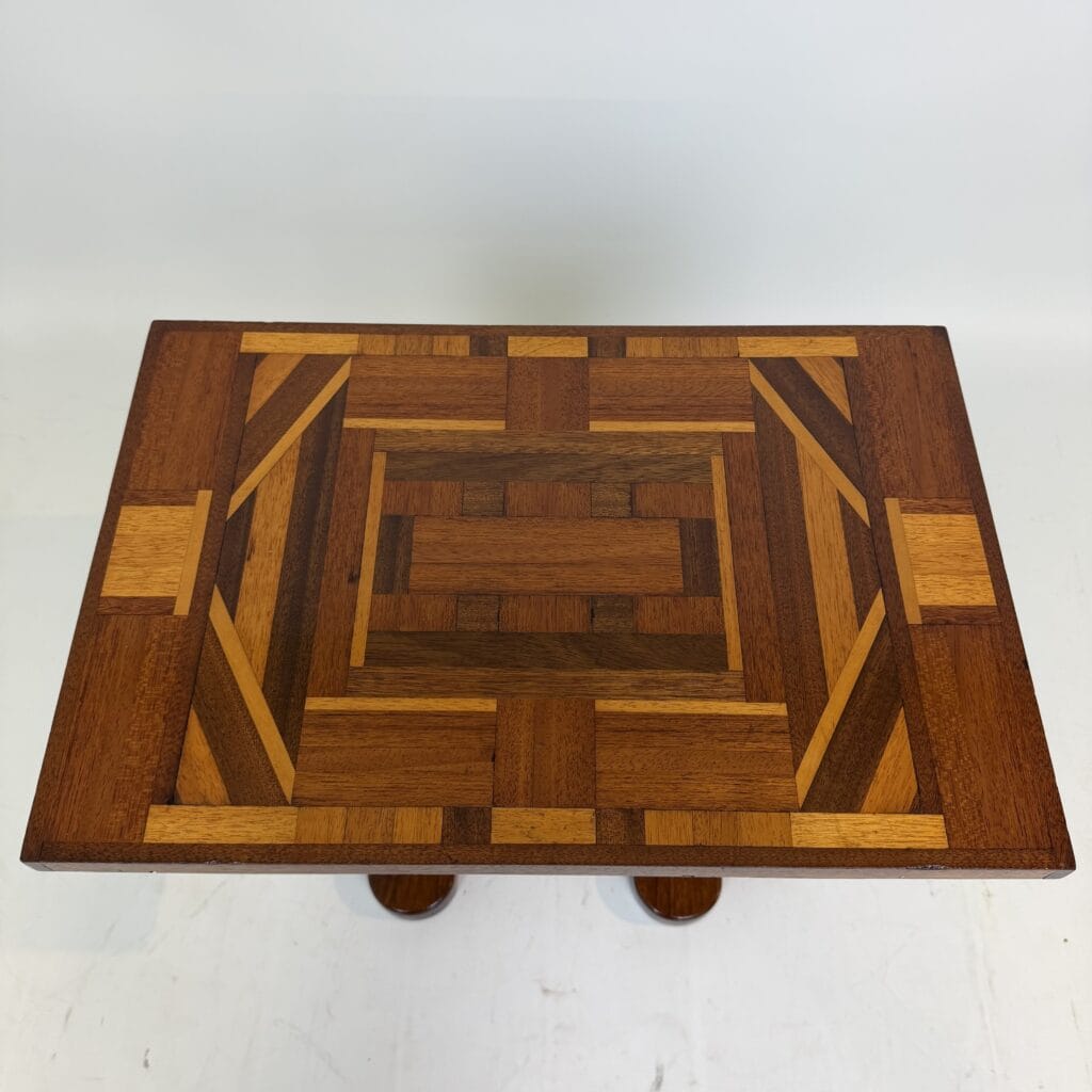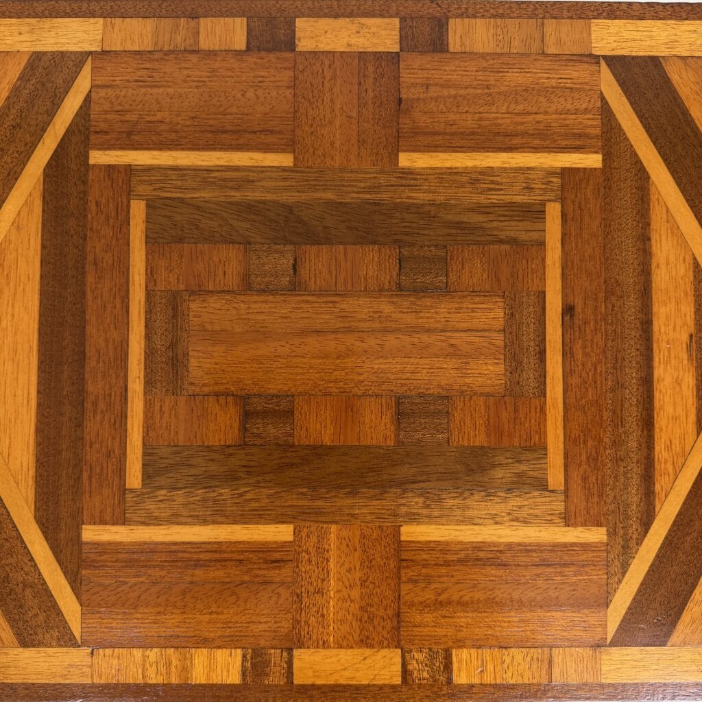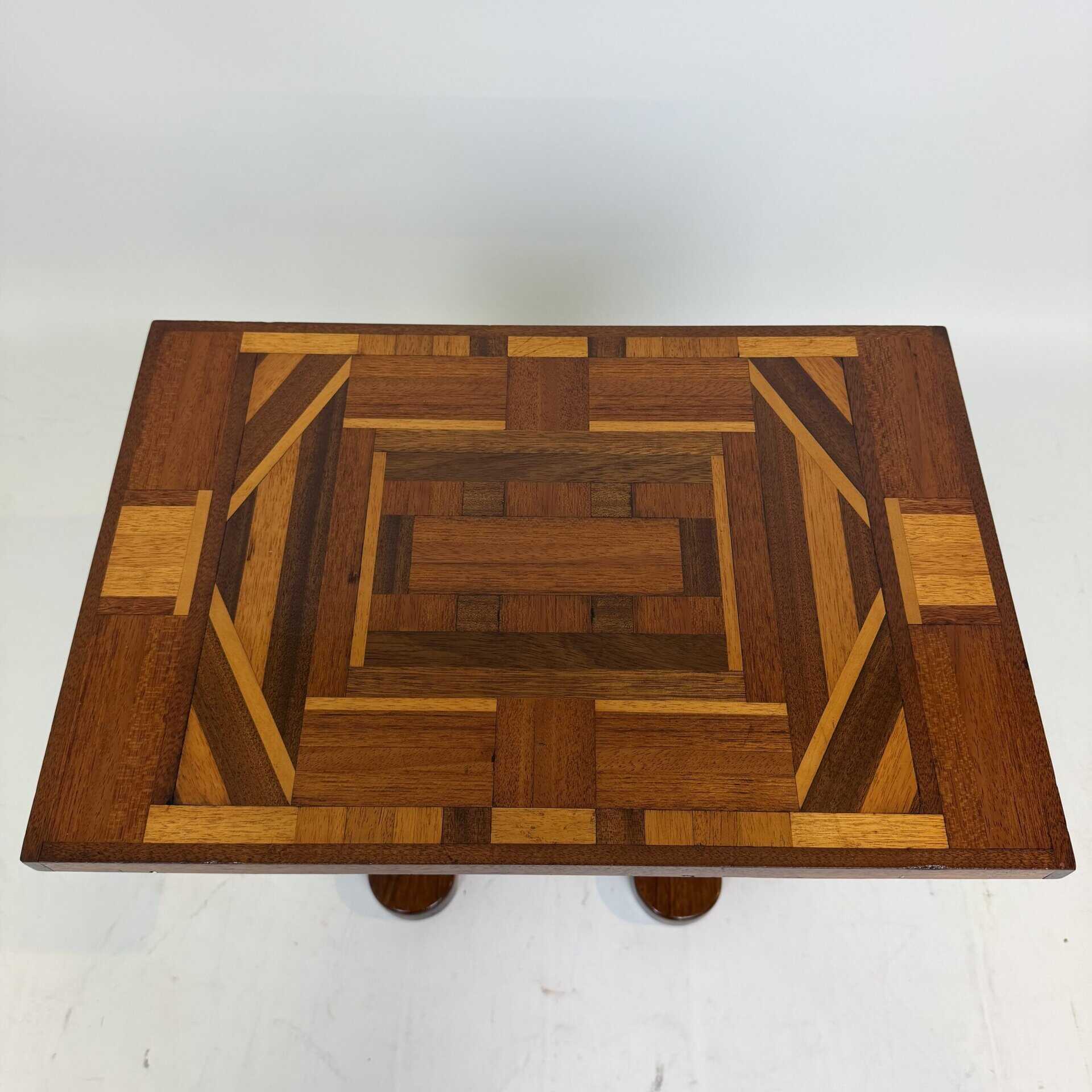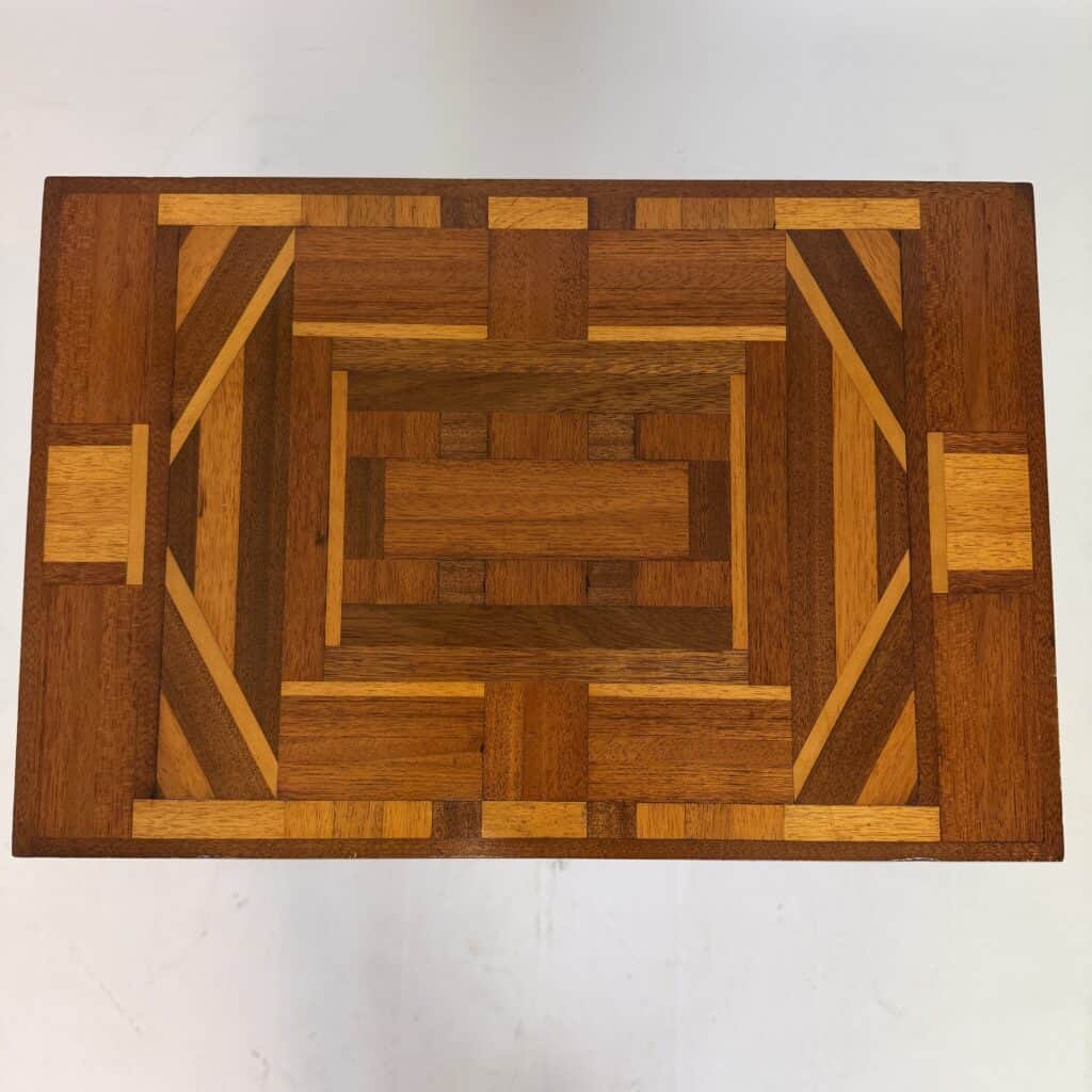 The top has a detailed geometric pattern with inlay work of different types of wood such as walnut, mahogany or rosewood with contrasting colours and patterns