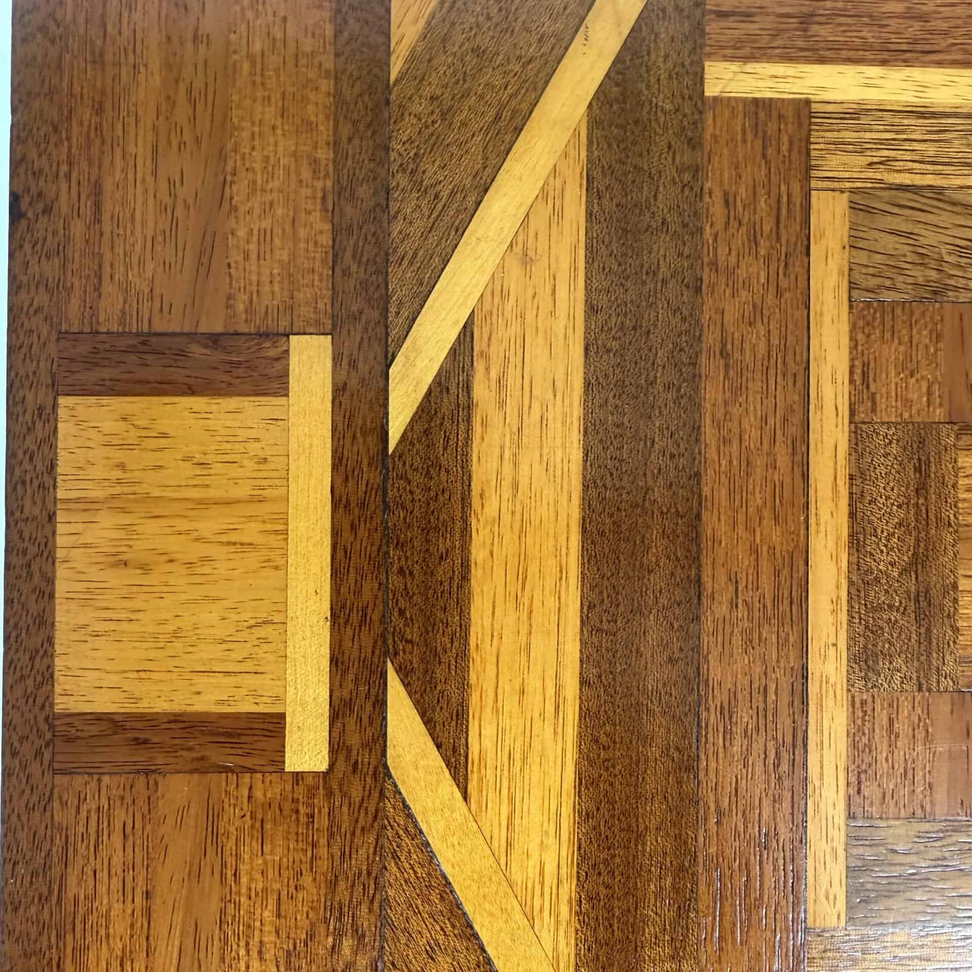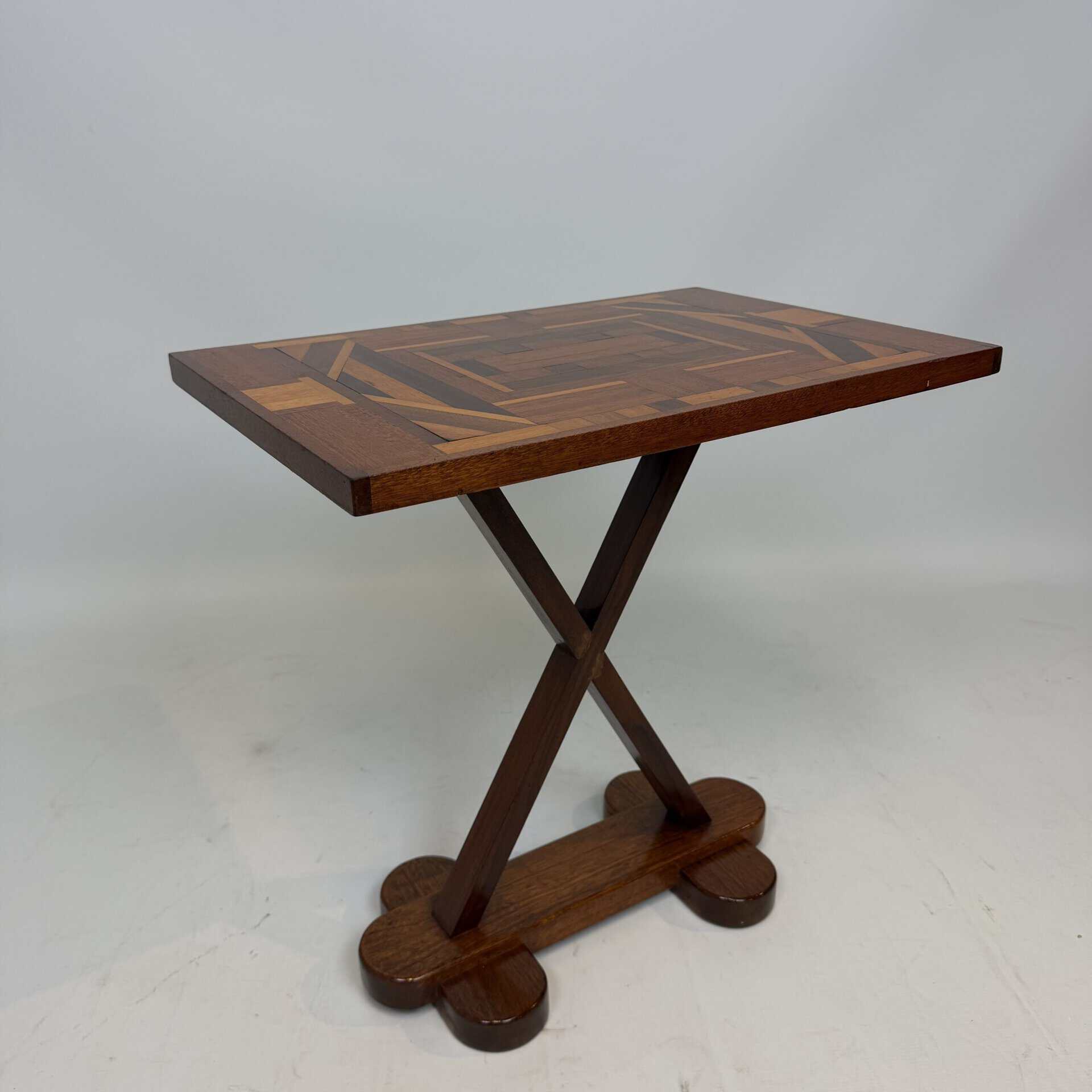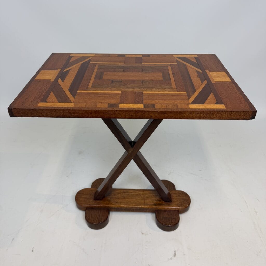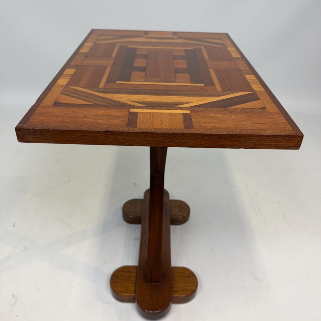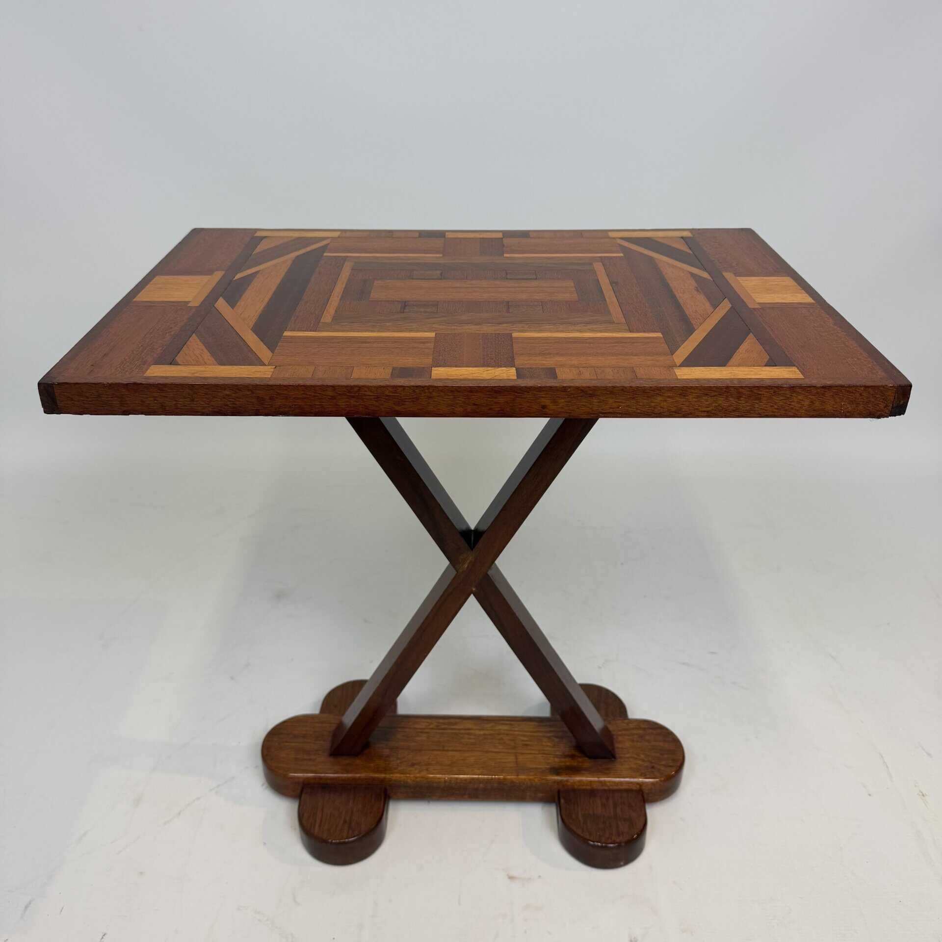 The top has a detailed geometric pattern with inlay work of different types of wood such as walnut, mahogany or rosewood with contrasting colours and patterns