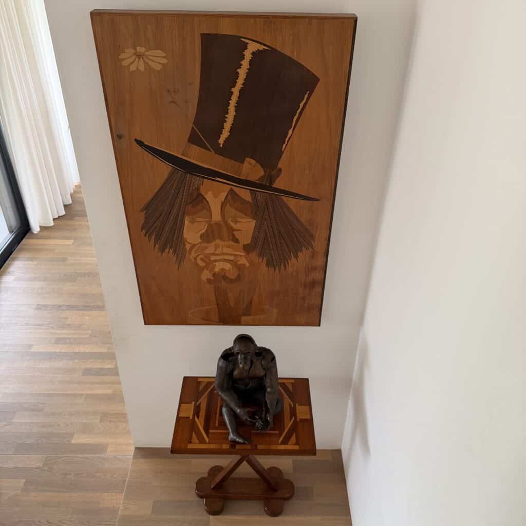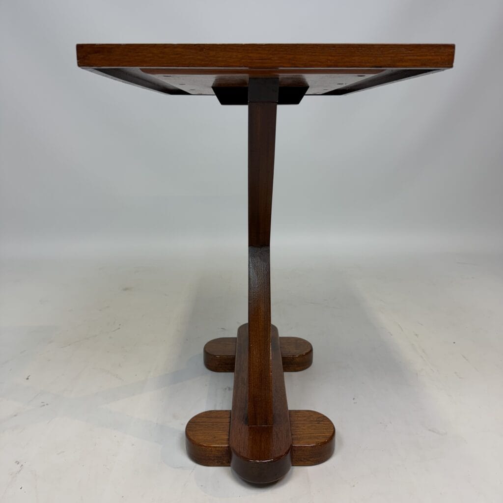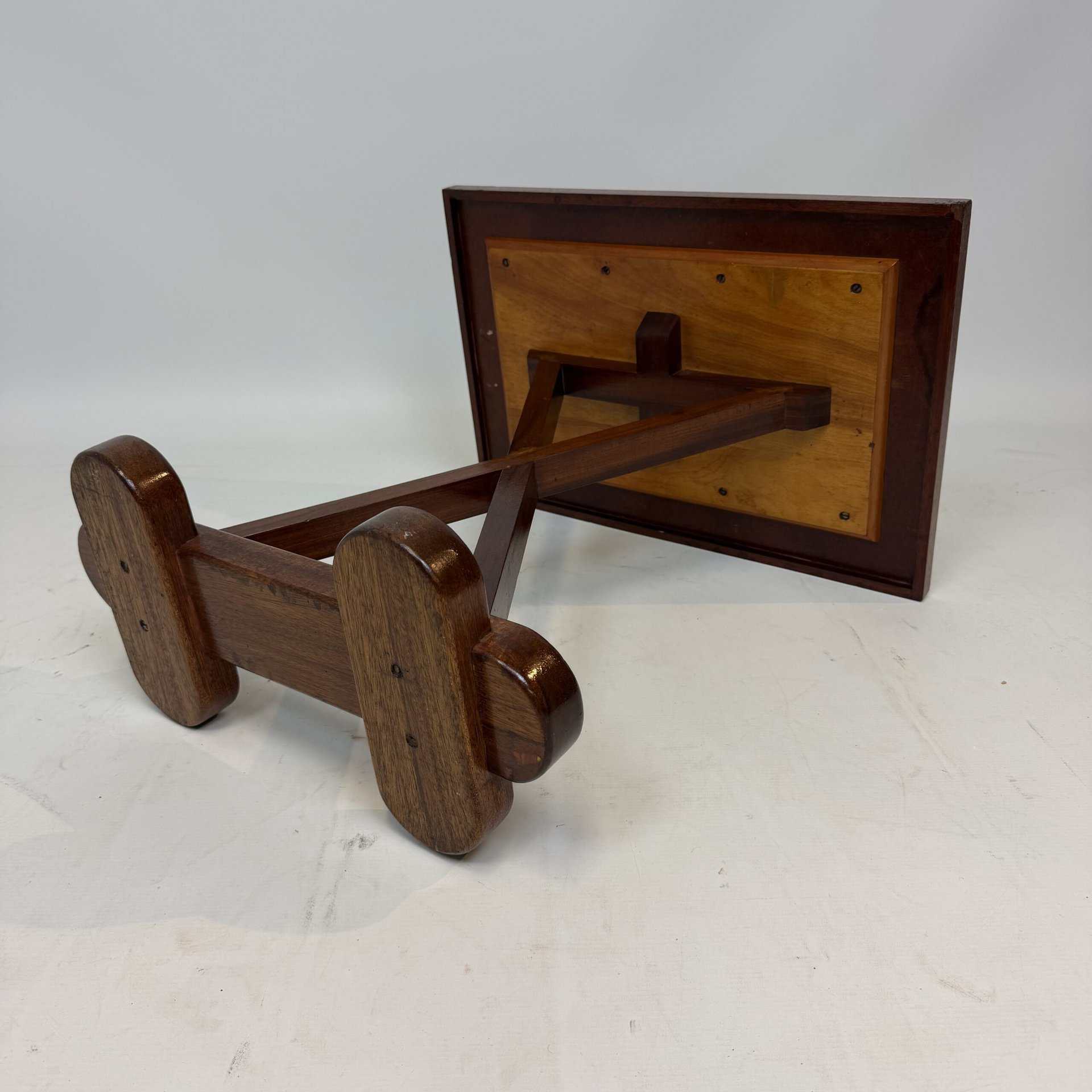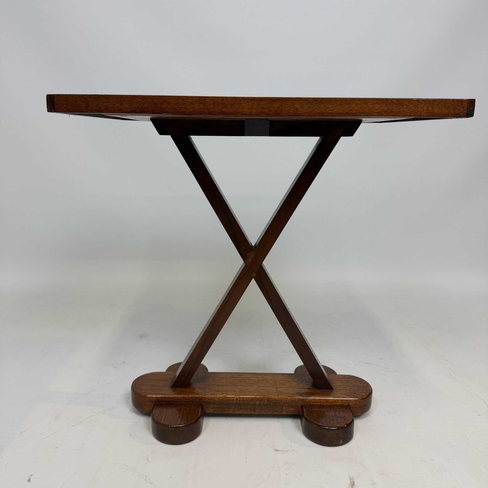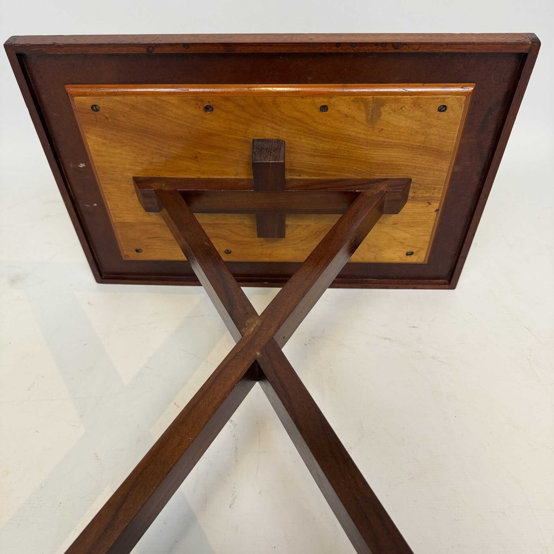 The top has a detailed geometric pattern with inlay work of different types of wood such as walnut, mahogany or rosewood with contrasting colours and patterns
