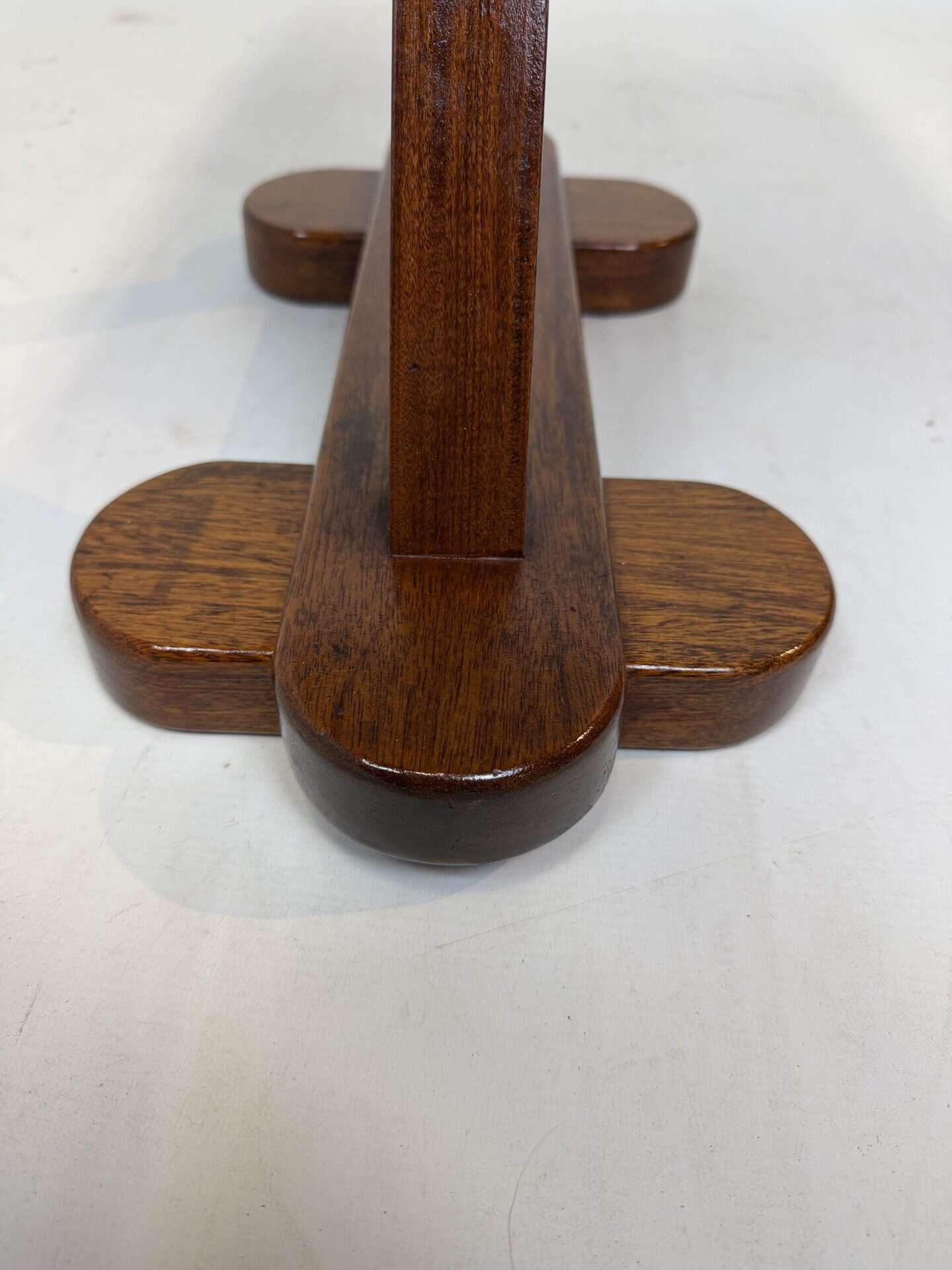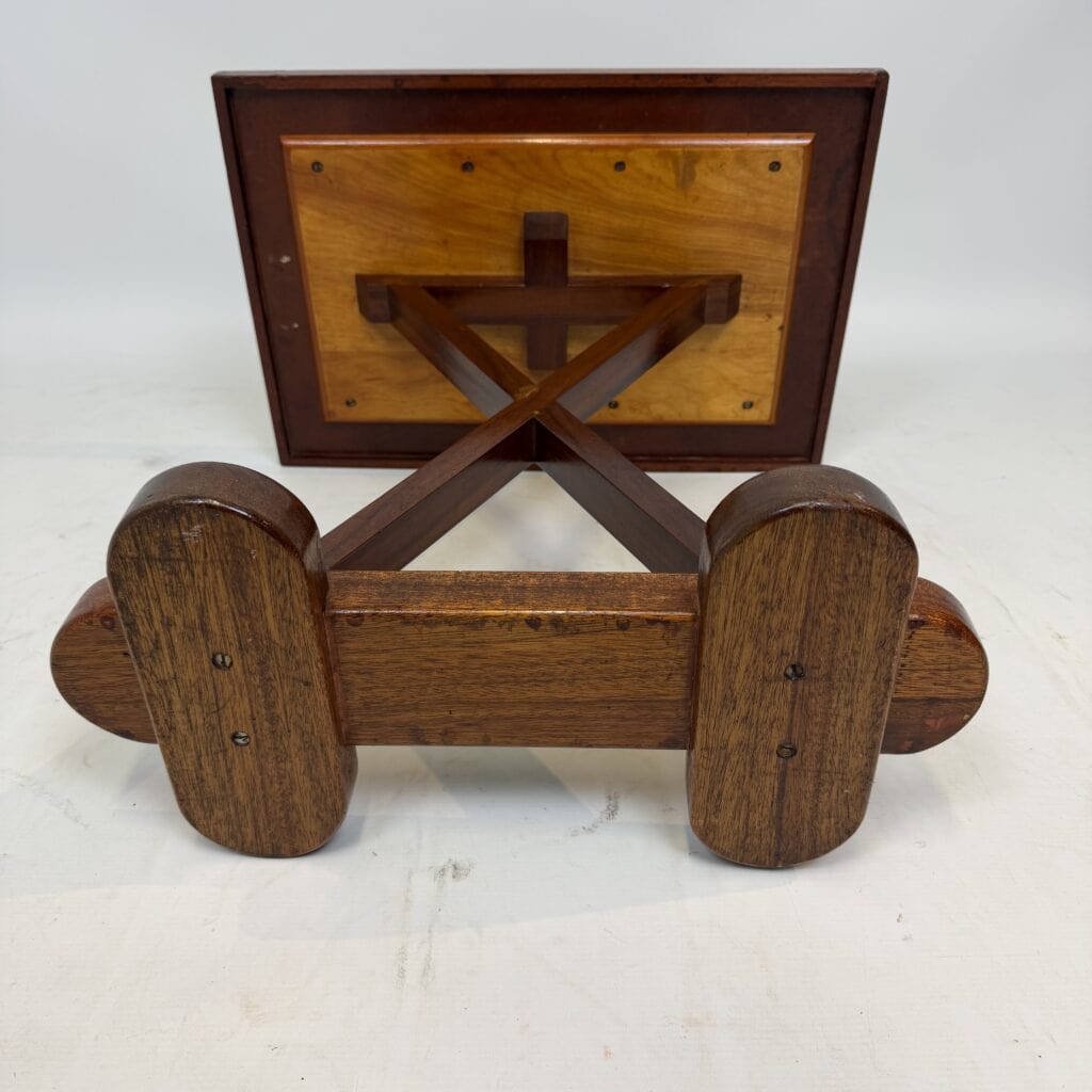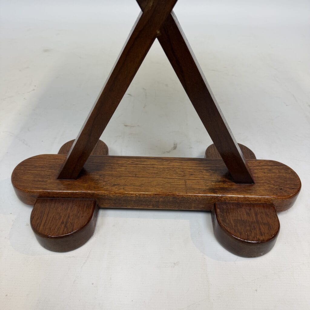 X-shaped base consisting of two slanted wooden legs. These legs are connected at the top by a horizontal beam