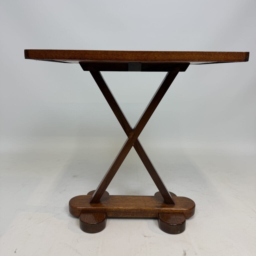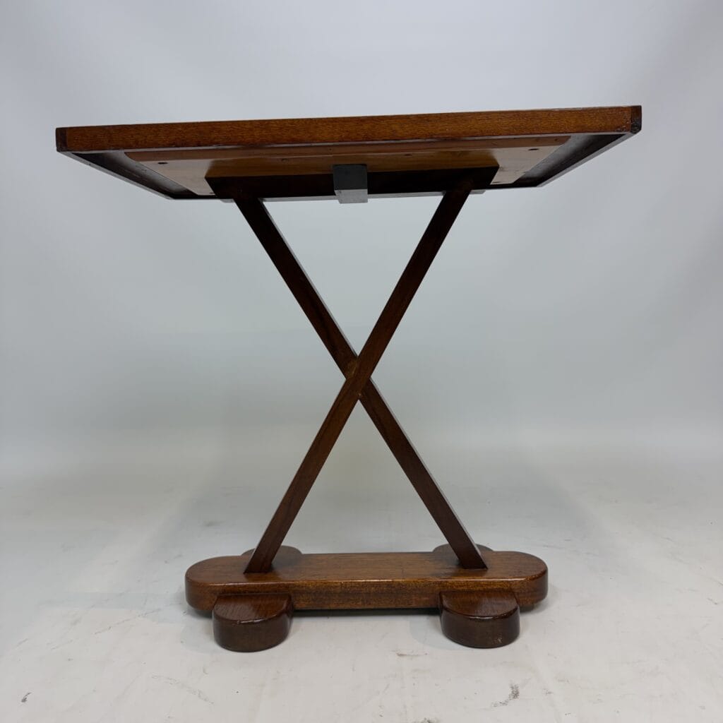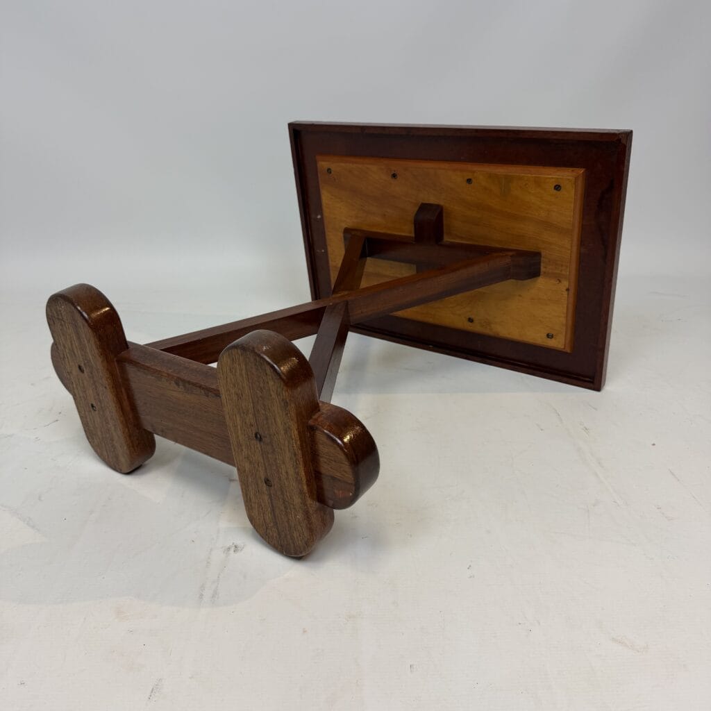 X-shaped base consisting of two slanted wooden legs. These legs are connected at the top by a horizontal beam