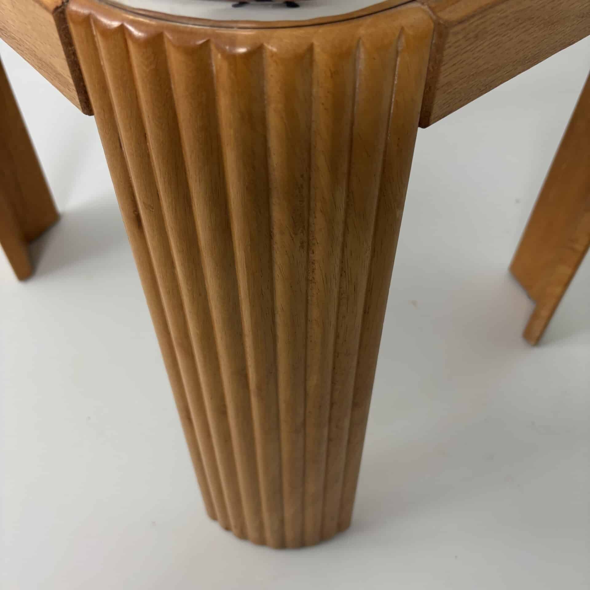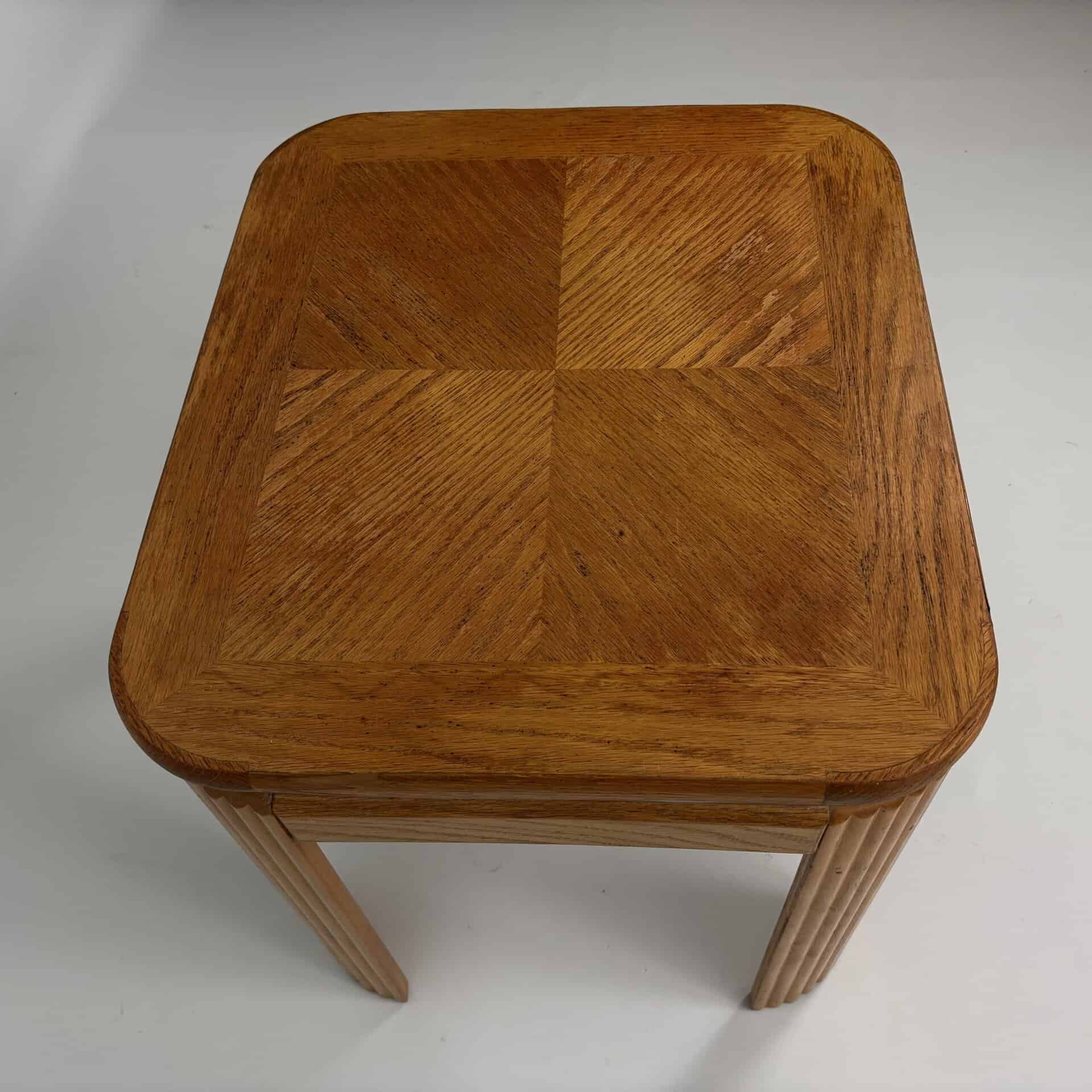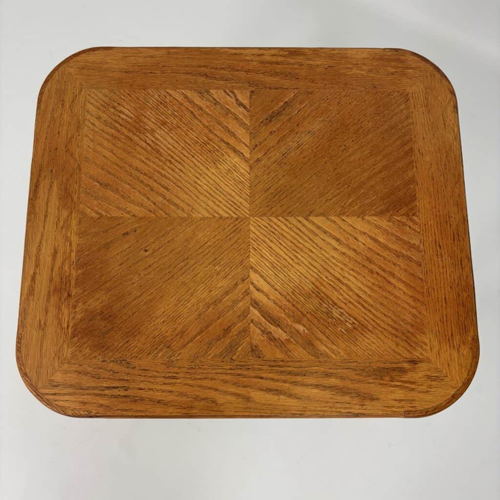 Oak table with veneered top surface arranged in a sunburst pattern.