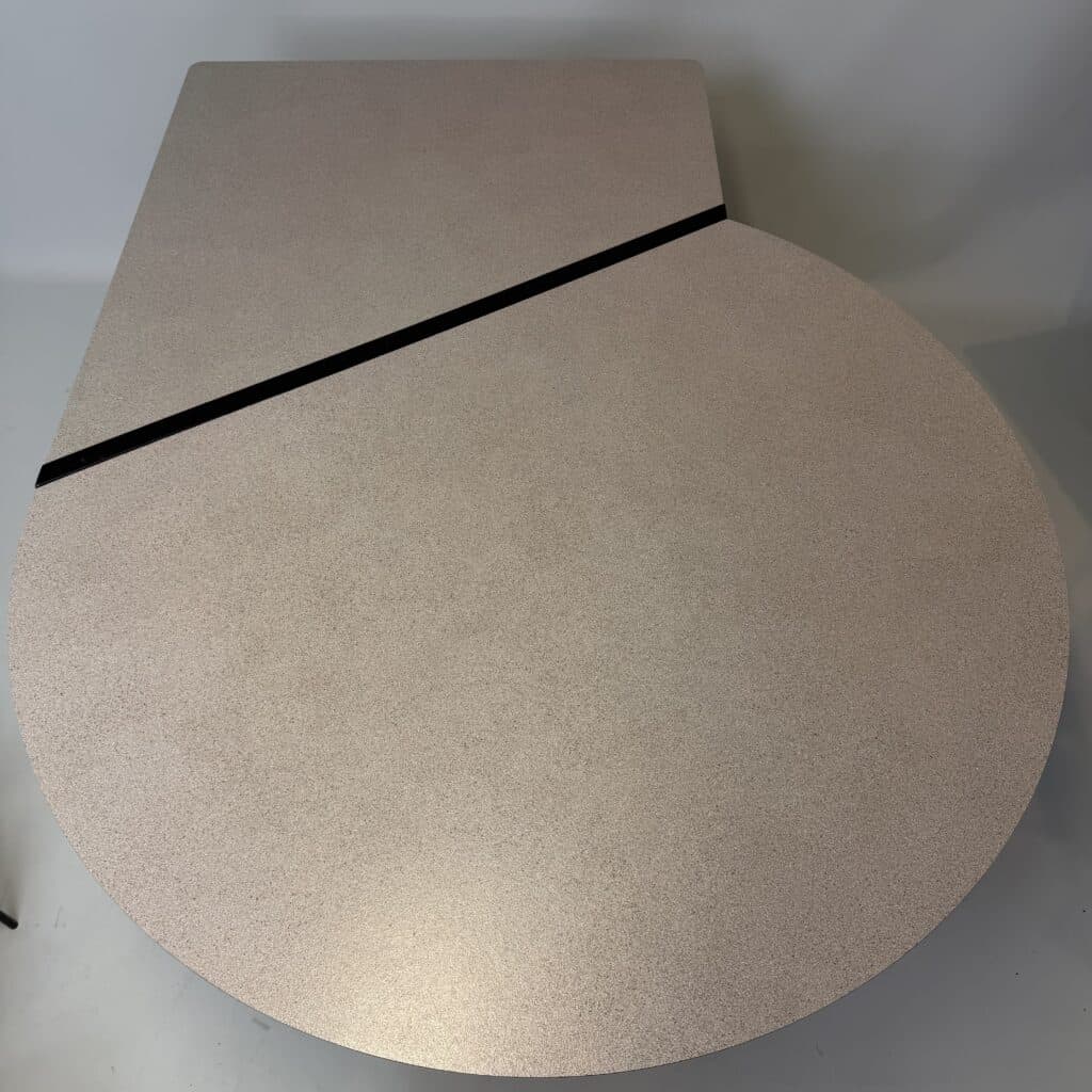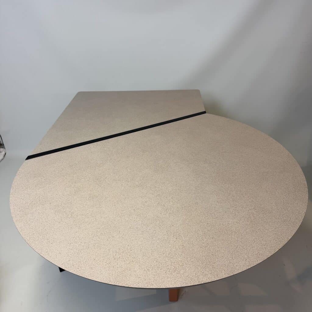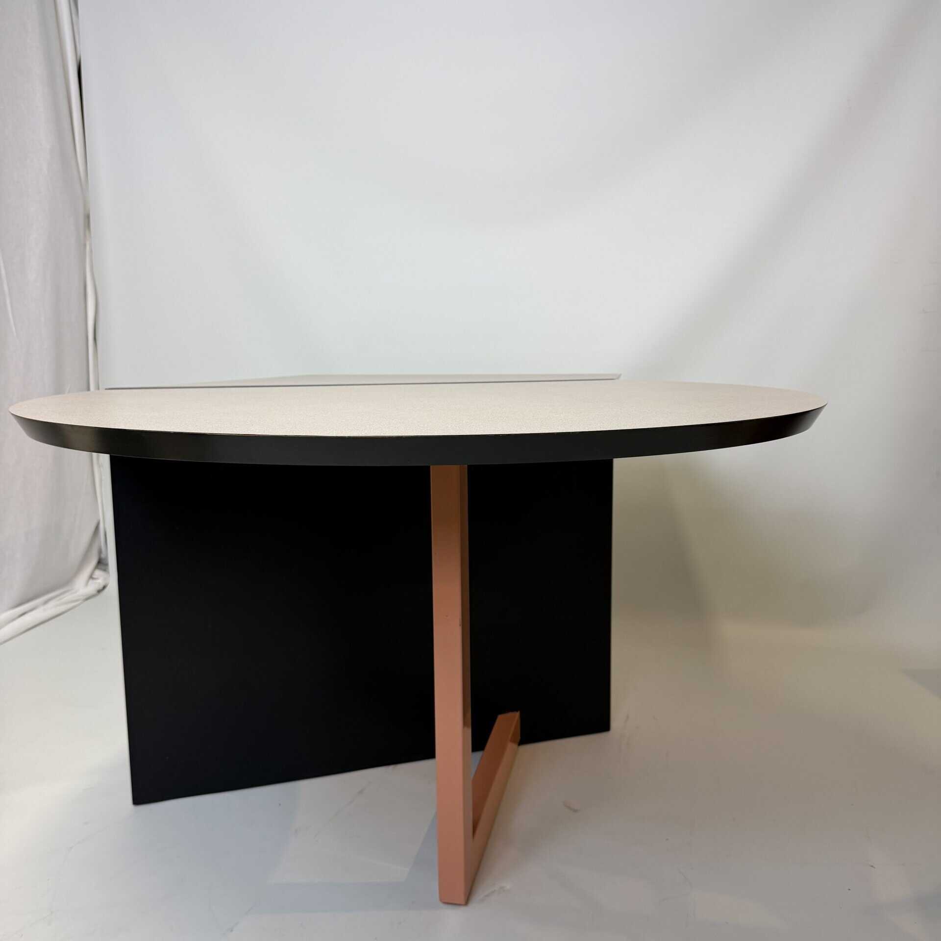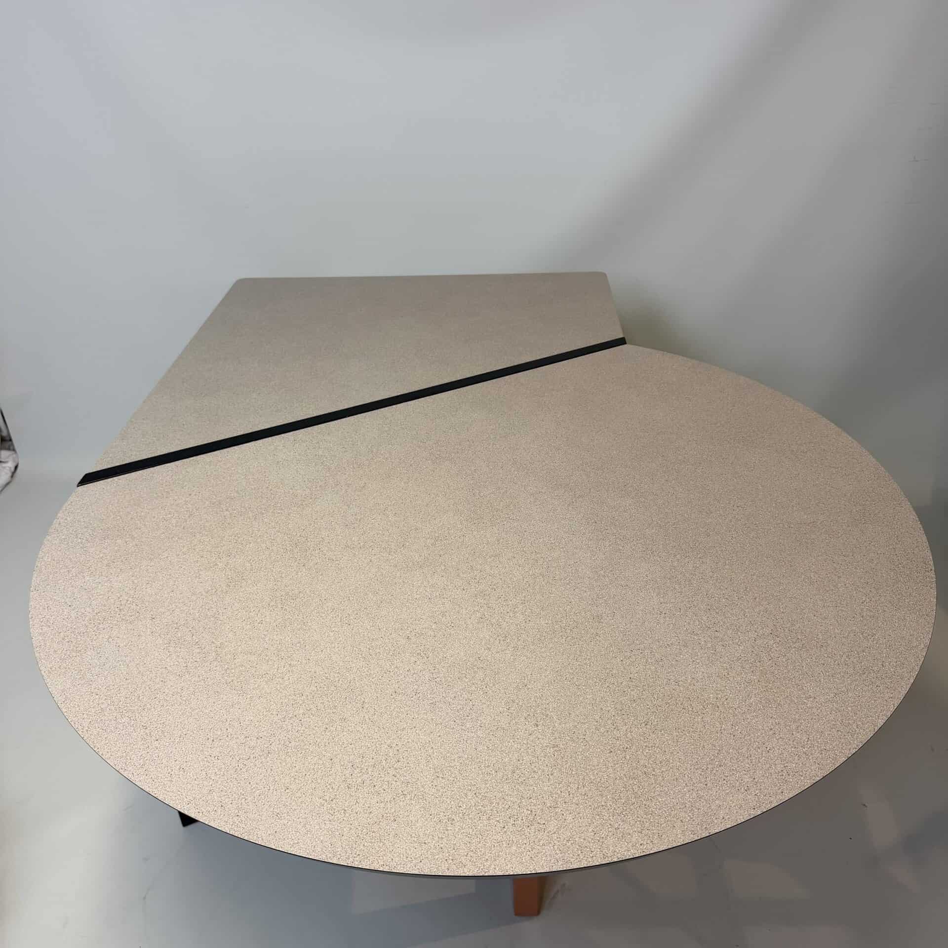 The meeting table has a diameter of 106 cm and the desk section is 80 cm wide.