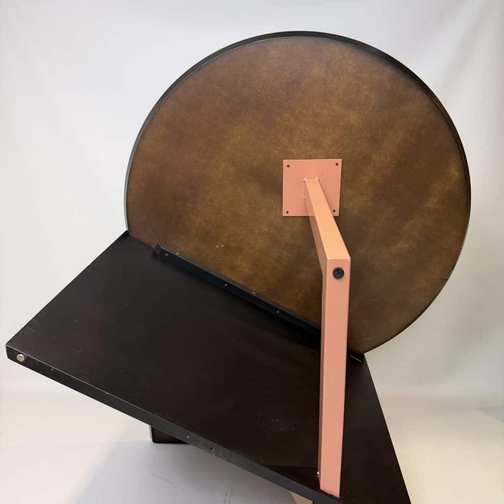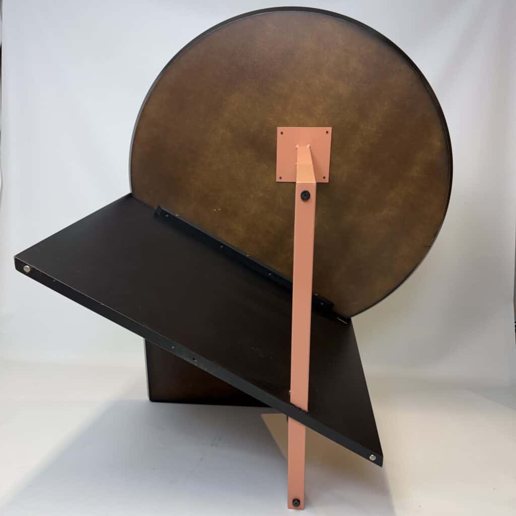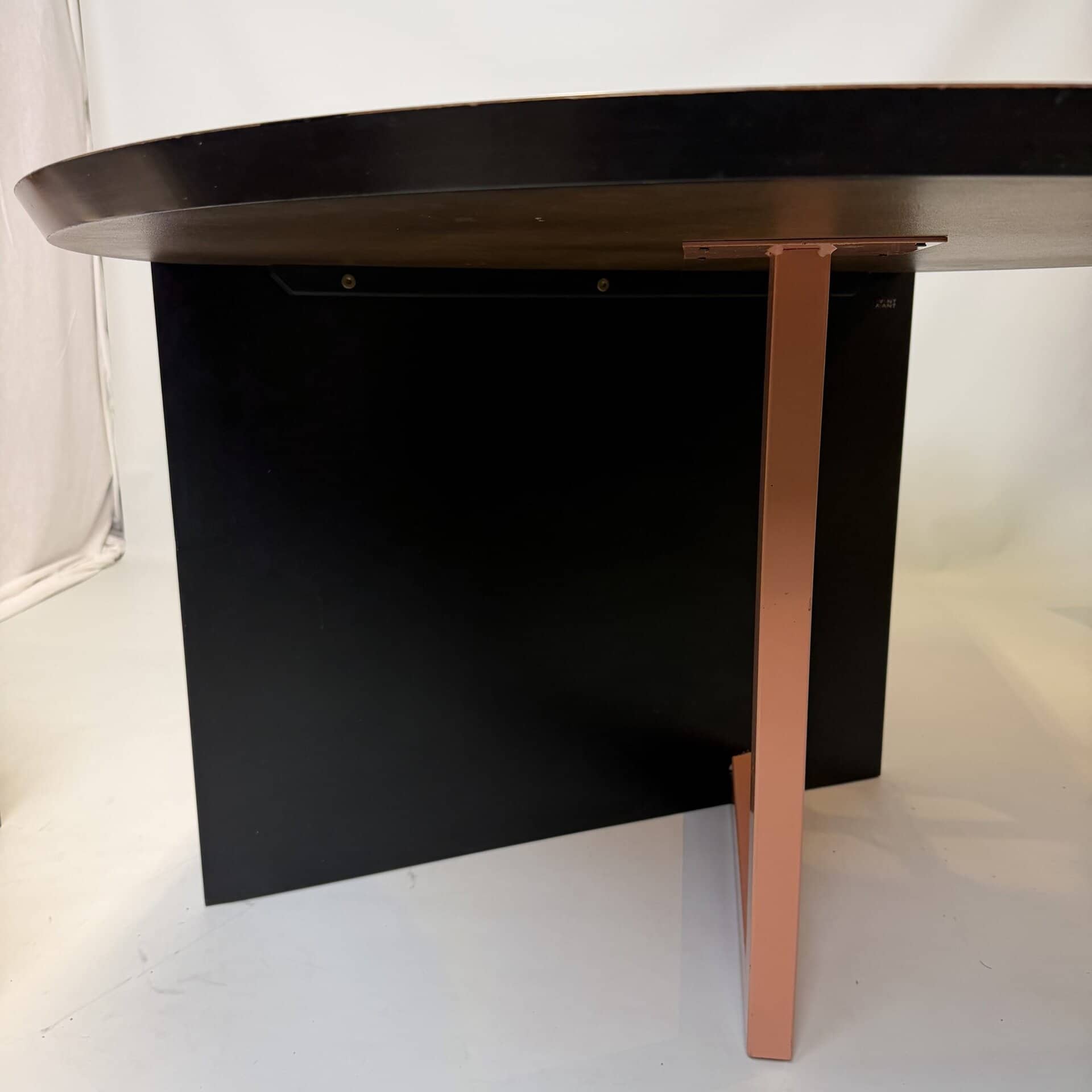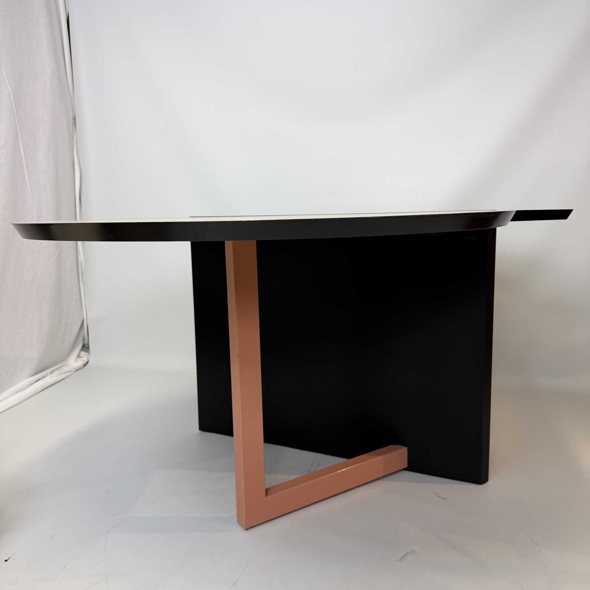 The meeting table has a diameter of 106 cm and the desk section is 80 cm wide.