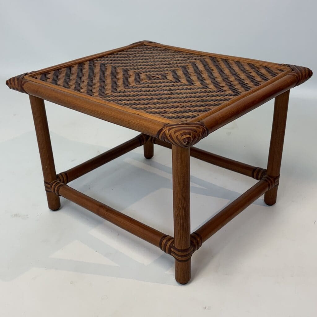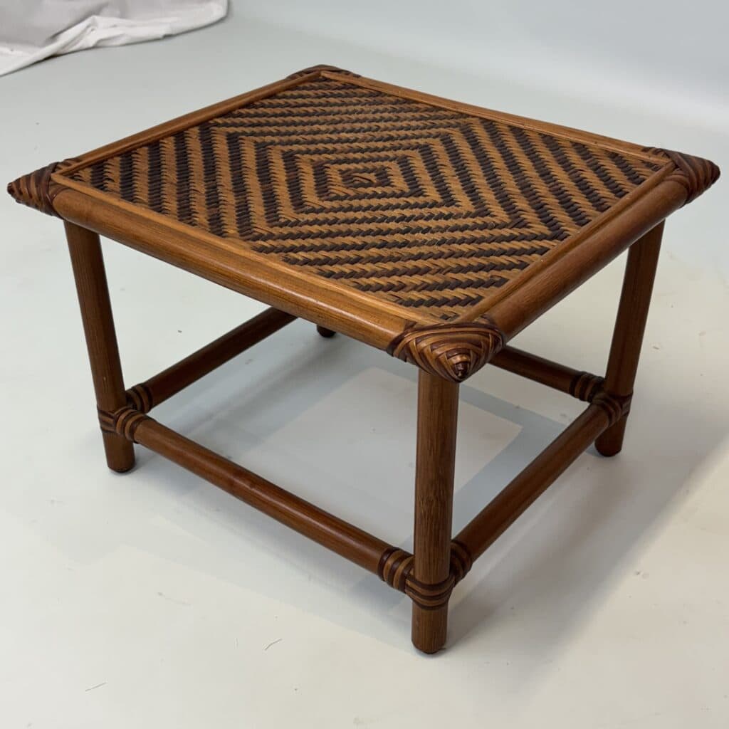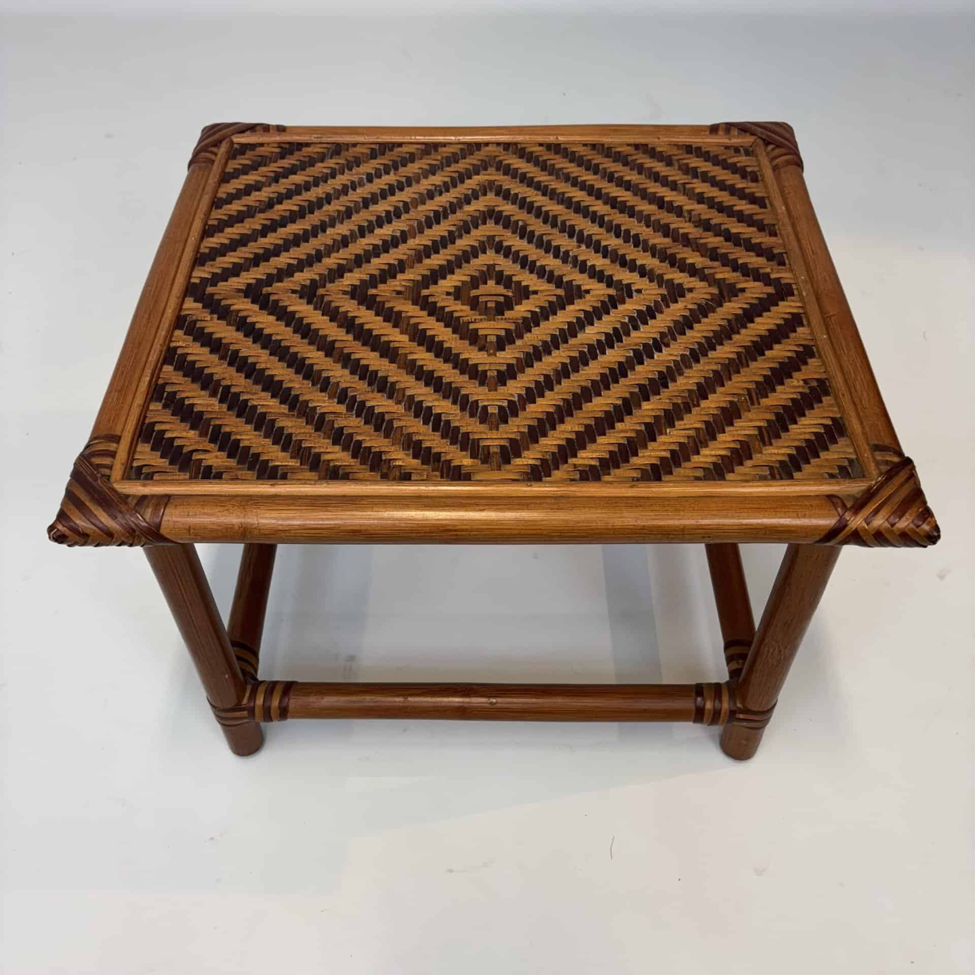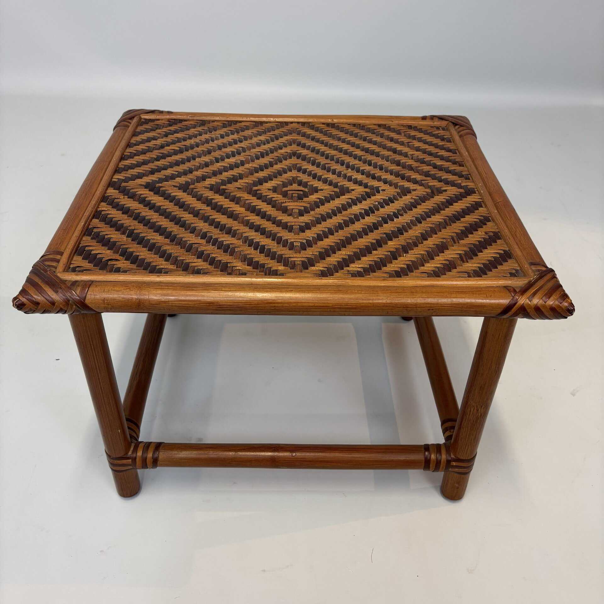Handmade table with bamboo frame, plywood top covered with rattan in diamond pattern
