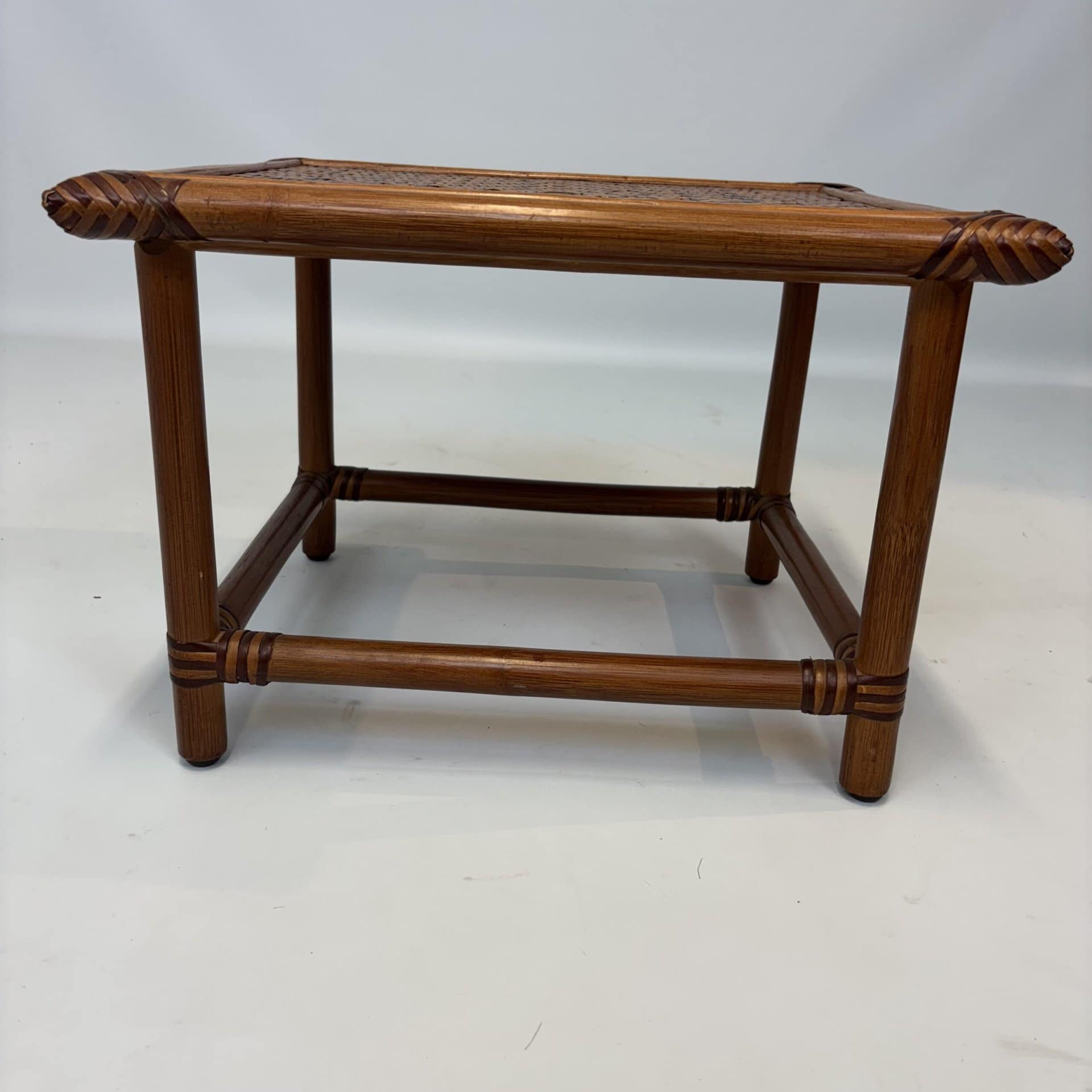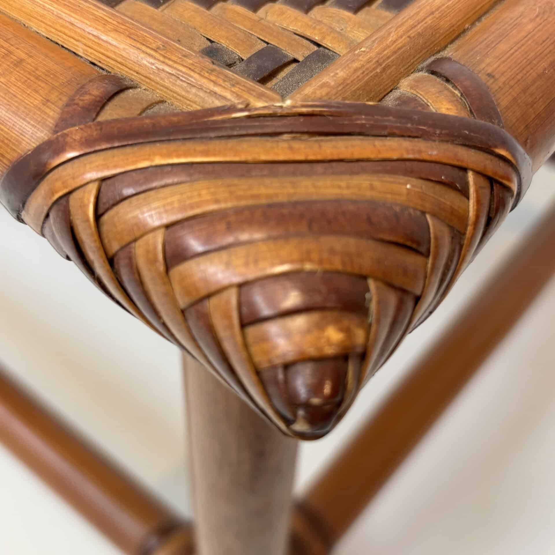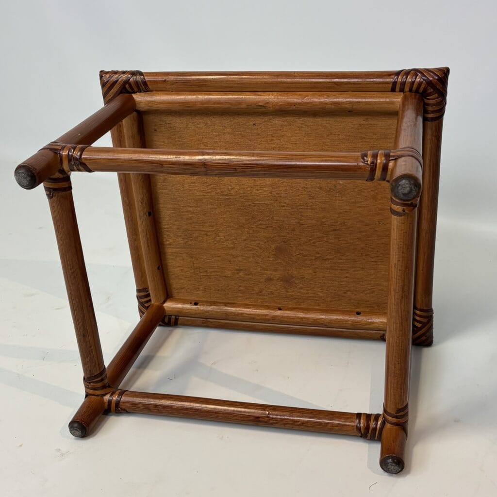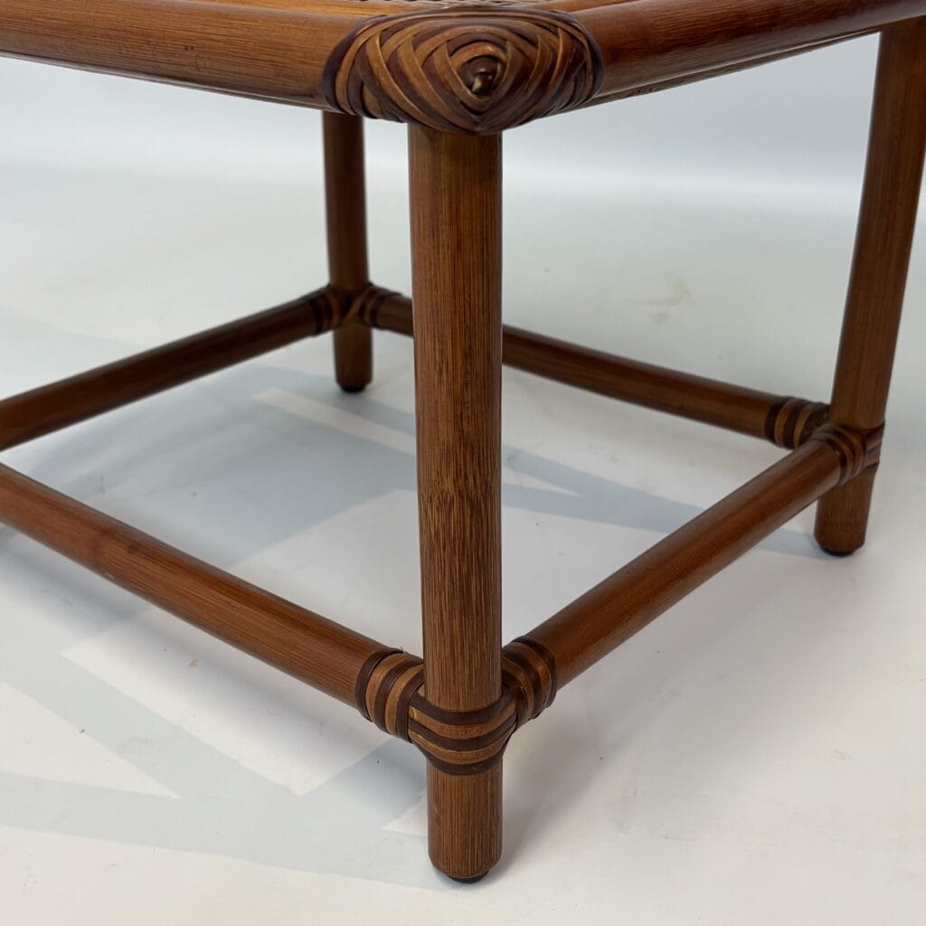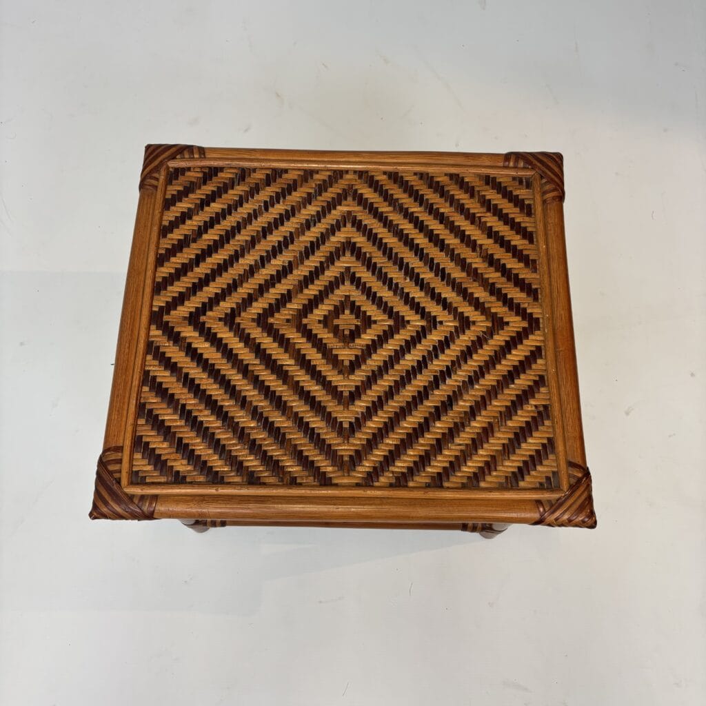 Handmade table with bamboo frame, plywood top covered with rattan in diamond pattern