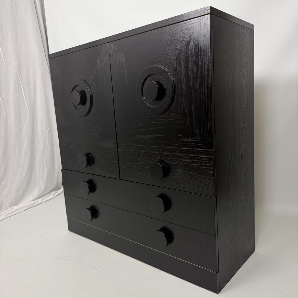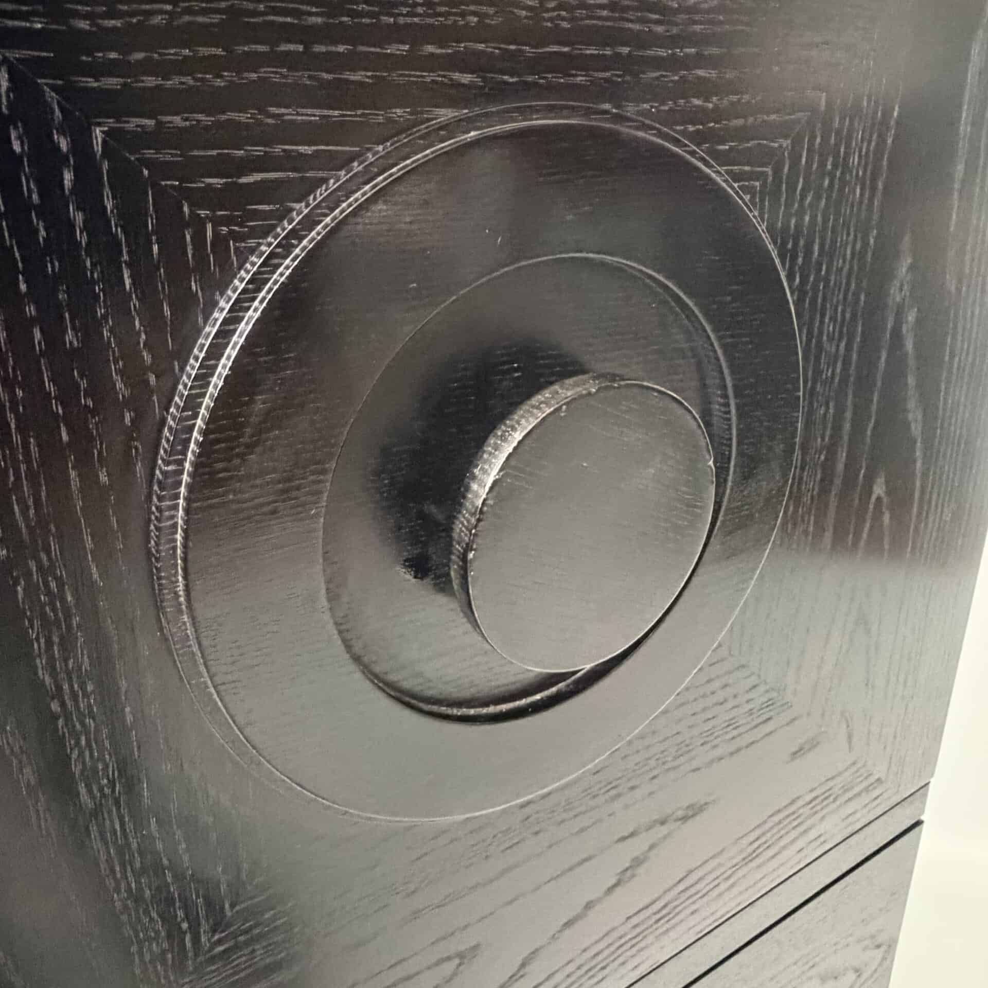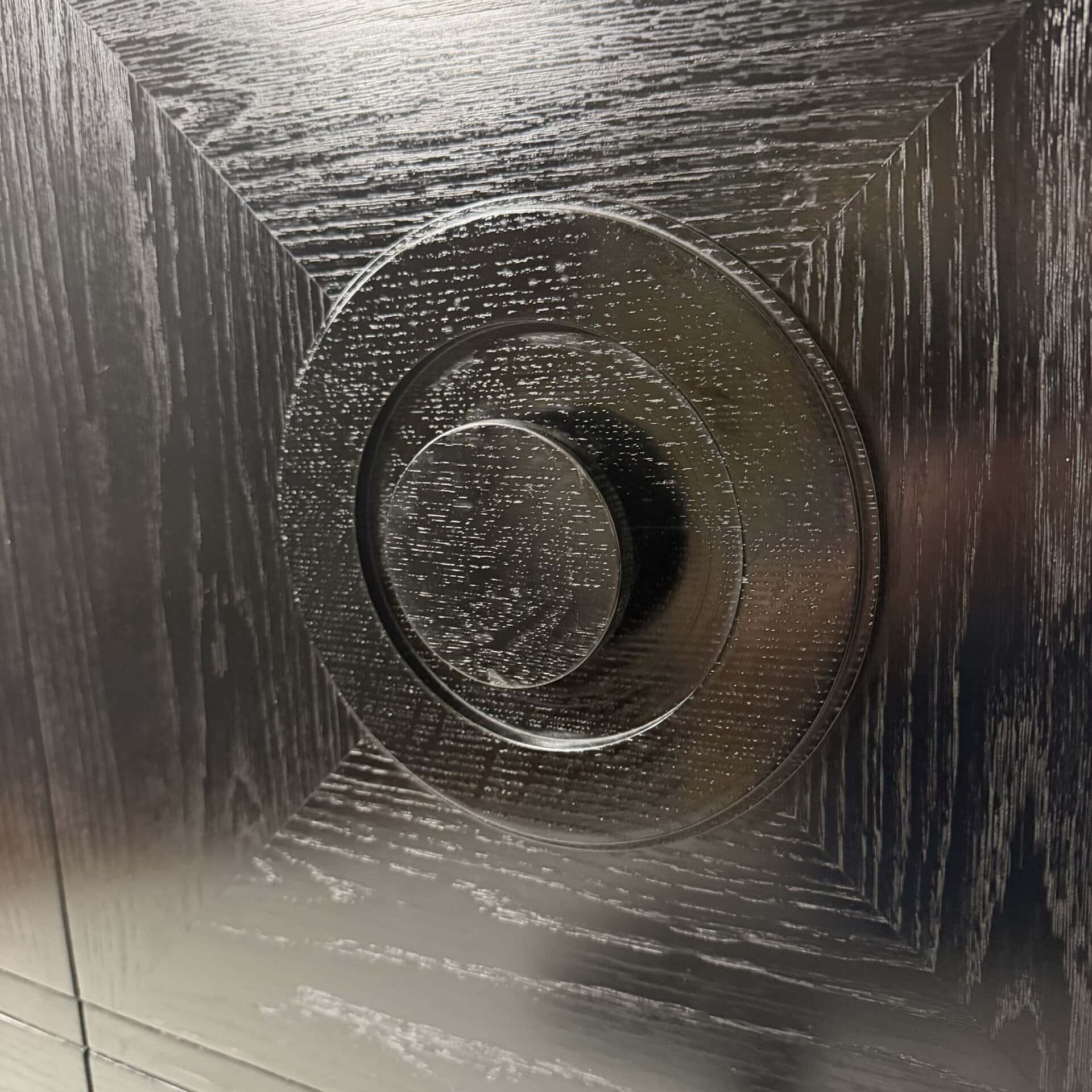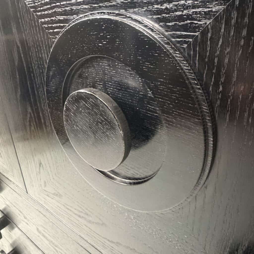 The deeply textured geometric door panels with concentric circular carving and the oversized circular wooden handles give them a brutalist, yet modernist look