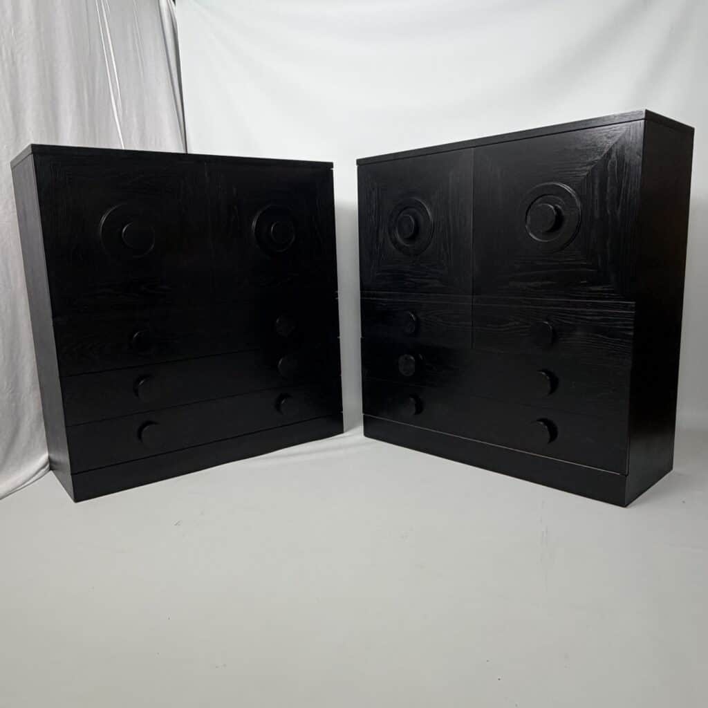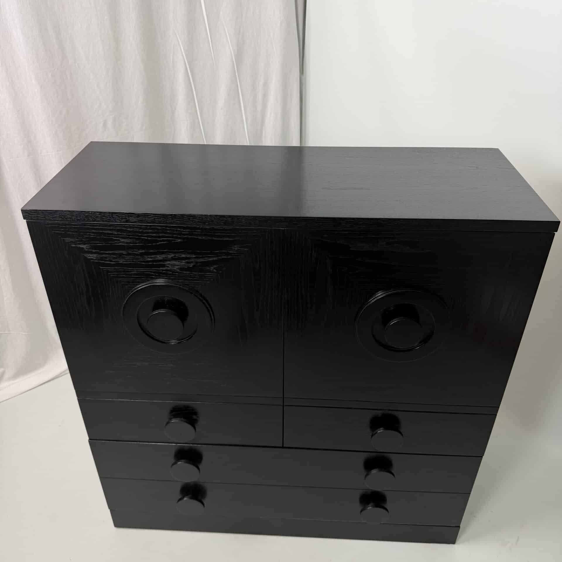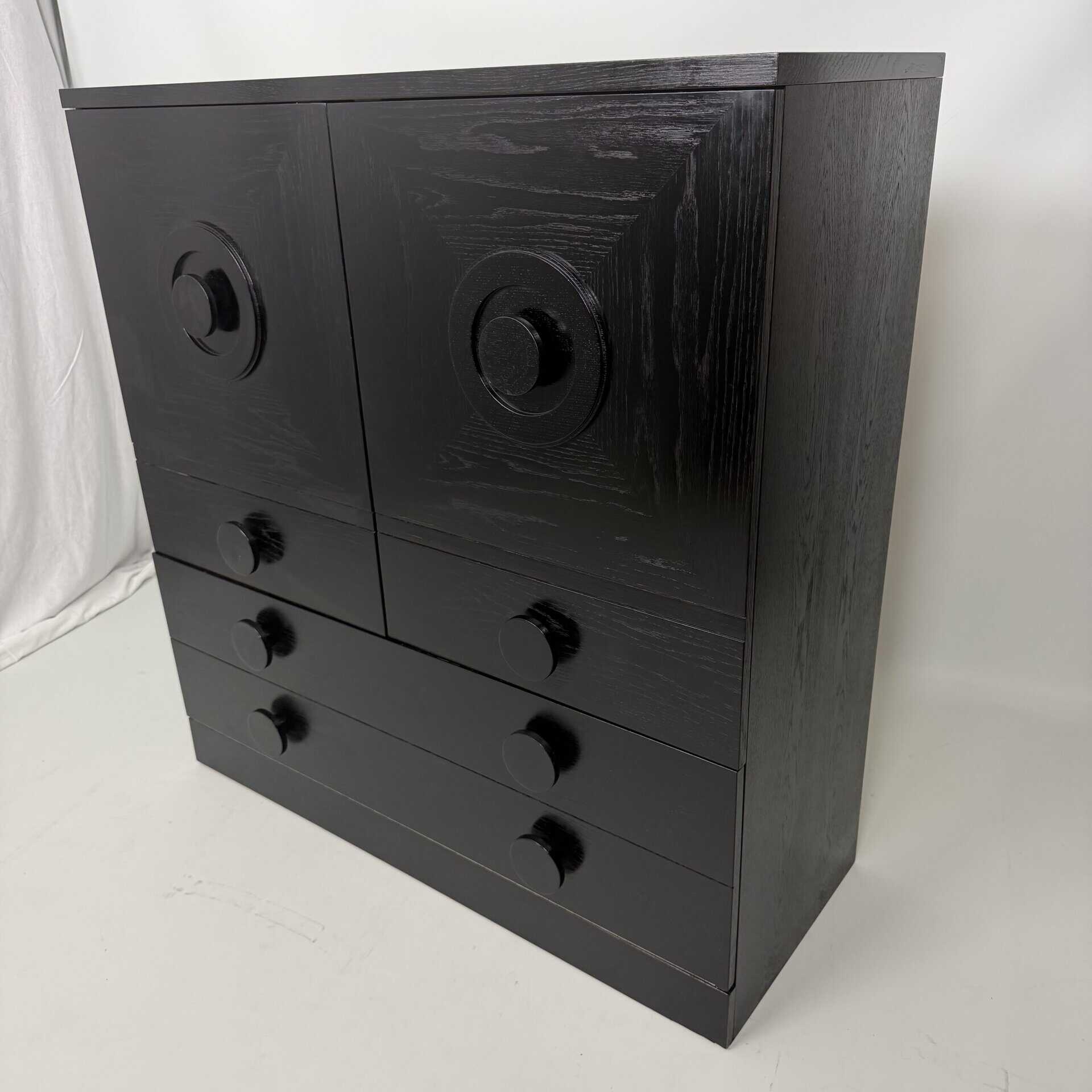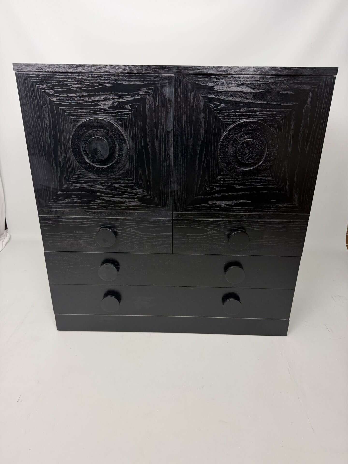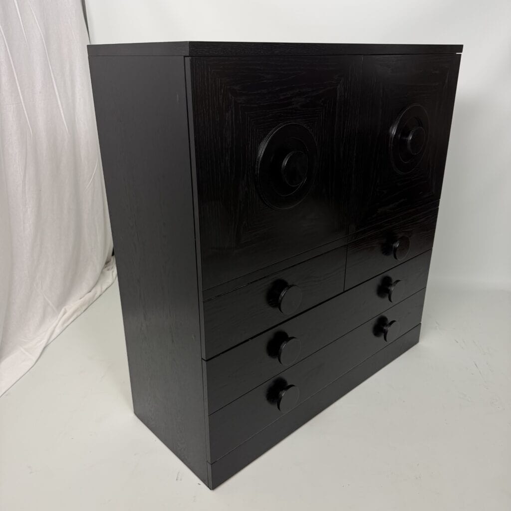 The deeply textured geometric door panels with concentric circular carving and the oversized circular wooden handles give them a brutalist, yet modernist look