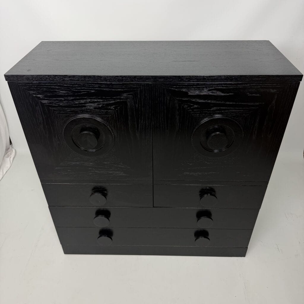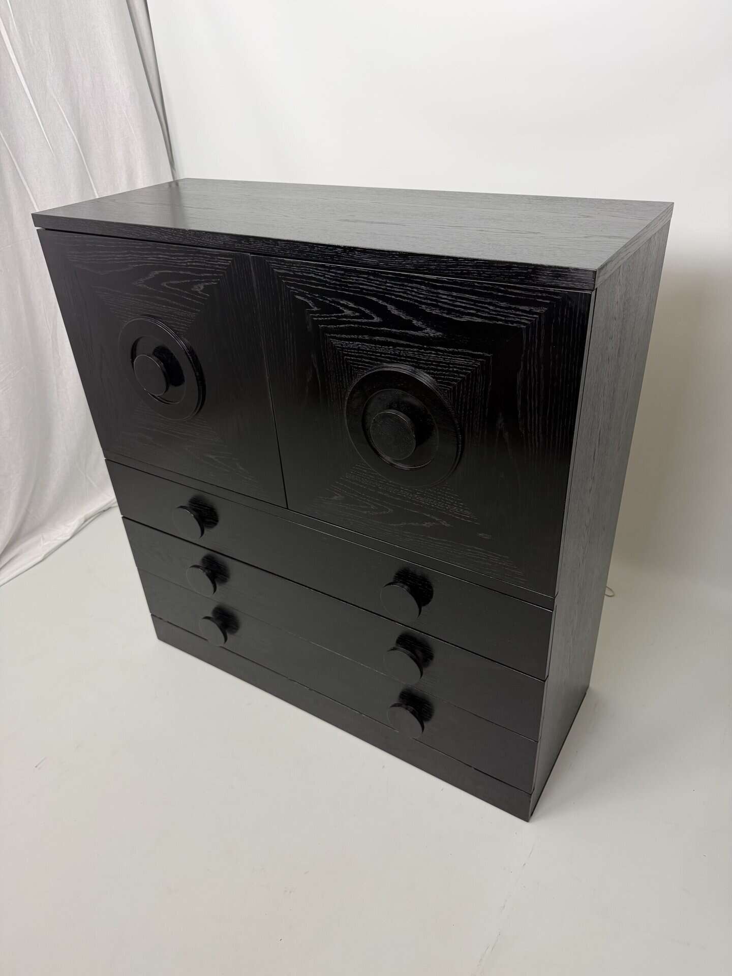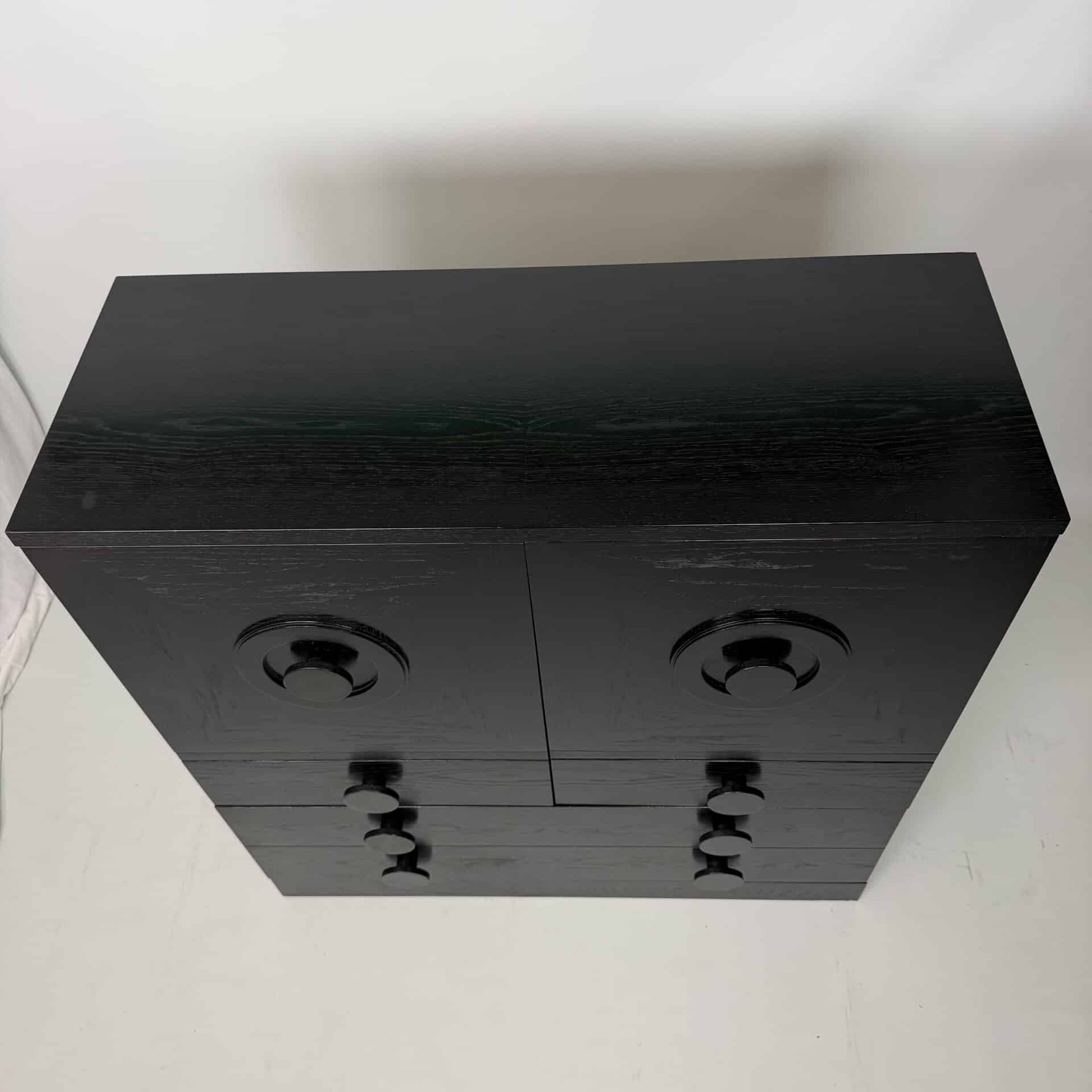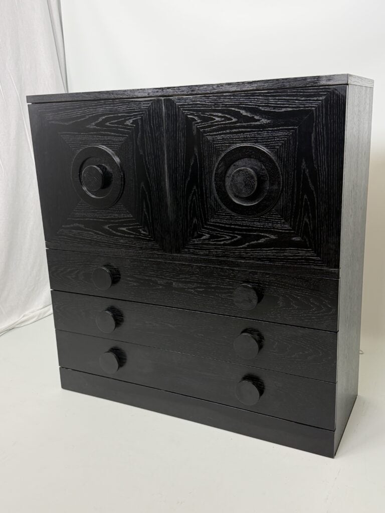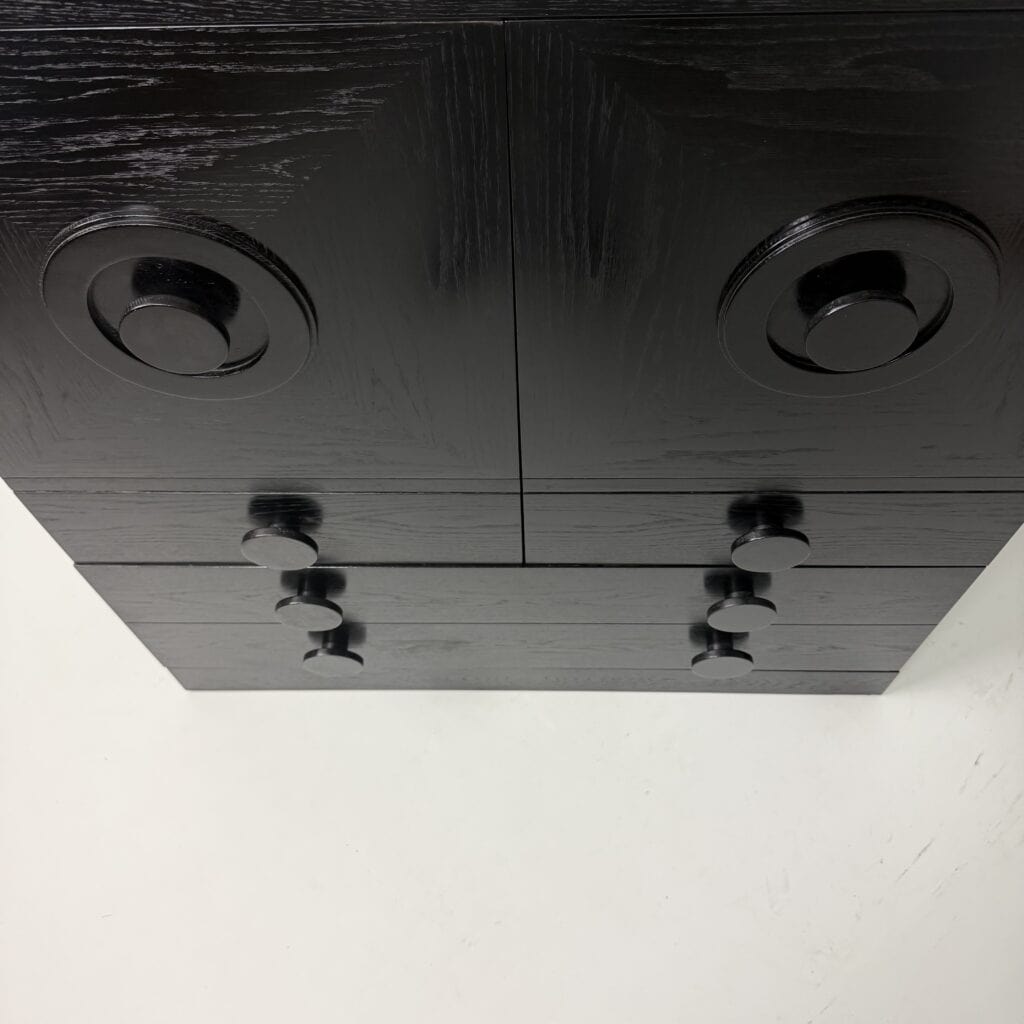 The deeply textured geometric door panels with concentric circular carving and the oversized circular wooden handles give them a brutalist, yet modernist look