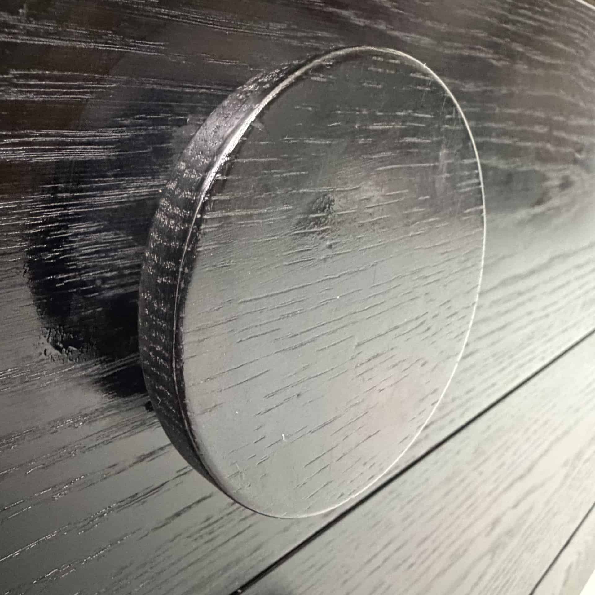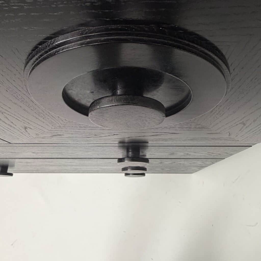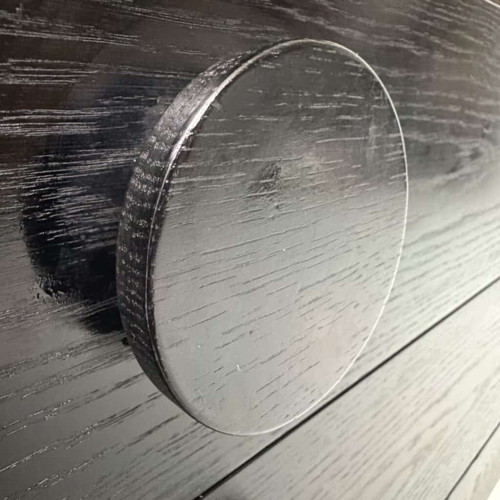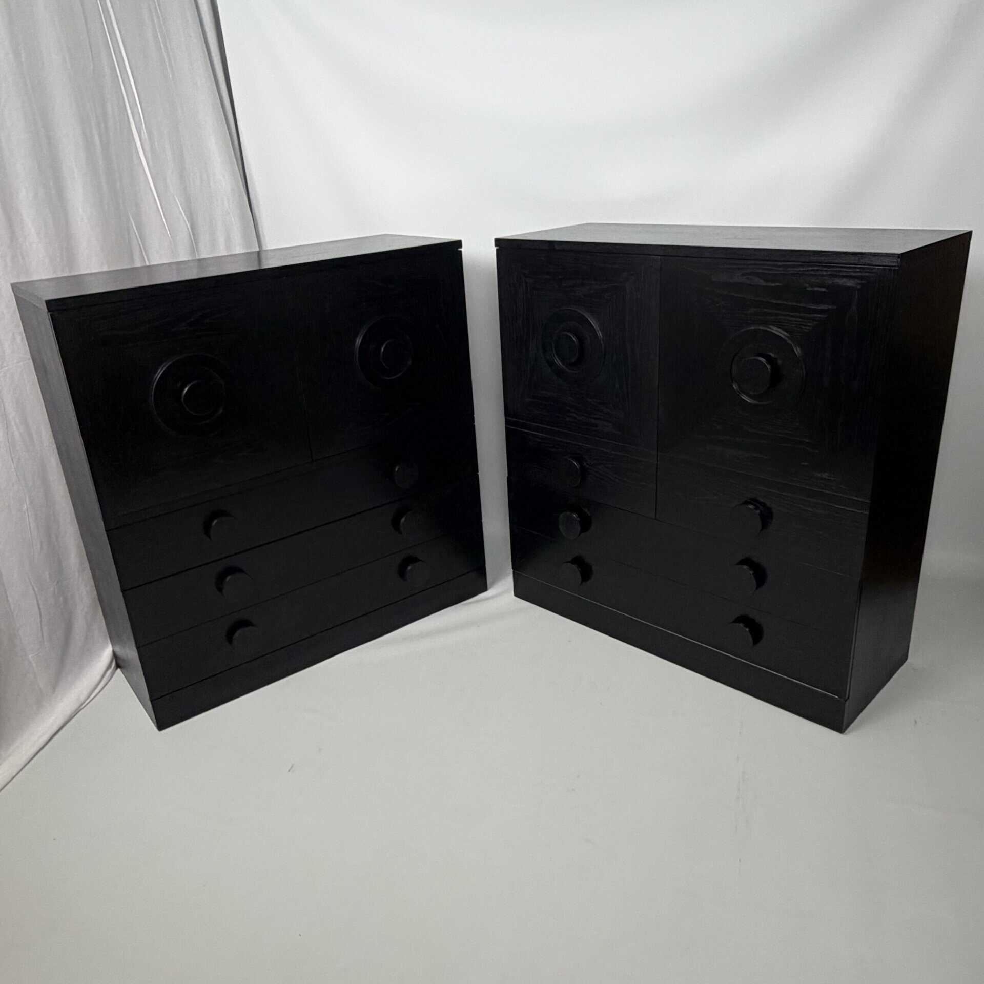 The deeply textured geometric door panels with concentric circular carving and the oversized circular wooden handles give them a brutalist, yet modernist look