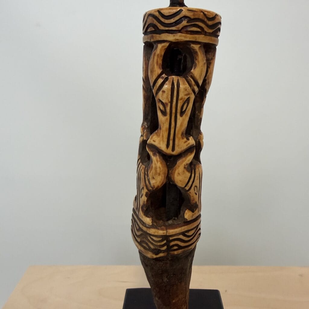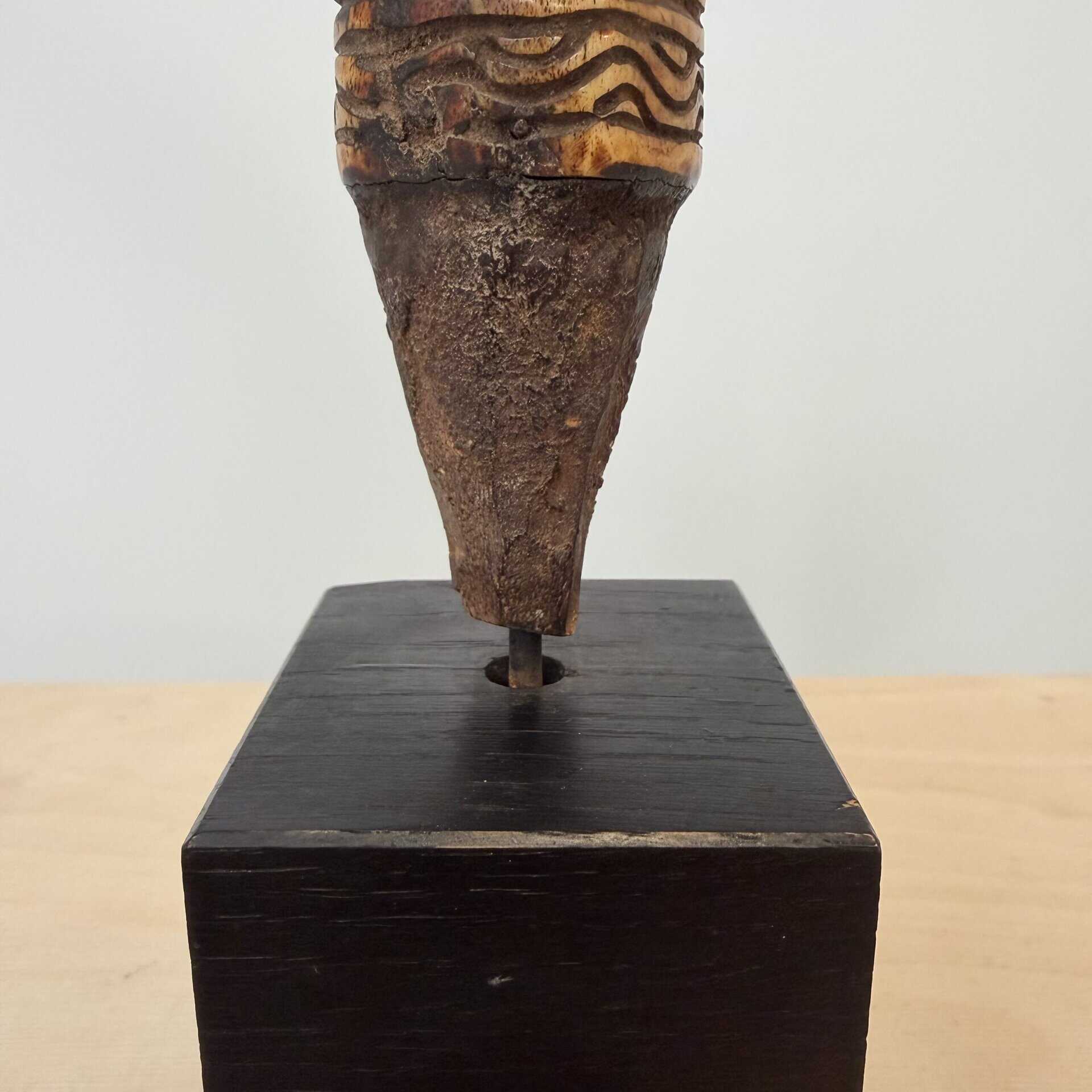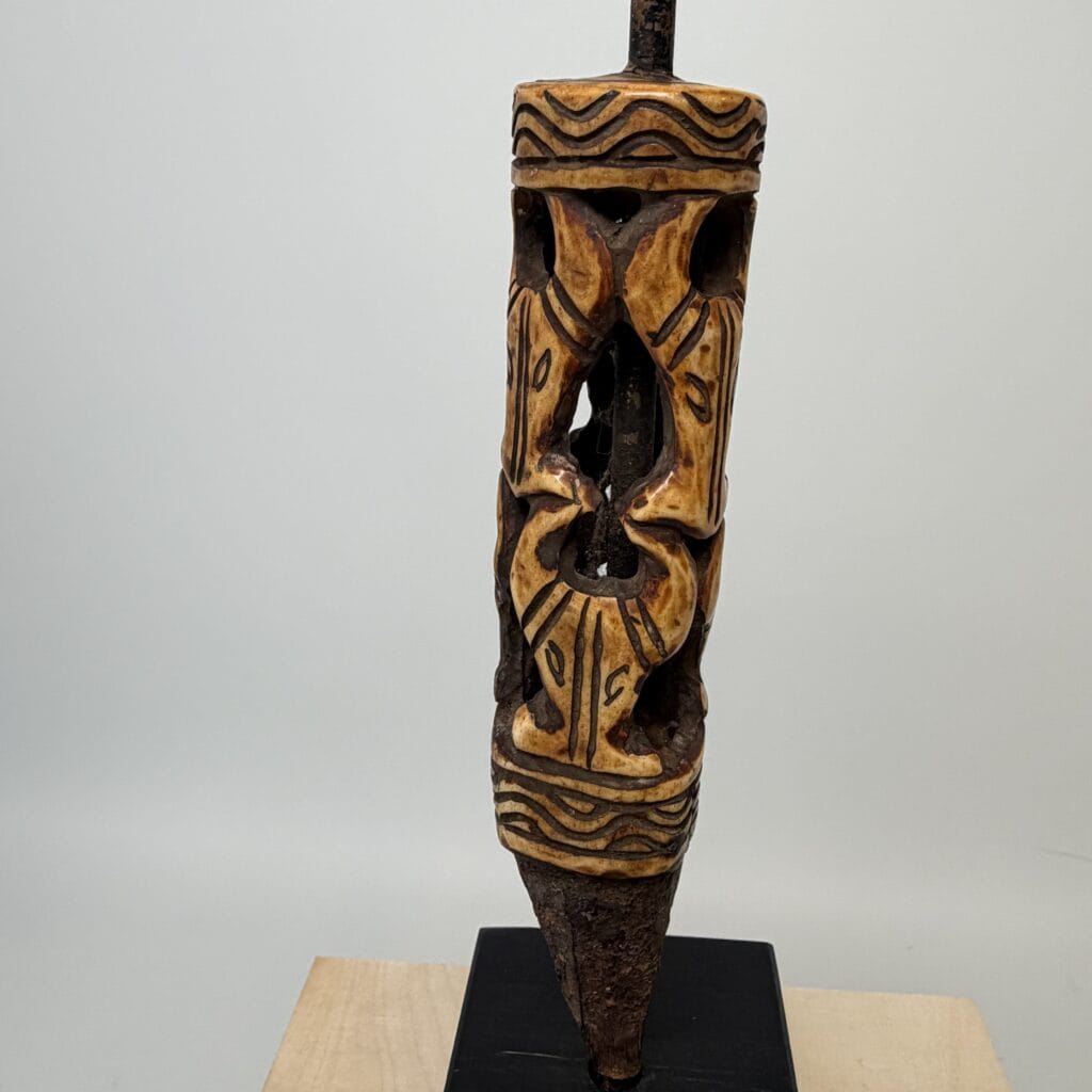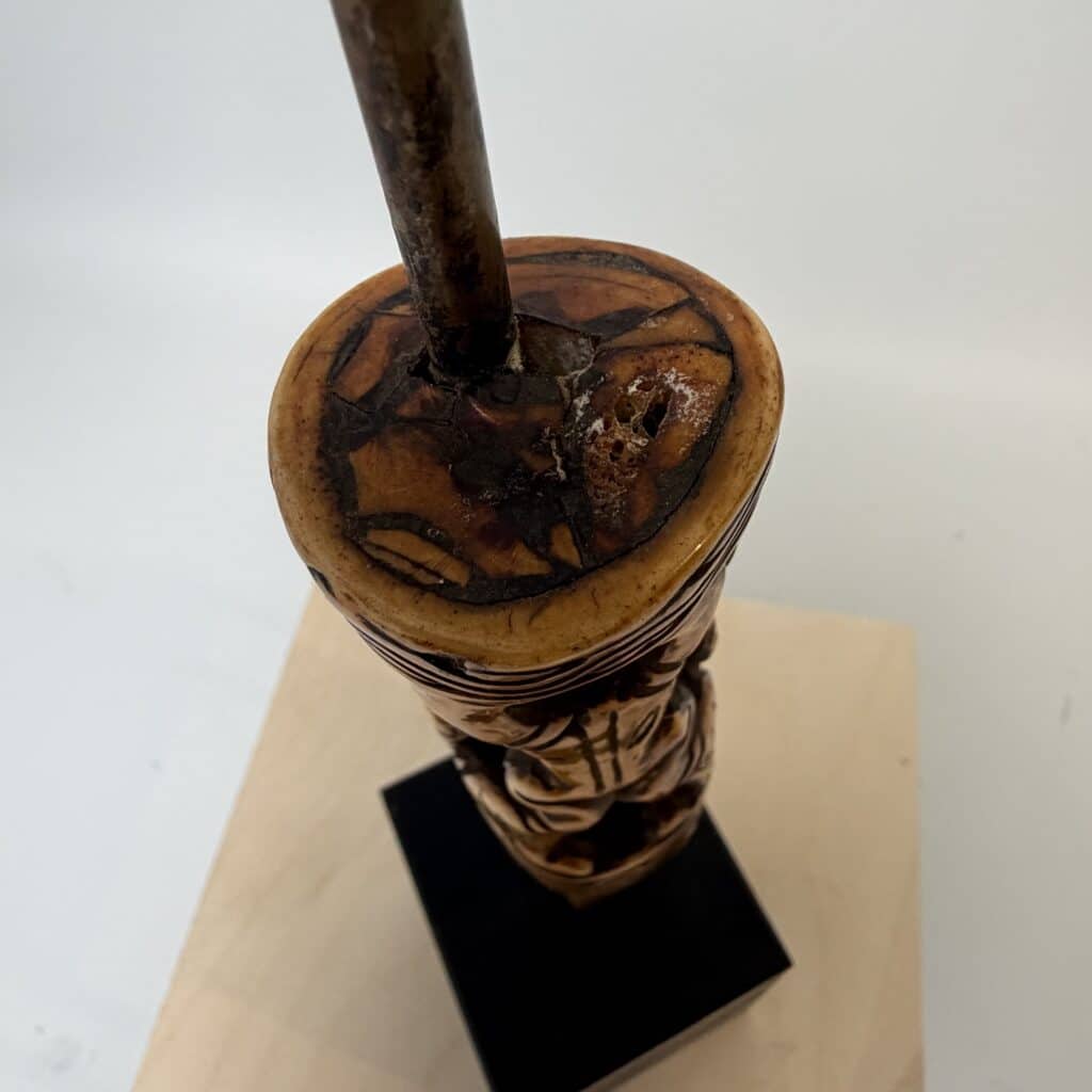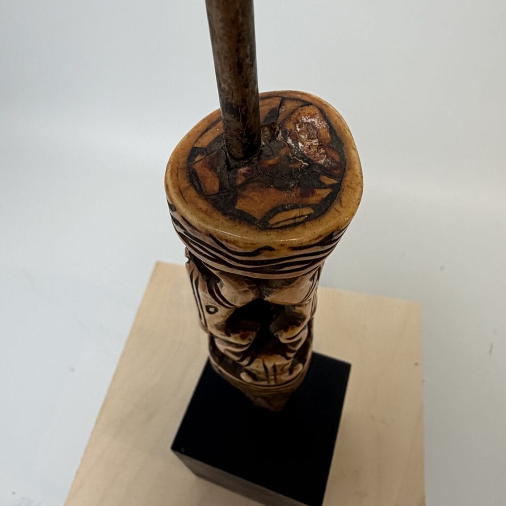 On the base we see a rusted metal tang indicating that this bone piece was the handle for a knife, short spear or ritual spike