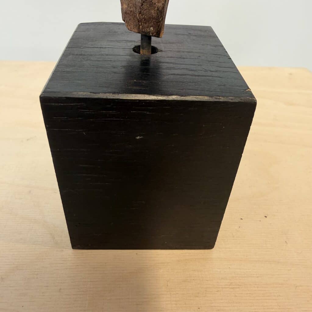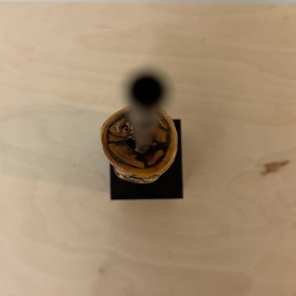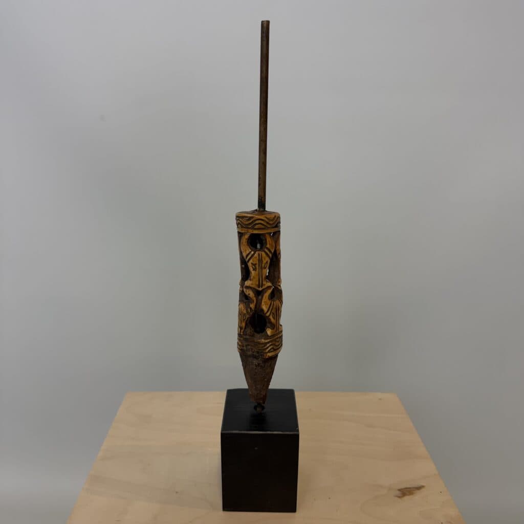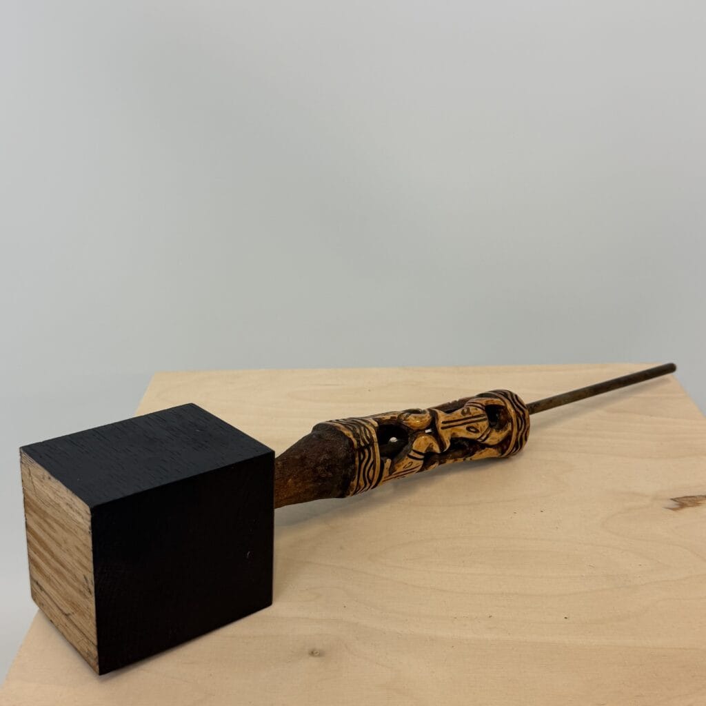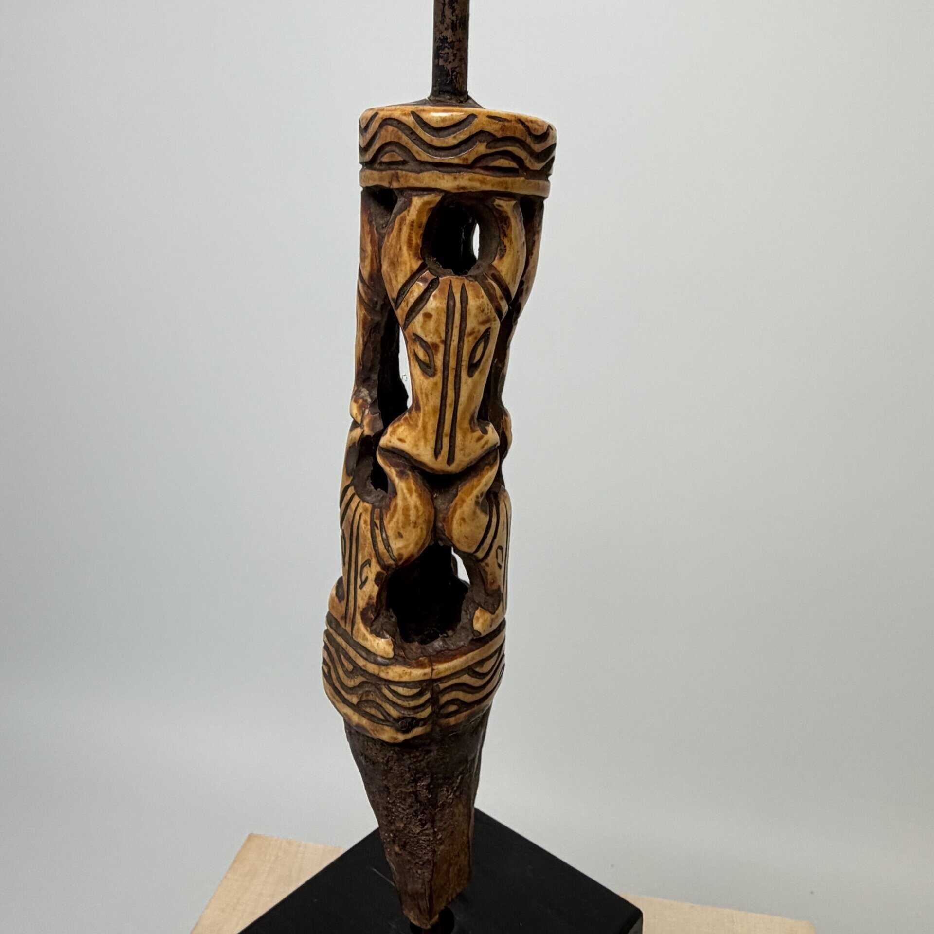 On the base we see a rusted metal tang indicating that this bone piece was the handle for a knife, short spear or ritual spike