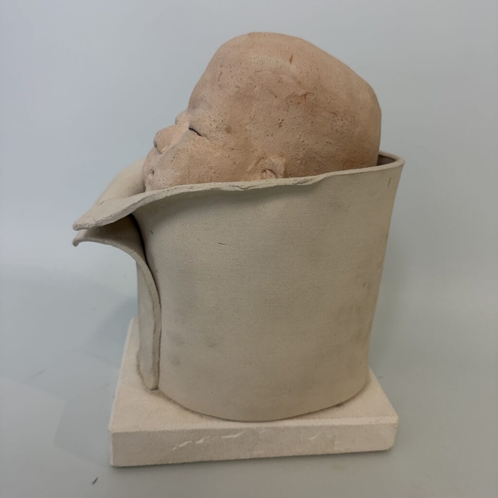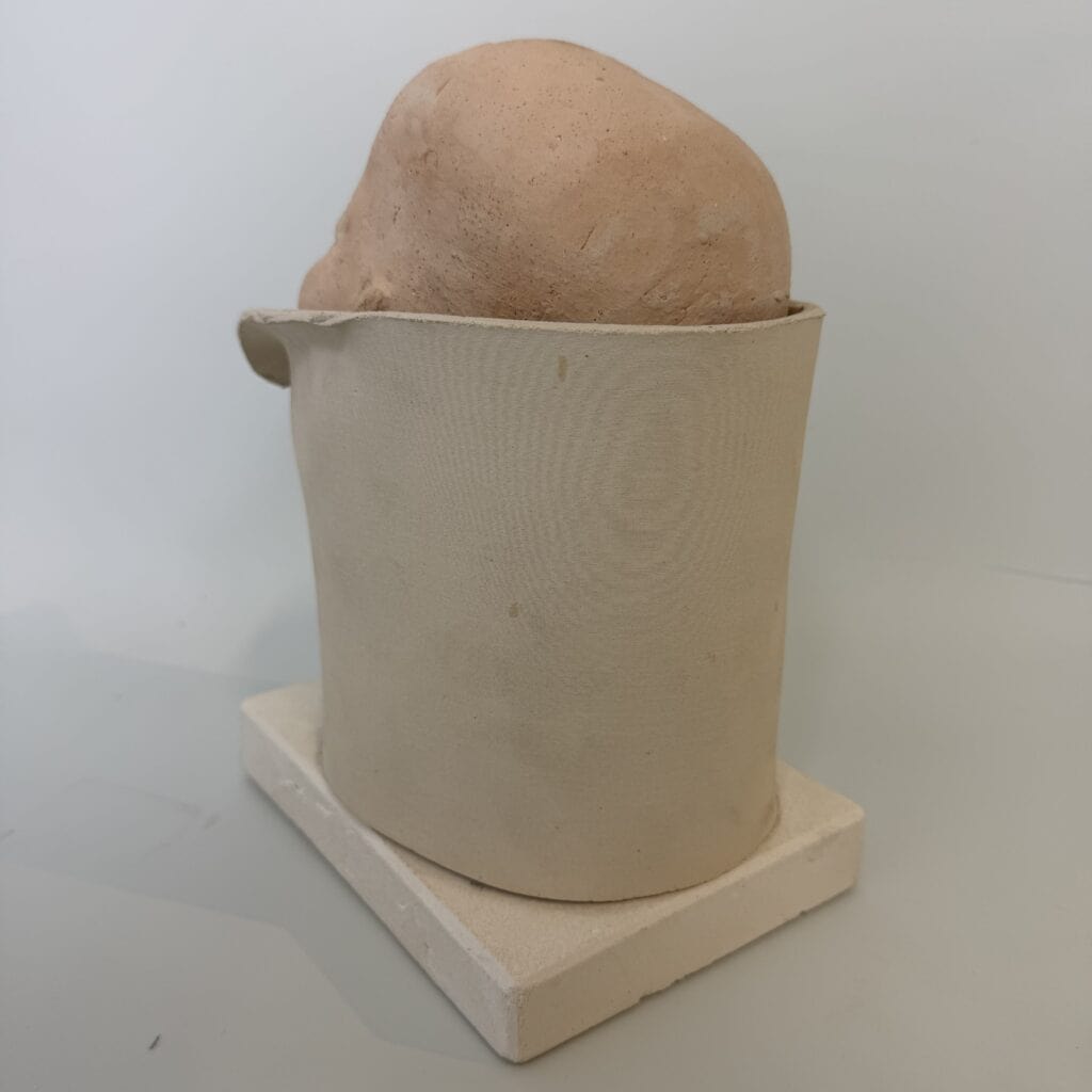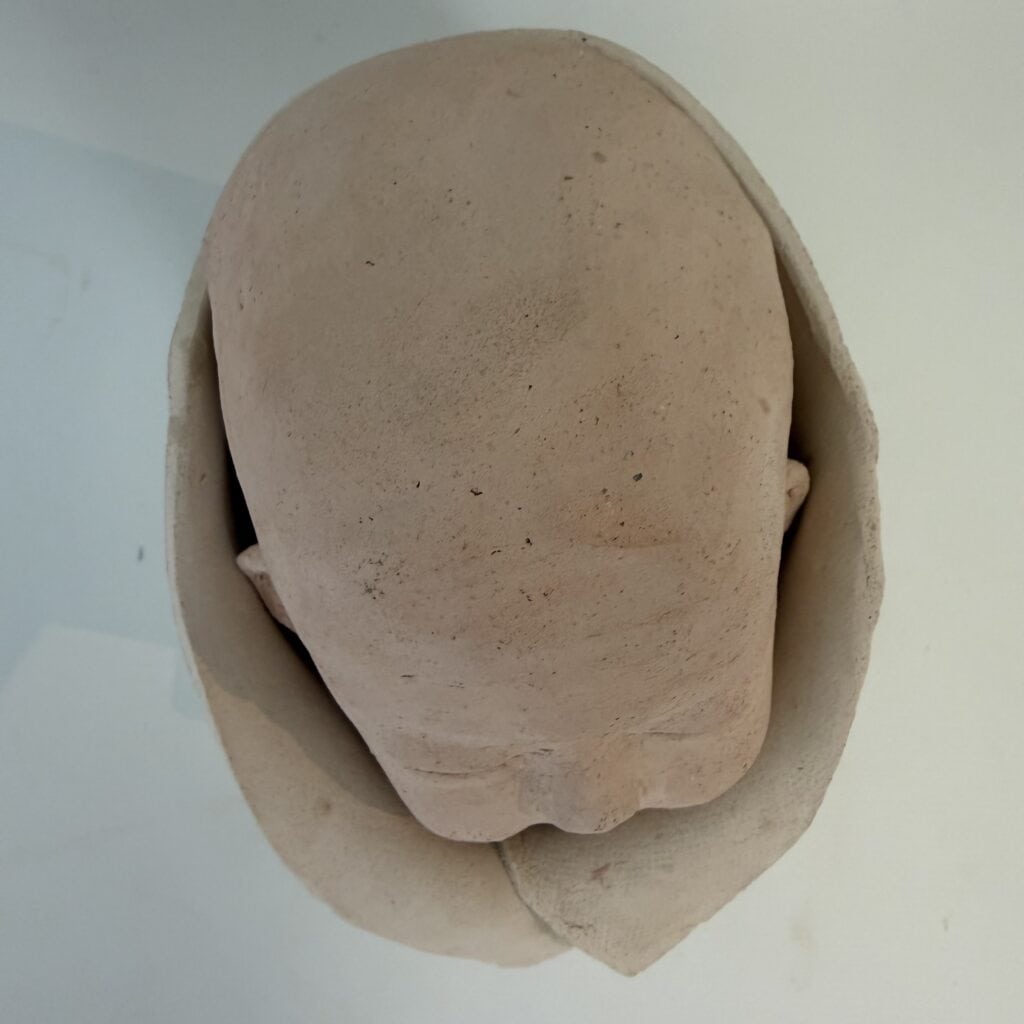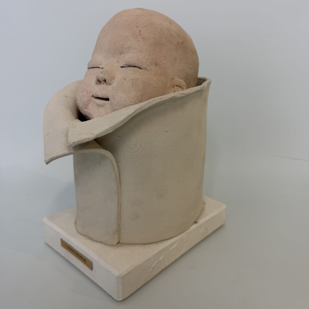 A ceramic sculpture of a sweet baby who seems to be peeking out for the first time. The baby’s head is finished in a light, salmon-pink colour, whilst the rest of the sculpture retains its natural clay colour