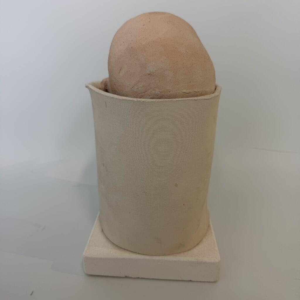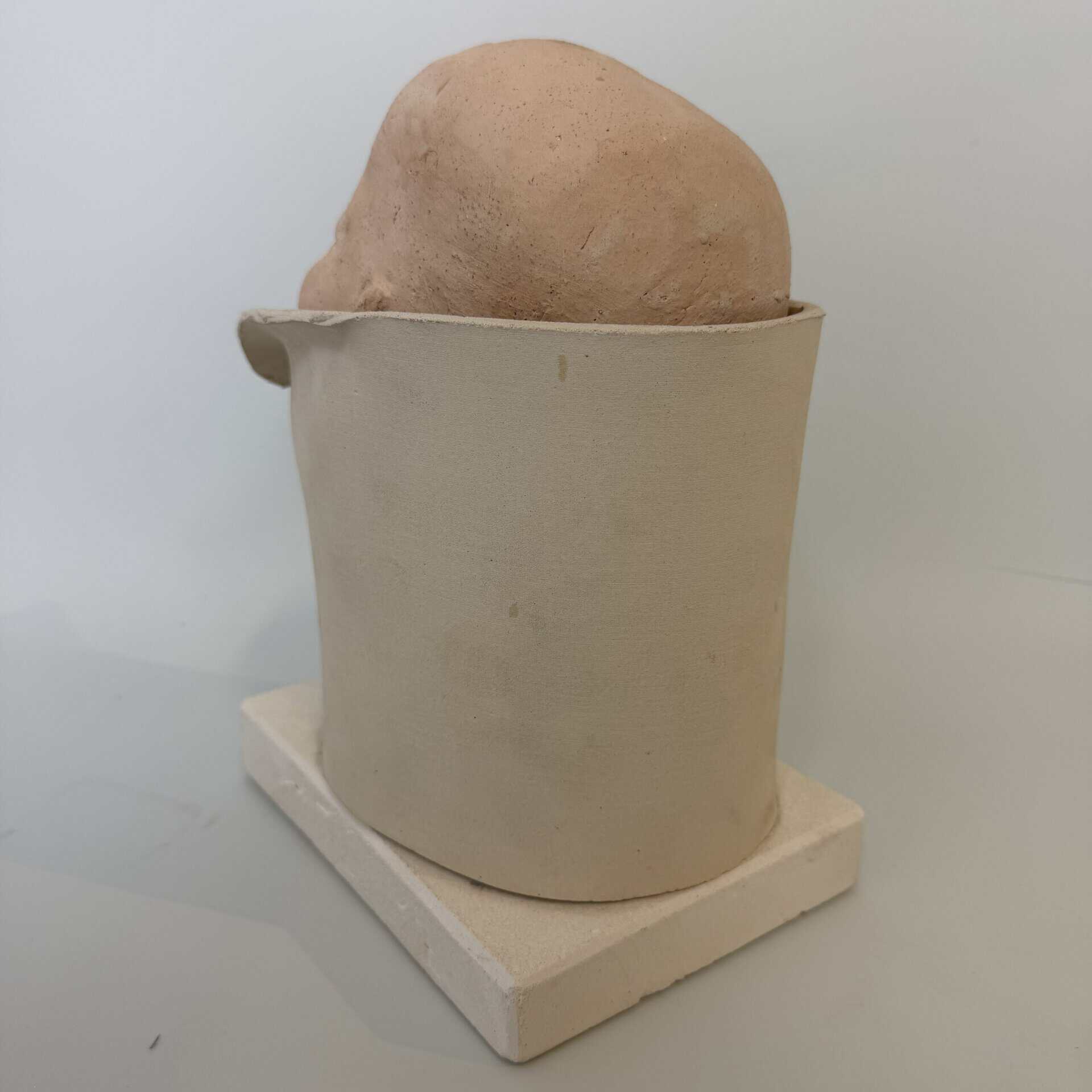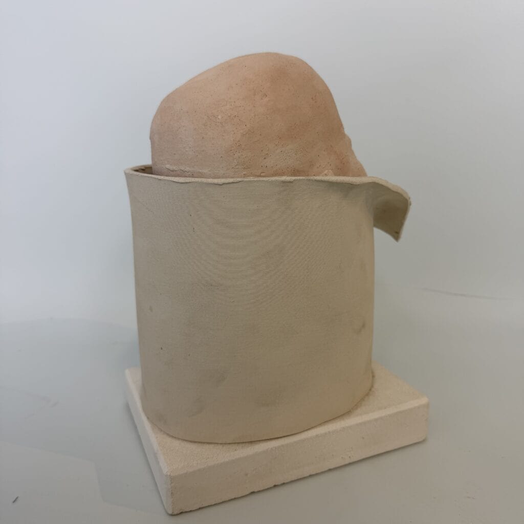A ceramic sculpture of a sweet baby who seems to be peeking out for the first time. The baby’s head is finished in a light, salmon-pink colour, whilst the rest of the sculpture retains its natural clay colour