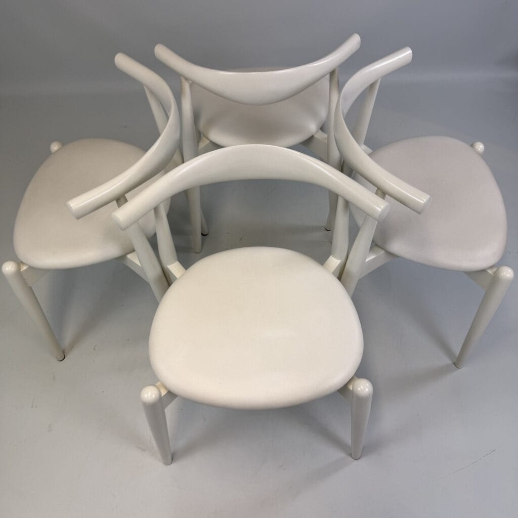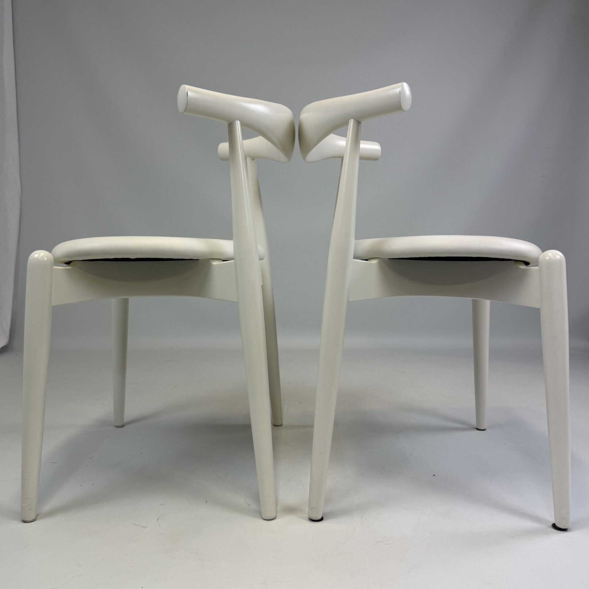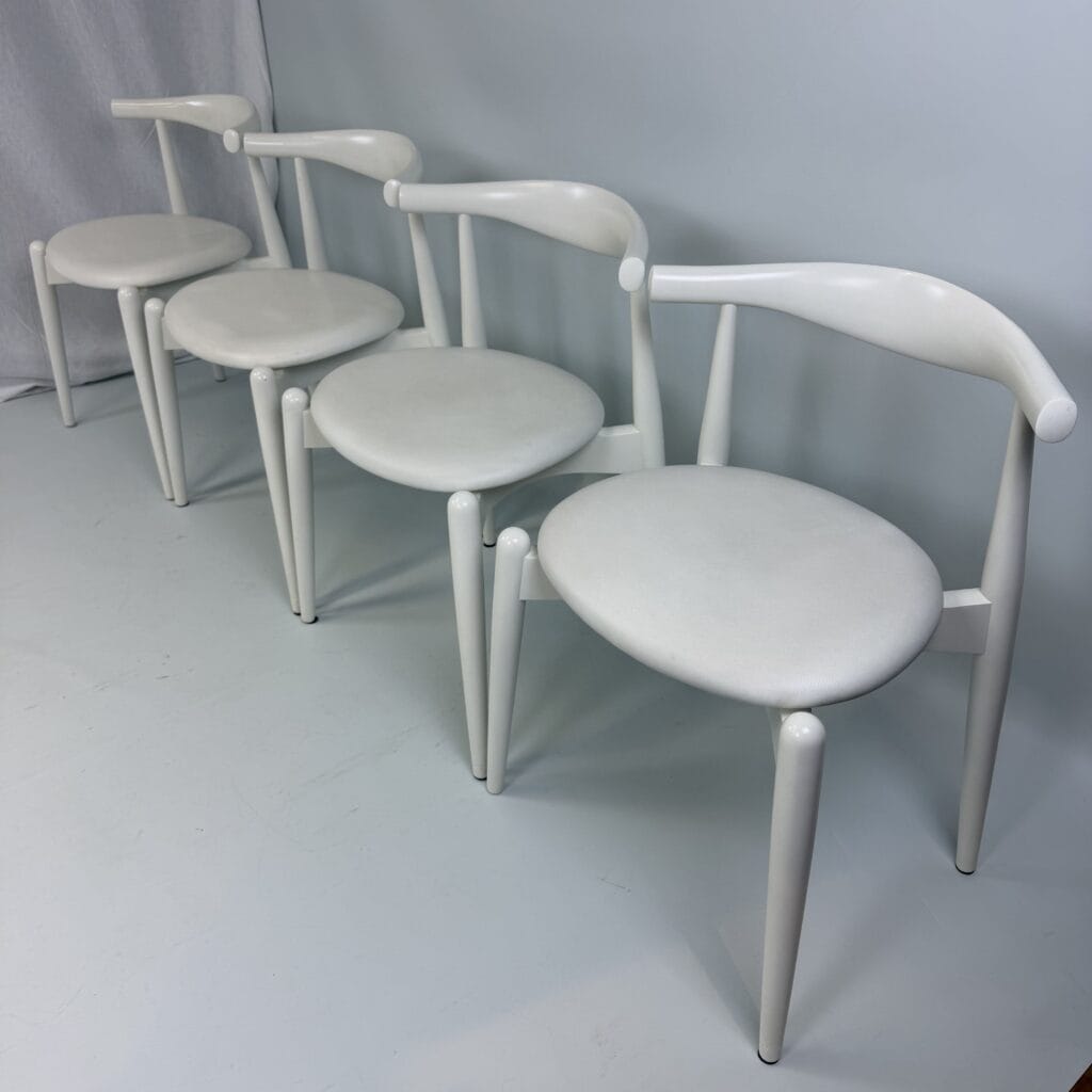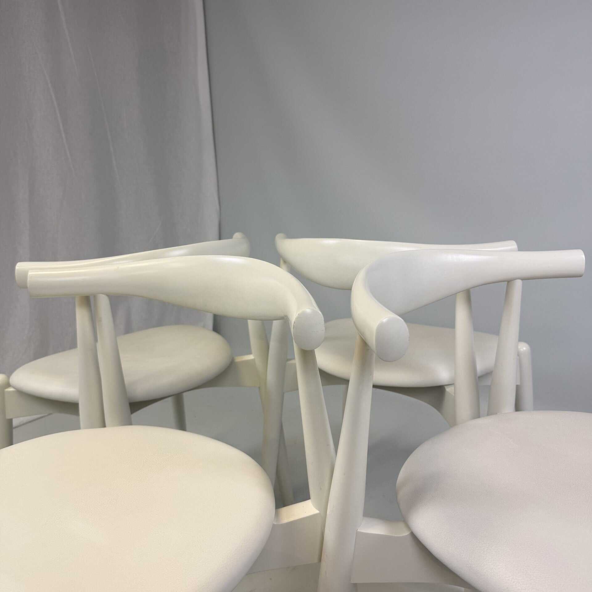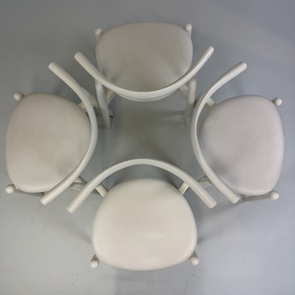 Suite of 4 white lacquered wooden frame and leather upholstery with a is the steam-bent backrest, crafted from a single piece of solid wood, which doubles as an elbow rest