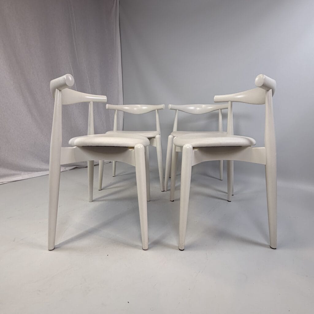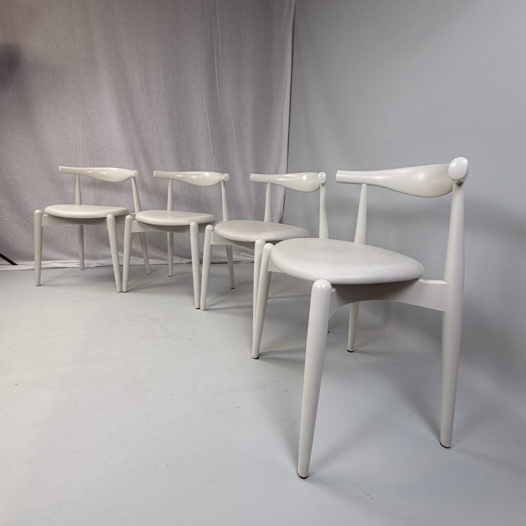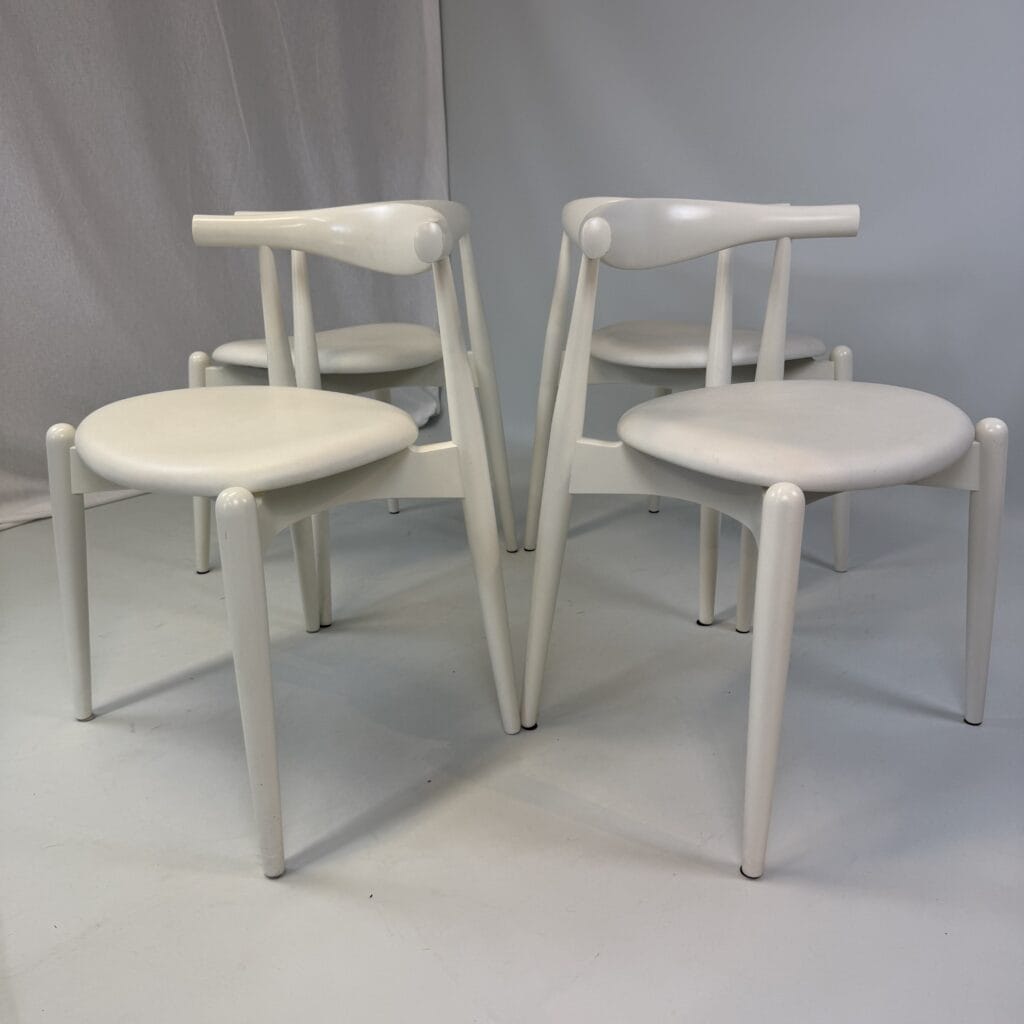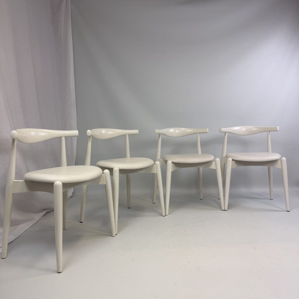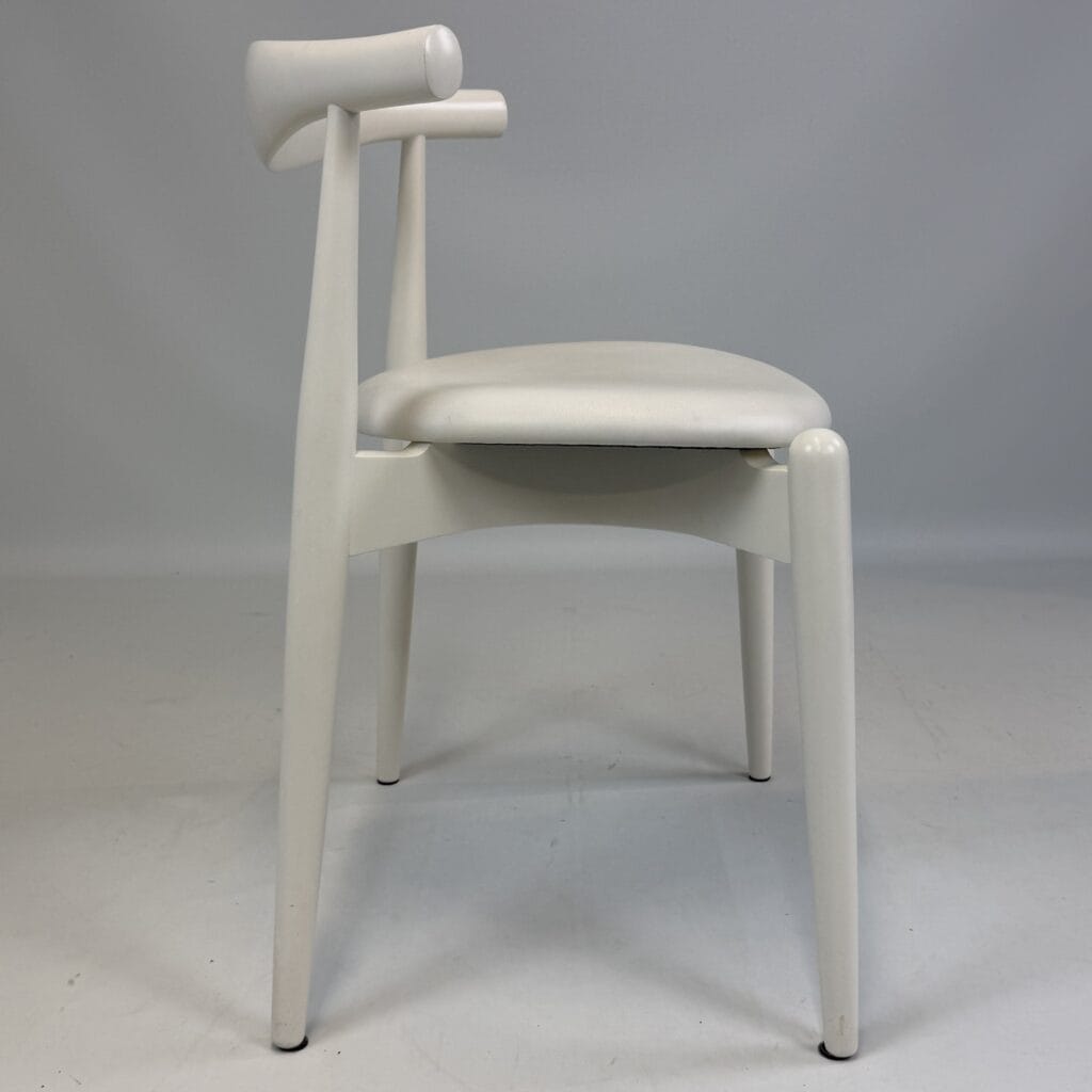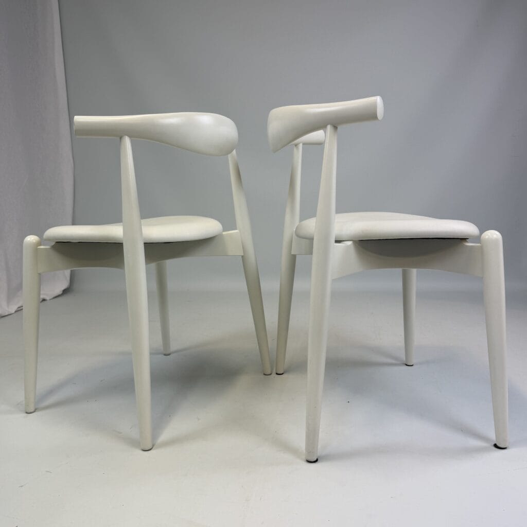 Suite of 4 white lacquered wooden frame and leather upholstery with a is the steam-bent backrest, crafted from a single piece of solid wood, which doubles as an elbow rest