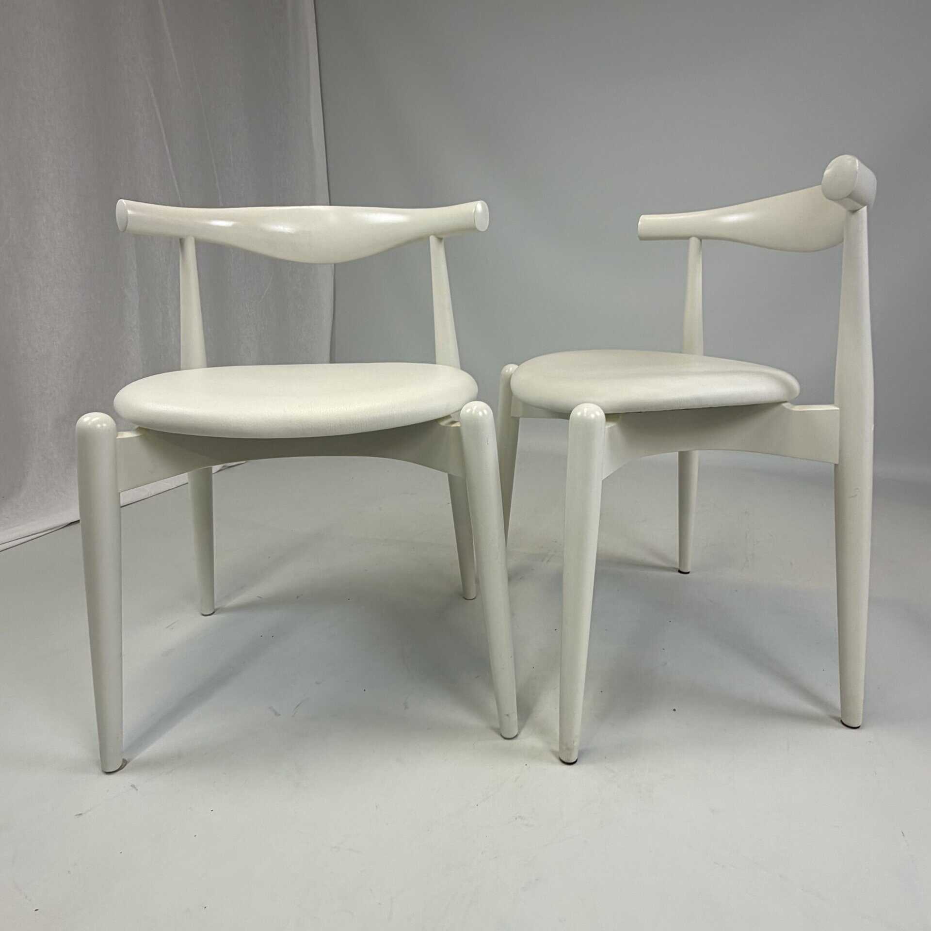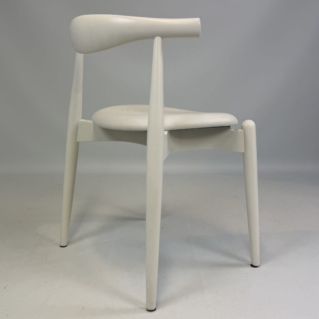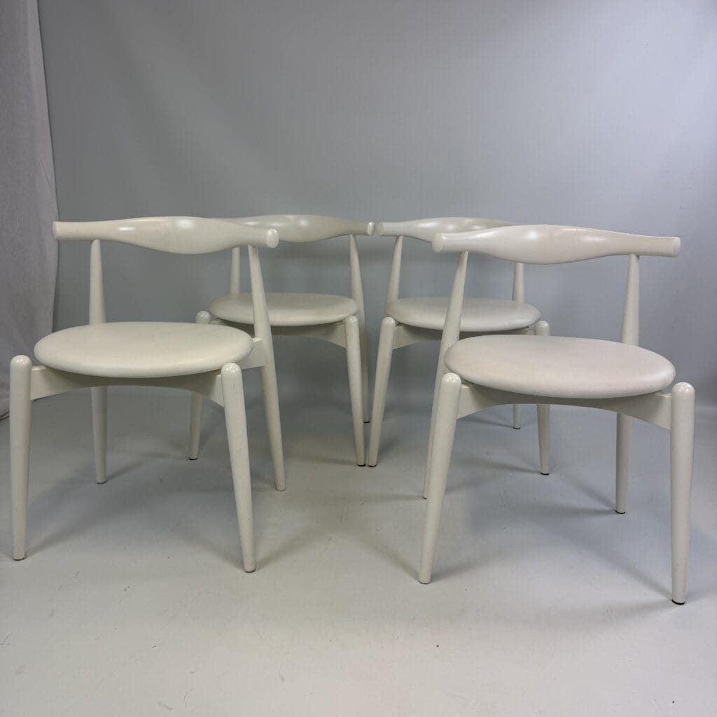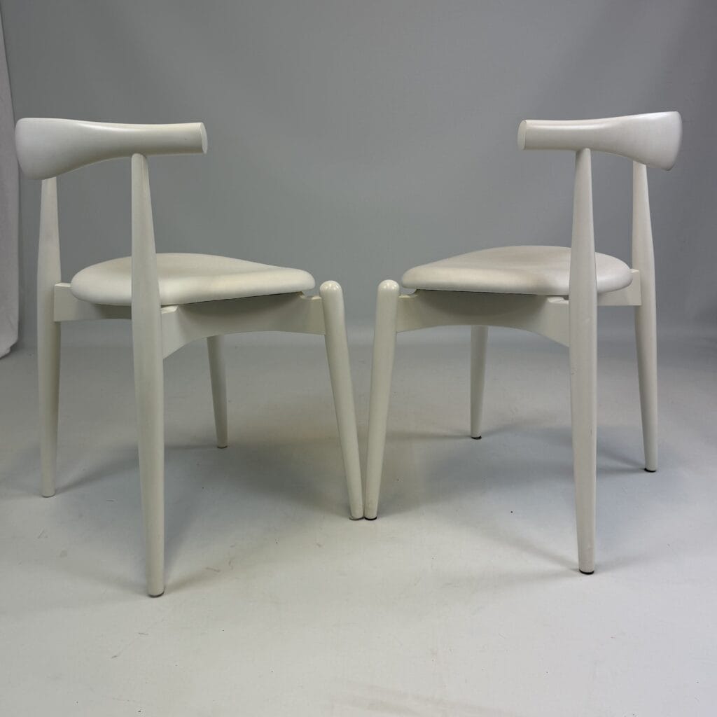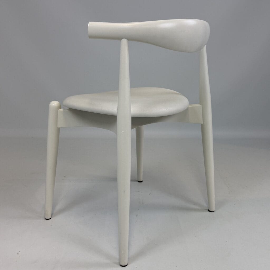 Suite of 4 white lacquered wooden frame and leather upholstery with a is the steam-bent backrest, crafted from a single piece of solid wood, which doubles as an elbow rest