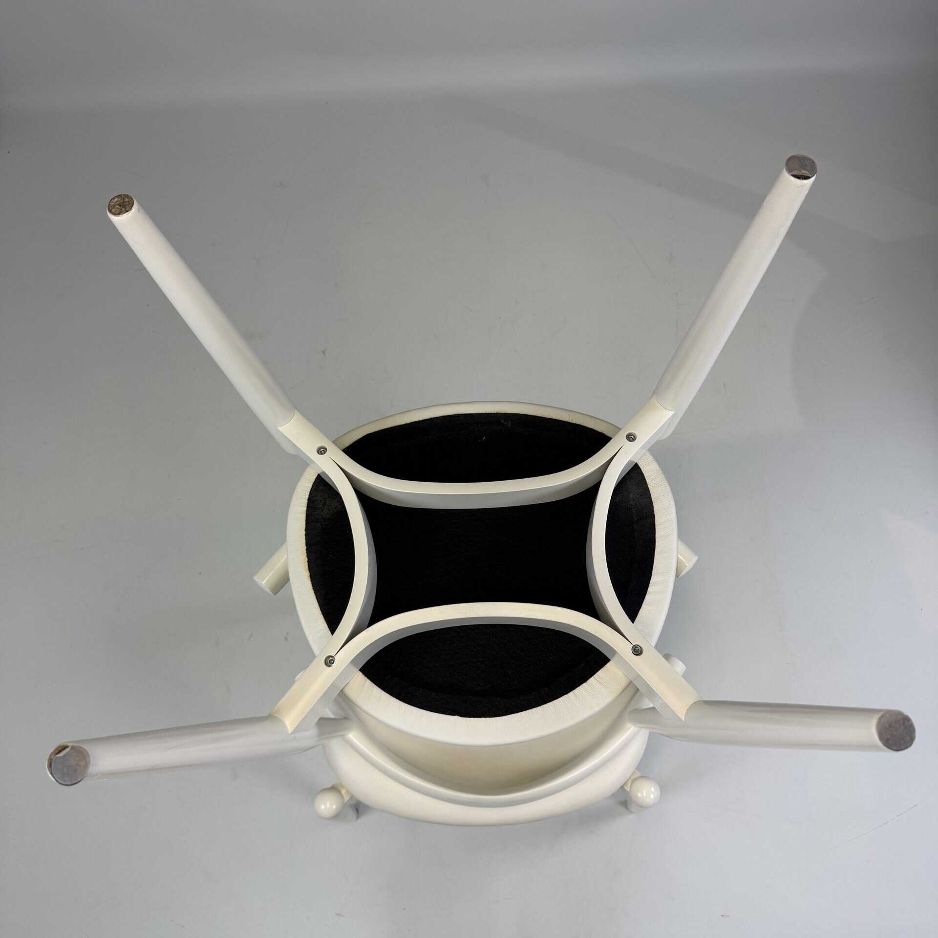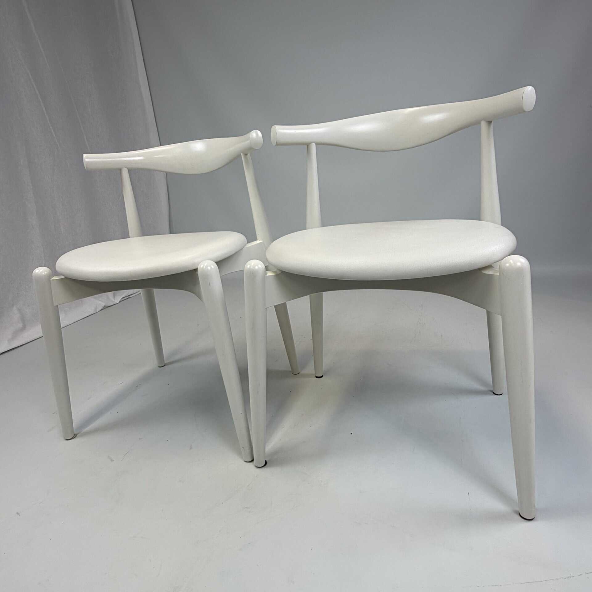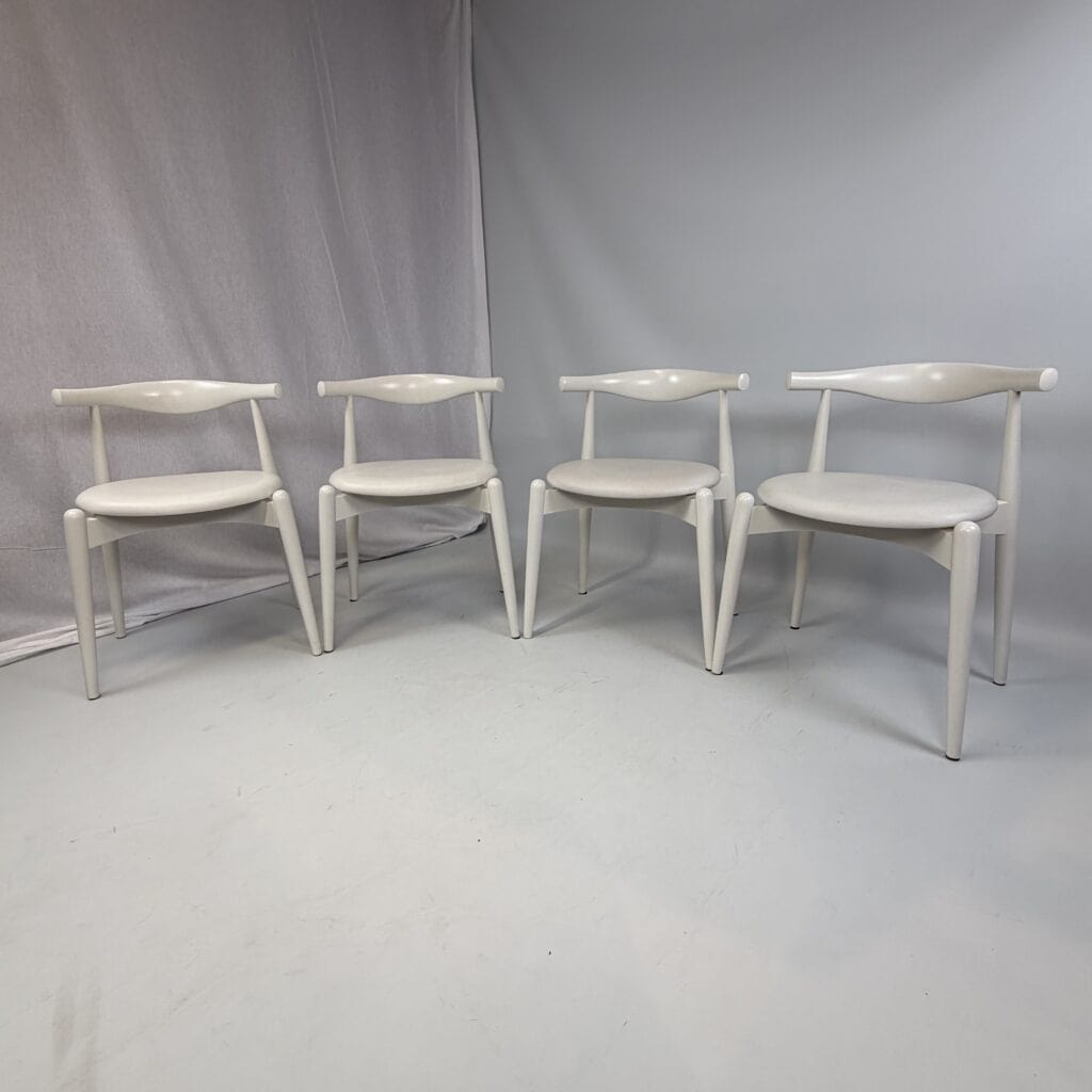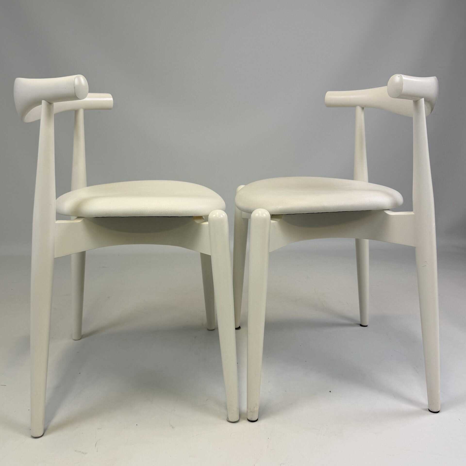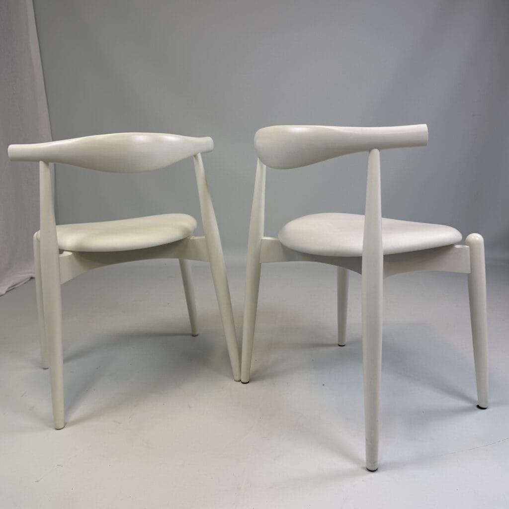 Suite of 4 white lacquered wooden frame and leather upholstery with a is the steam-bent backrest, crafted from a single piece of solid wood, which doubles as an elbow rest