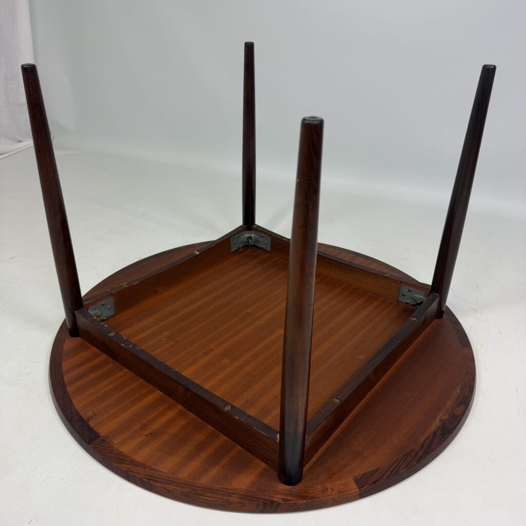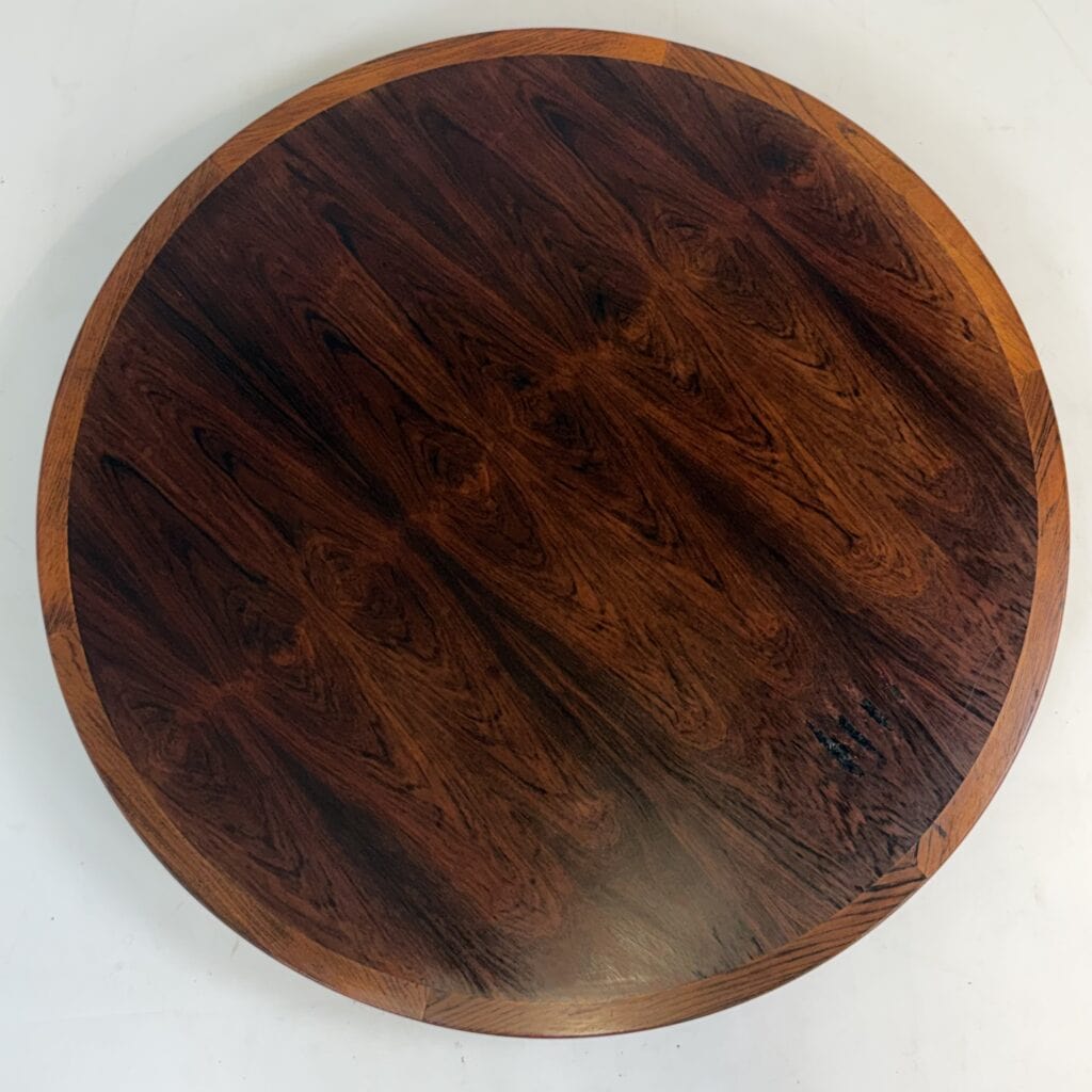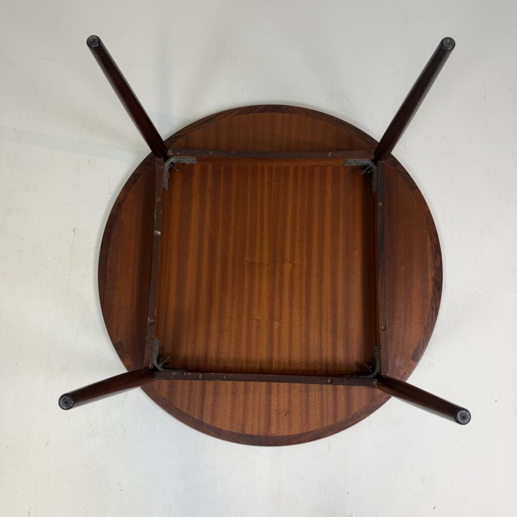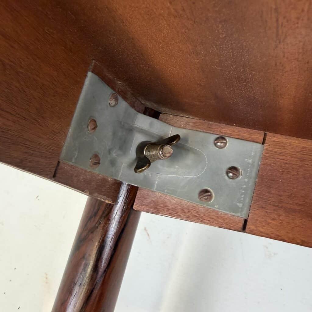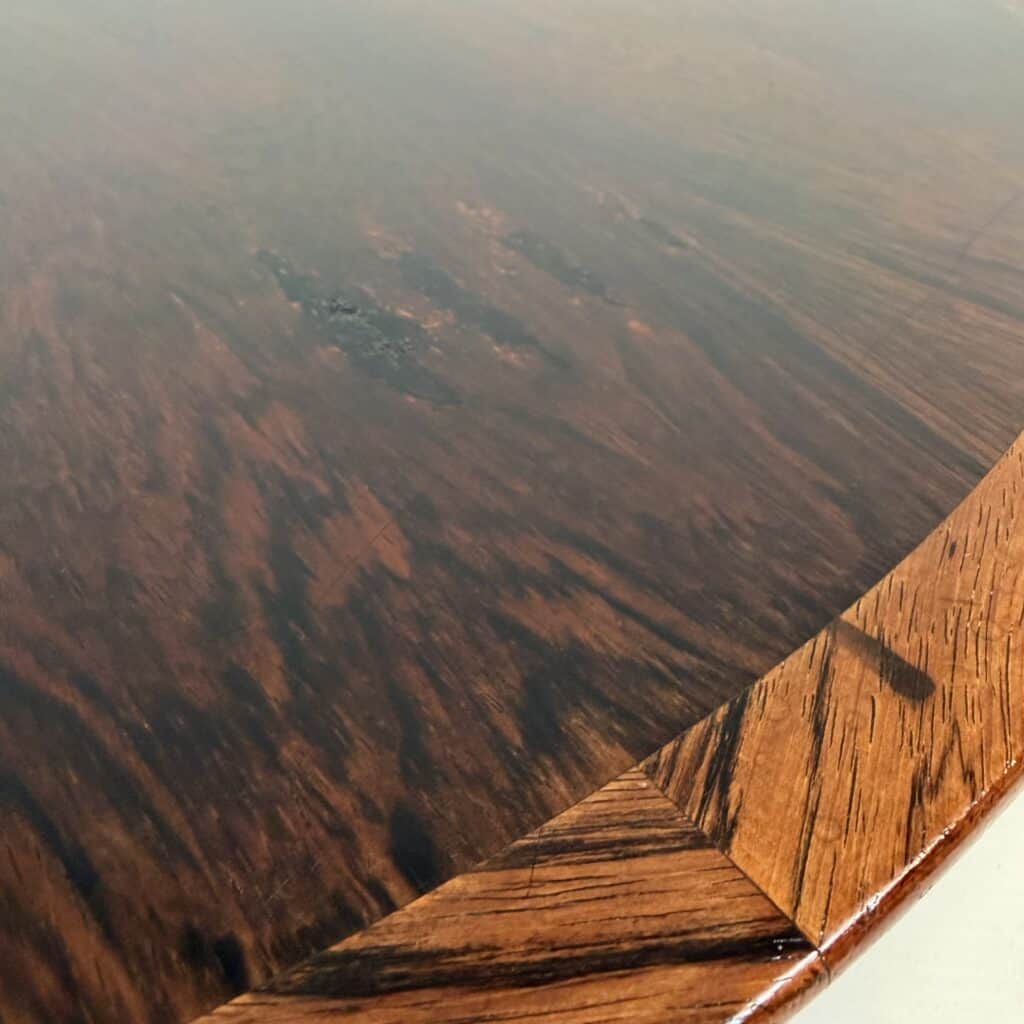 The Brazilian rosewood bookmatching veneer top has a deep, dark brown colour with almost black grain. The “flaming” effect in the wood in your photo is very striking, which indicates high-quality timber. It has a lightstained rim which is constructed from various segments of solid rosewood, cut at a beautiful 45-degree angle and joined together in a circle. This served not only as a decorative feature, but also protected the delicate edges of the thin veneer from knocks and chipping