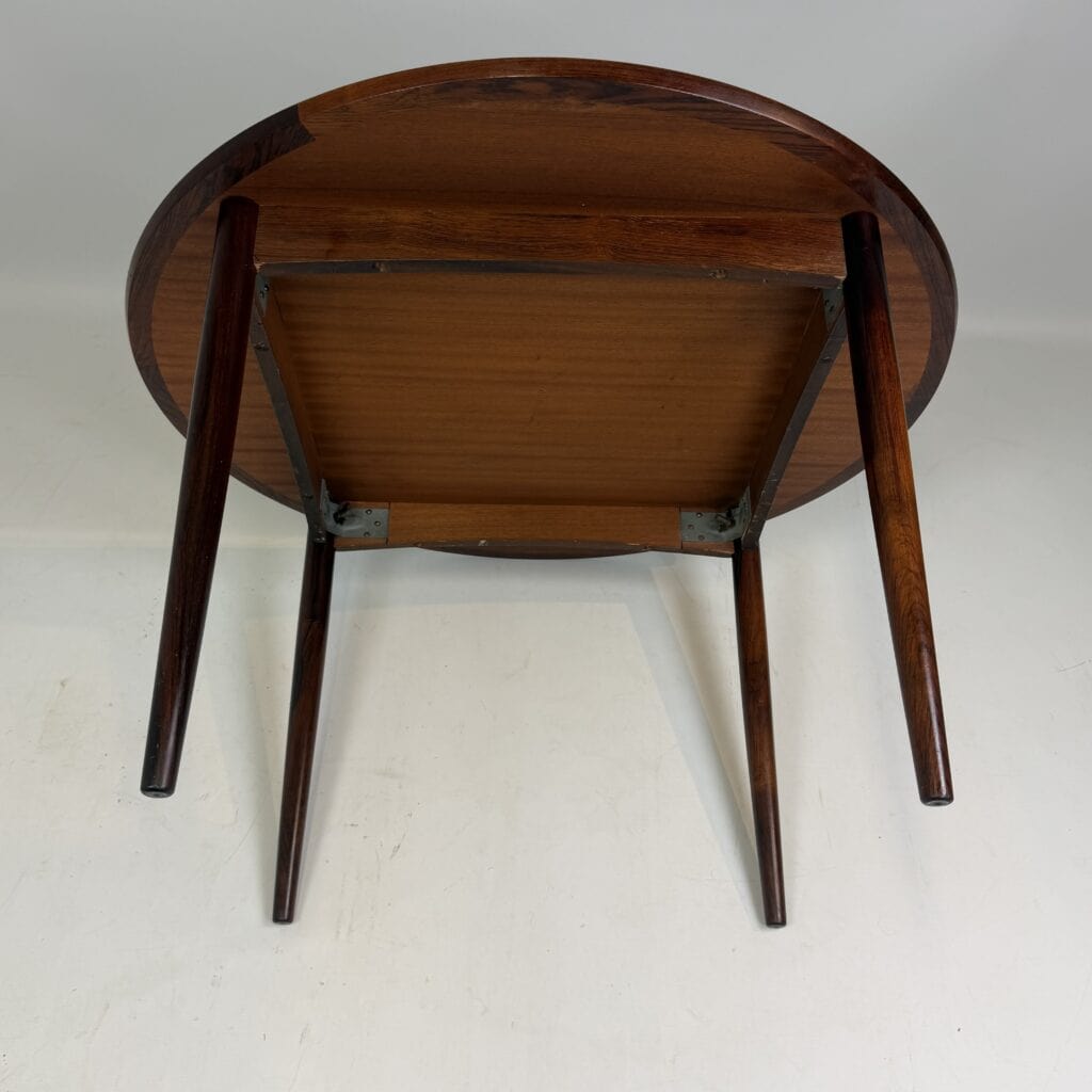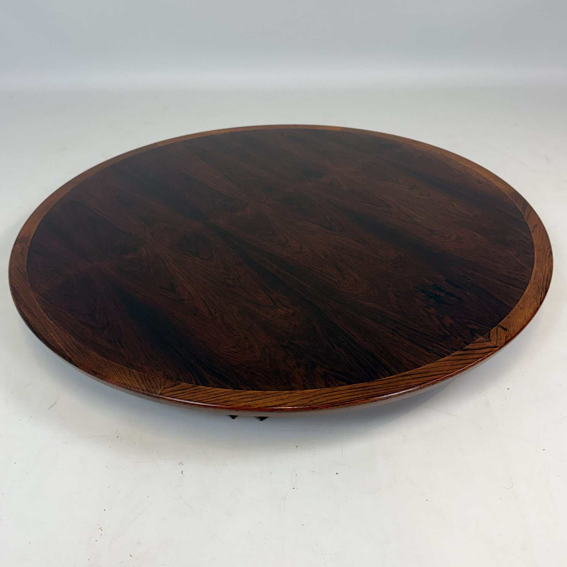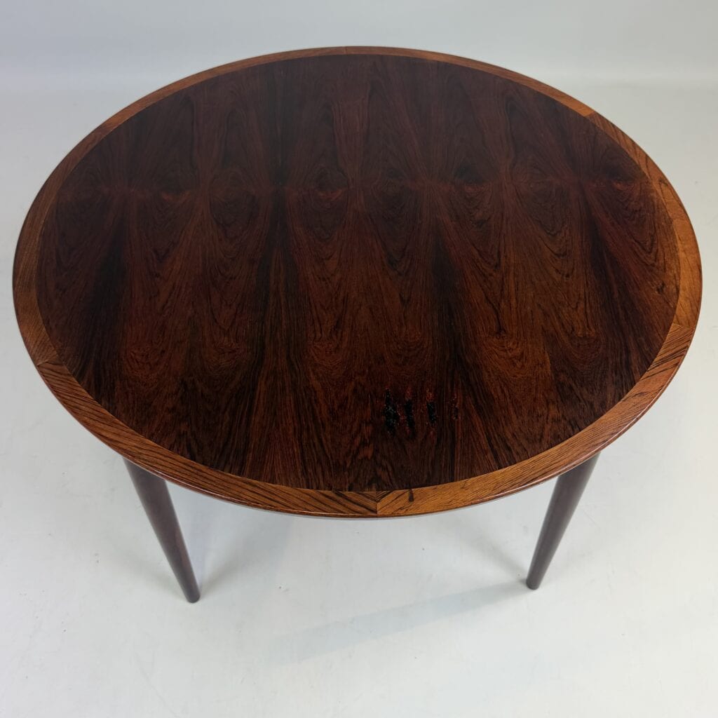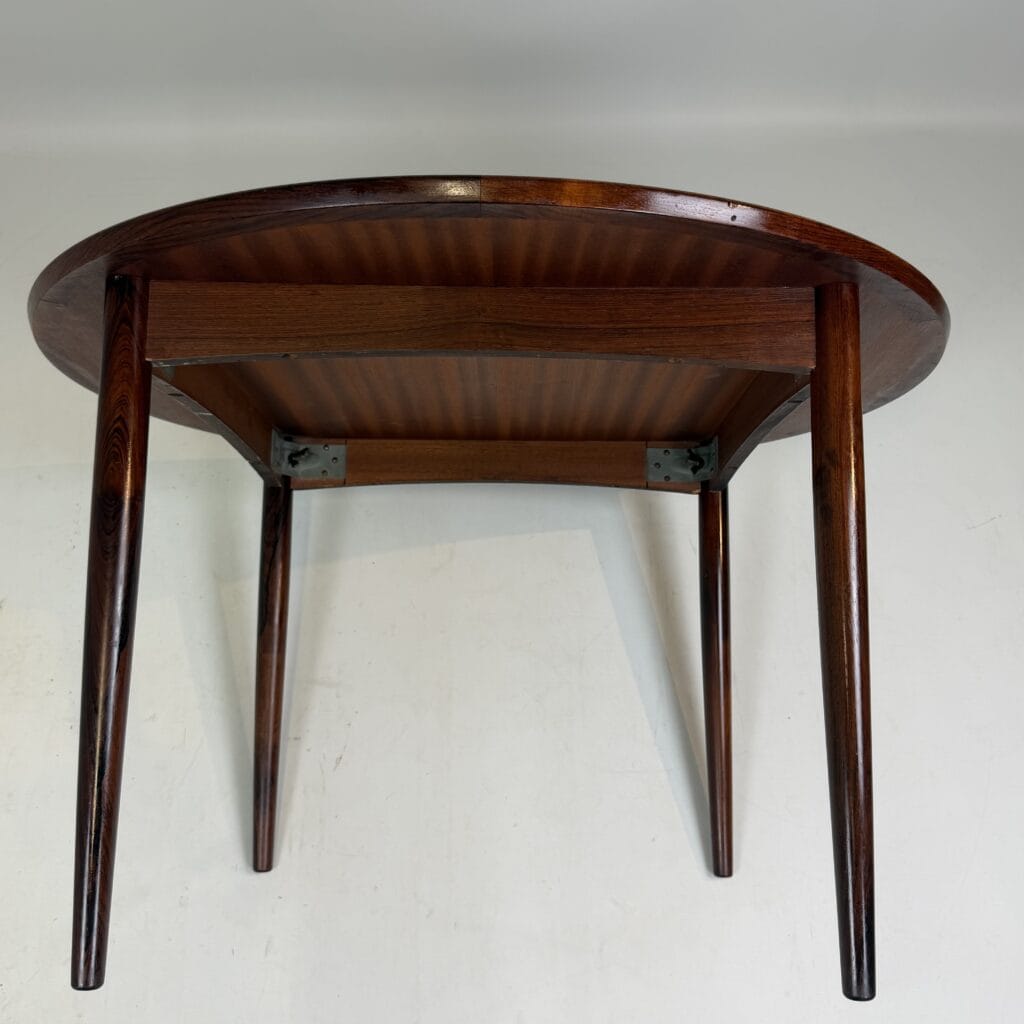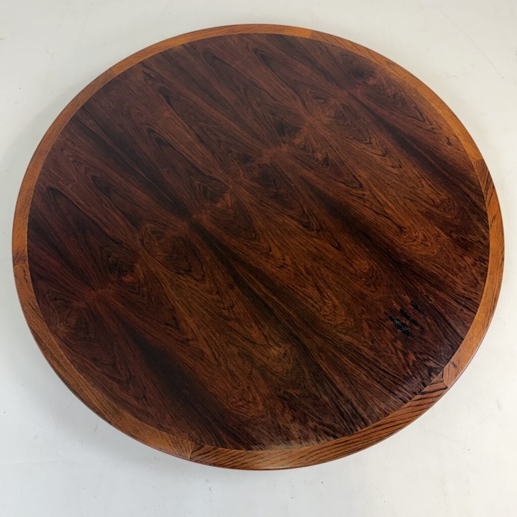 The Brazilian rosewood bookmatching veneer top has a deep, dark brown colour with almost black grain. The “flaming” effect in the wood in your photo is very striking, which indicates high-quality timber. It has a lightstained rim which is constructed from various segments of solid rosewood, cut at a beautiful 45-degree angle and joined together in a circle. This served not only as a decorative feature, but also protected the delicate edges of the thin veneer from knocks and chipping
