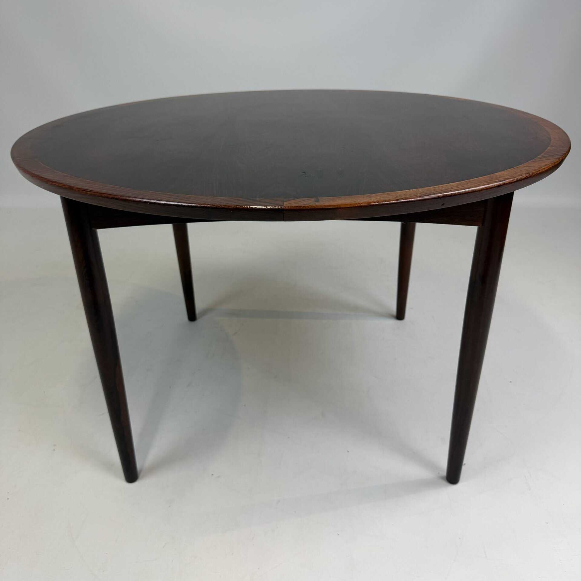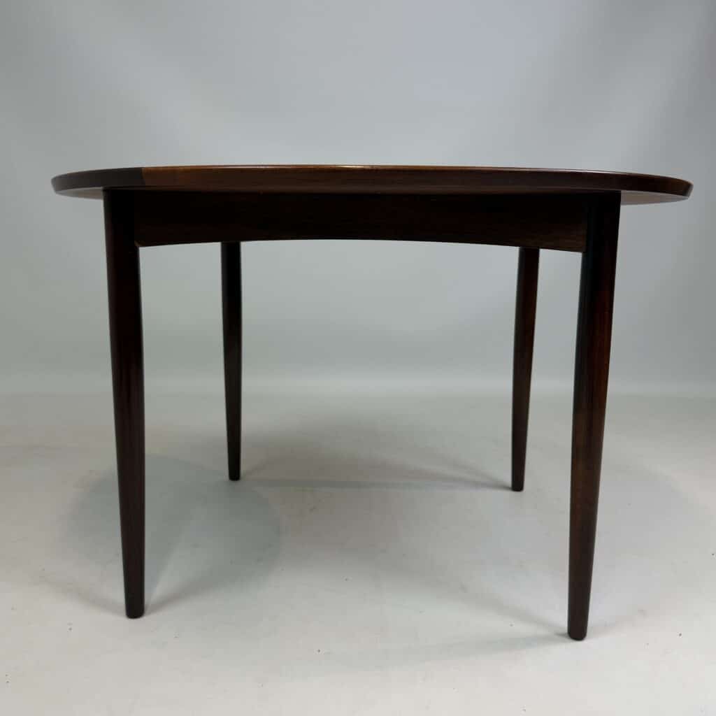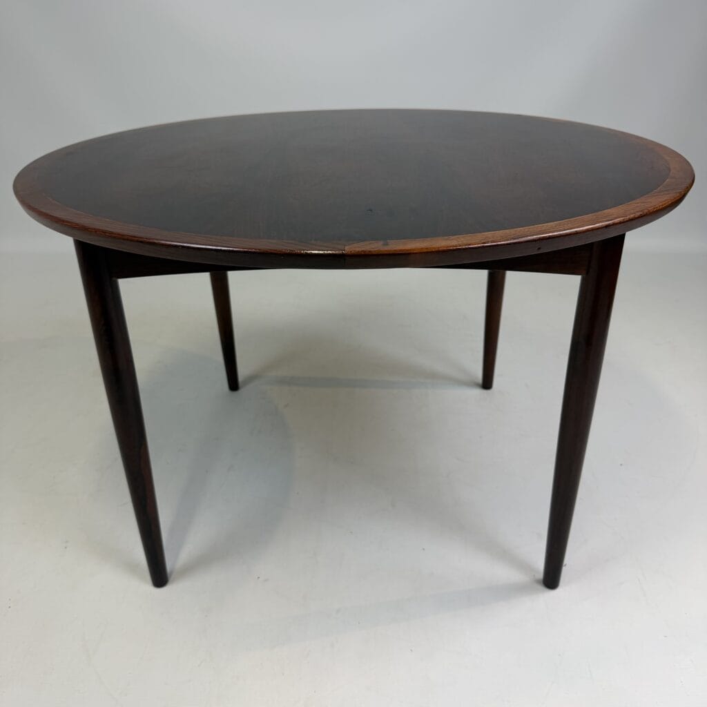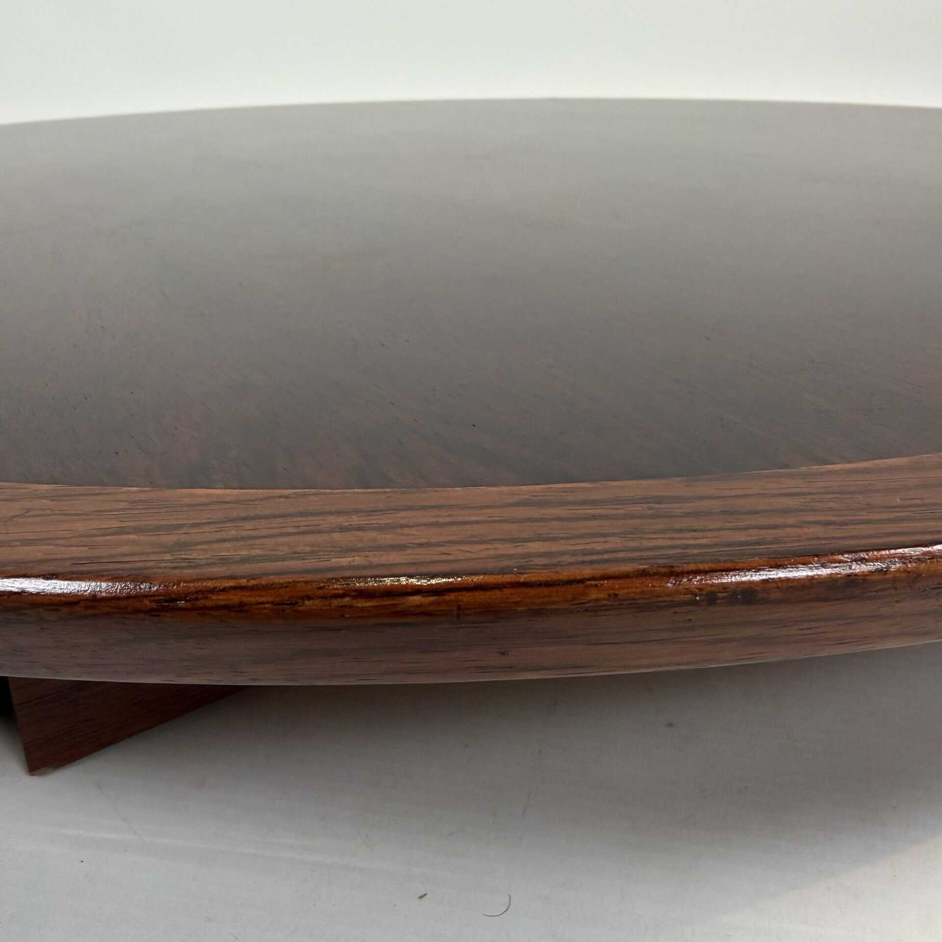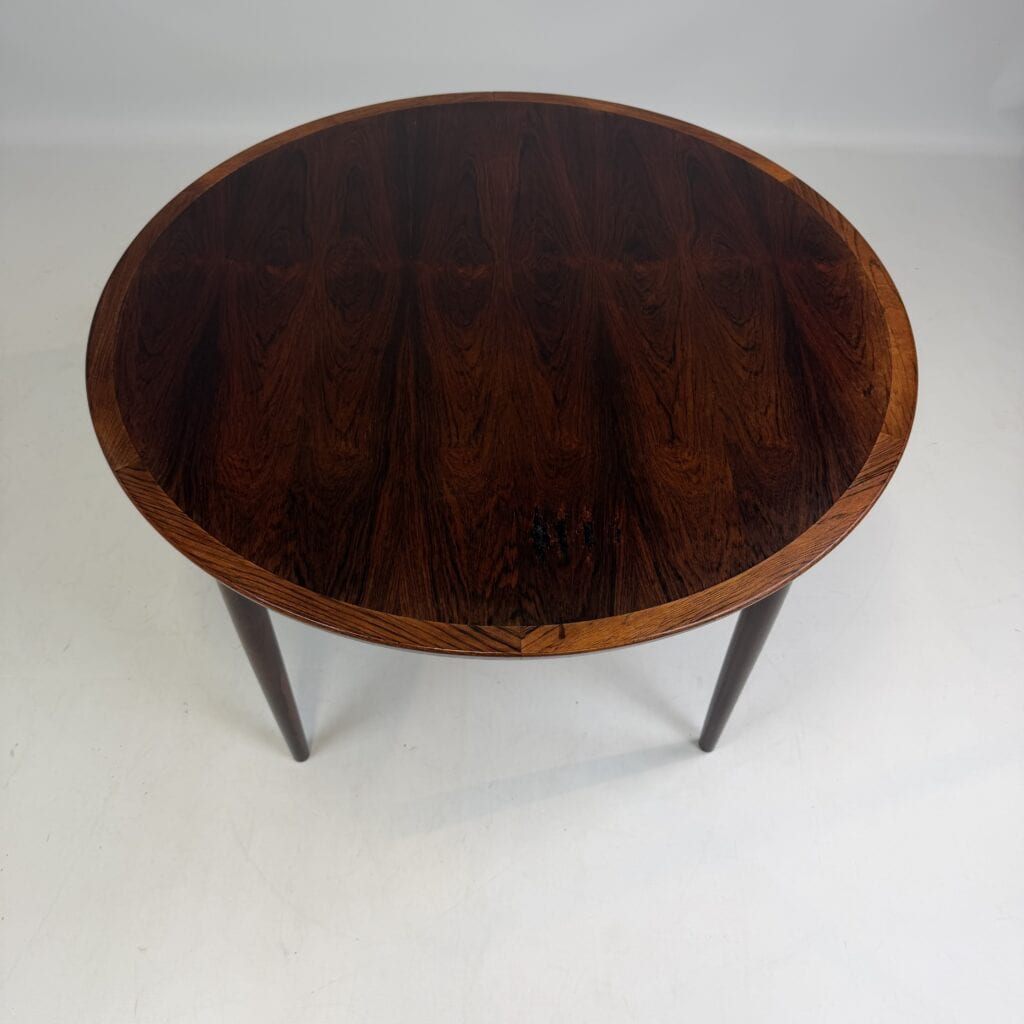 The Brazilian rosewood bookmatching veneer top has a deep, dark brown colour with almost black grain. The “flaming” effect in the wood in your photo is very striking, which indicates high-quality timber. It has a lightstained rim which is constructed from various segments of solid rosewood, cut at a beautiful 45-degree angle and joined together in a circle. This served not only as a decorative feature, but also protected the delicate edges of the thin veneer from knocks and chipping