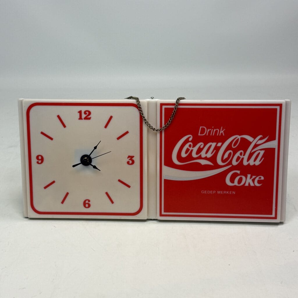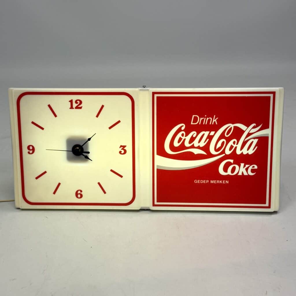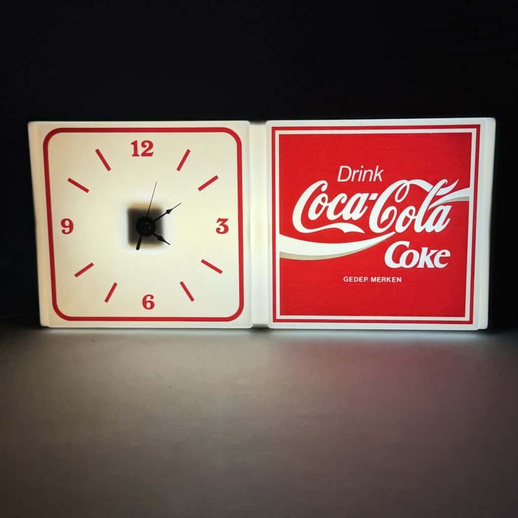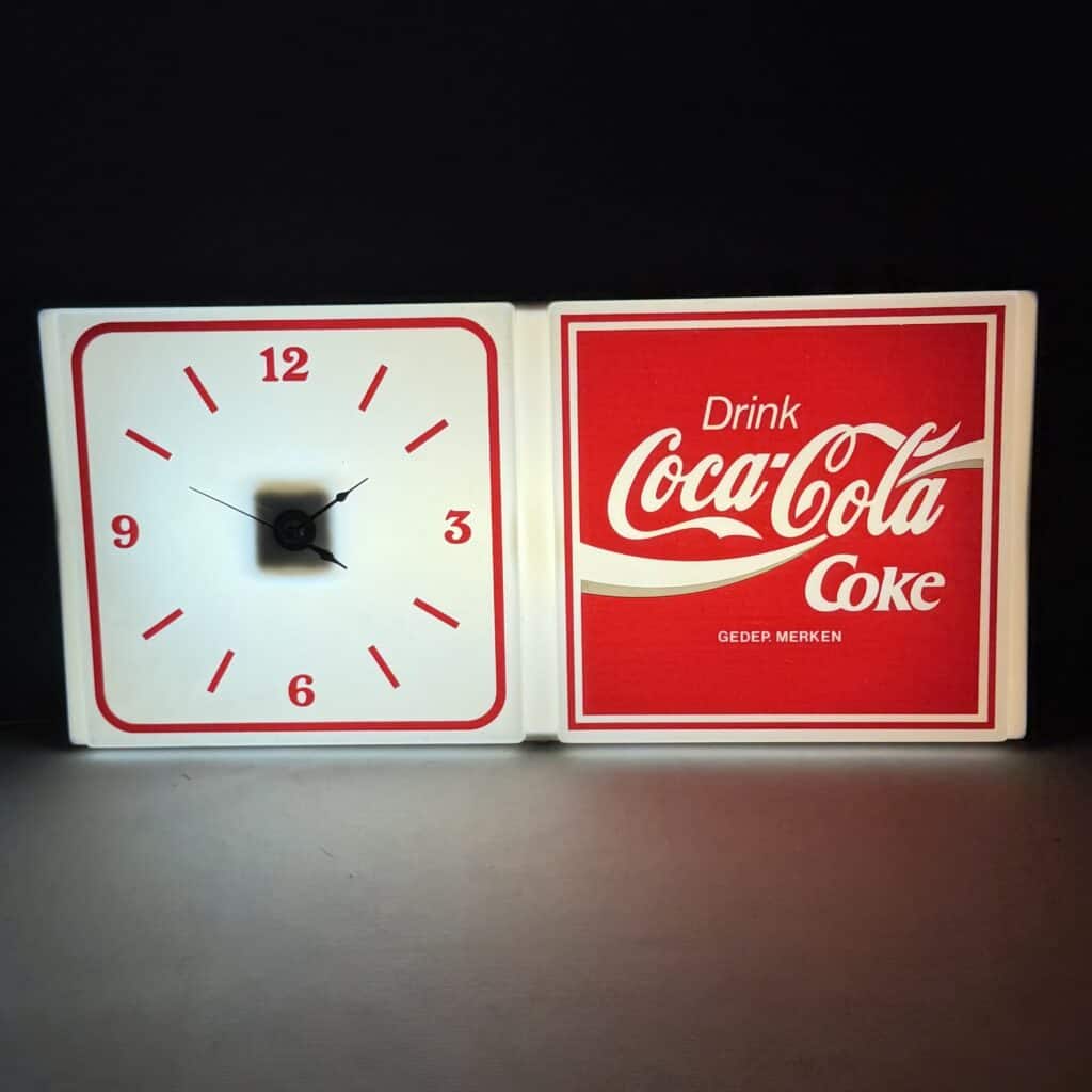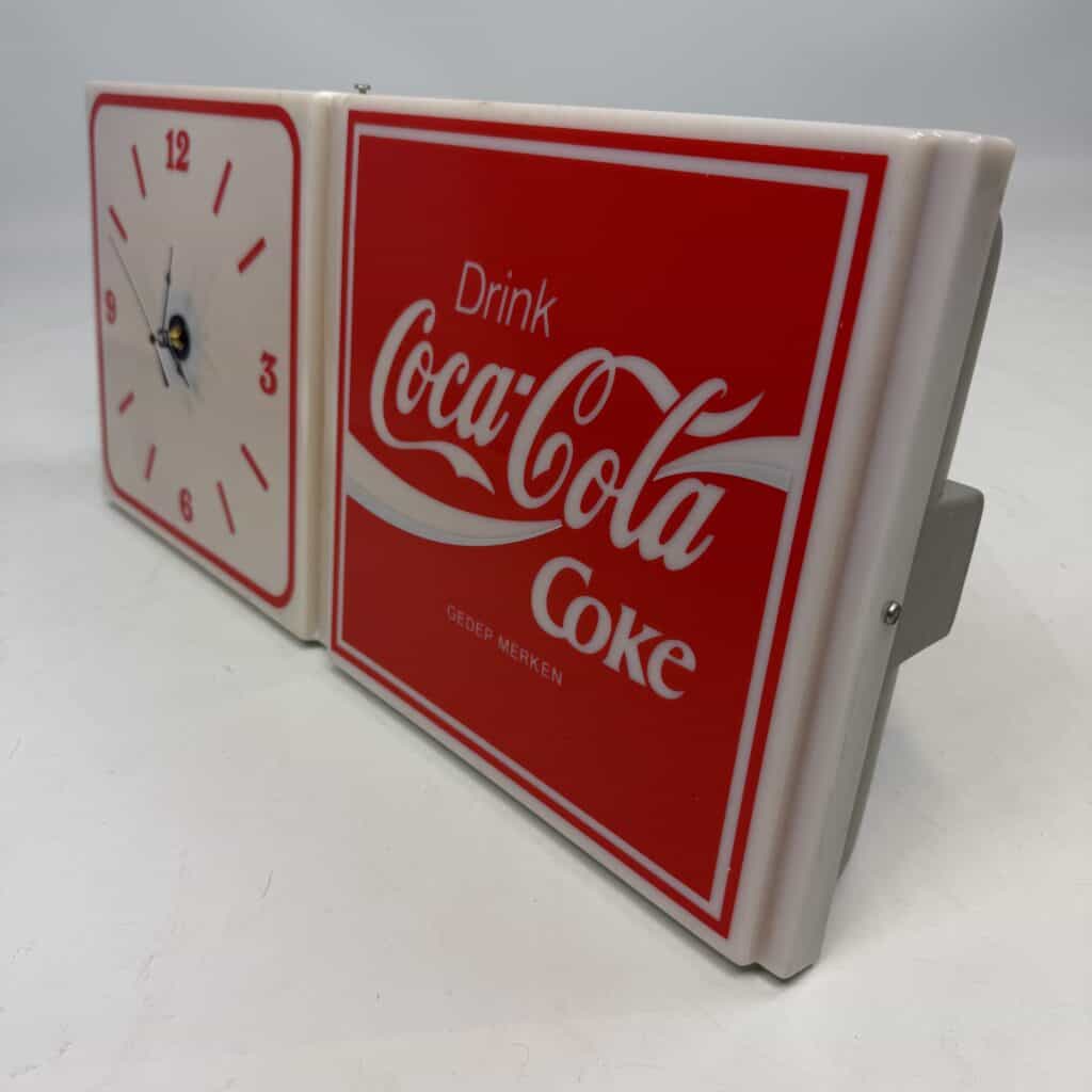 The right-hand panel displays the iconic Coca-Cola logo with the text ‘Drink Coke’, whilst the left-hand panel features an analogue clock