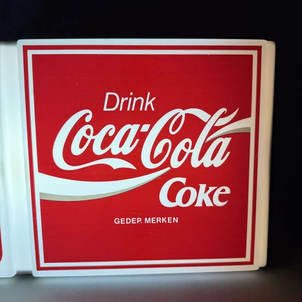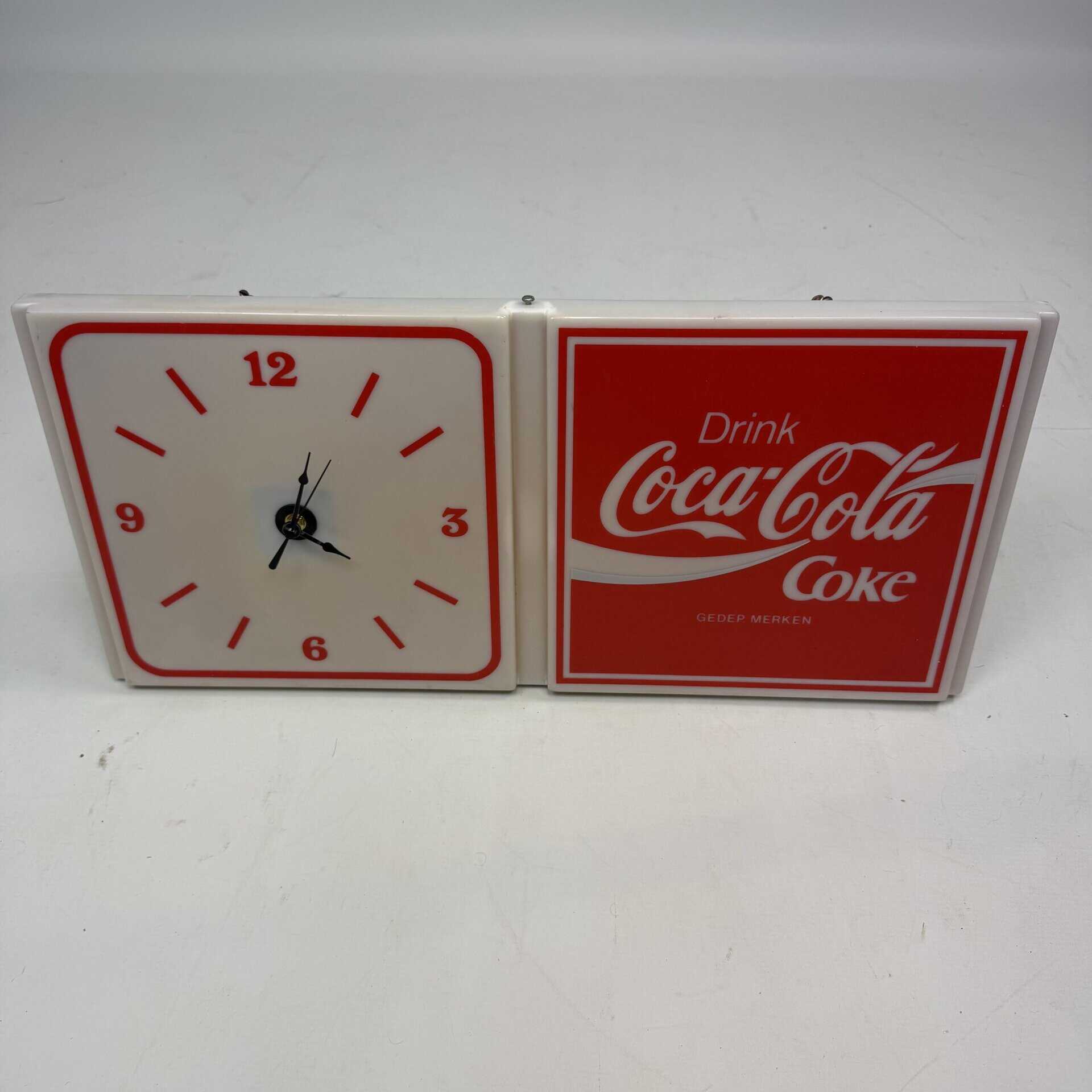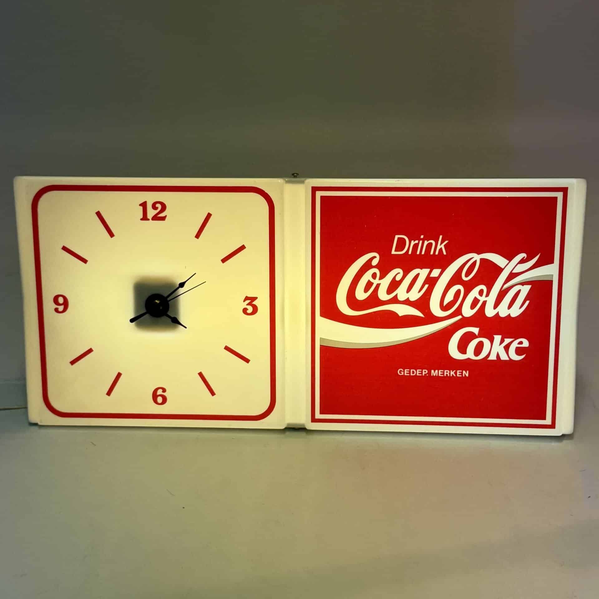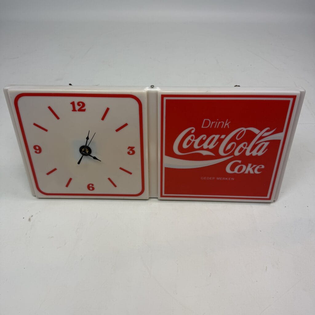 The right-hand panel displays the iconic Coca-Cola logo with the text ‘Drink Coke’, whilst the left-hand panel features an analogue clock