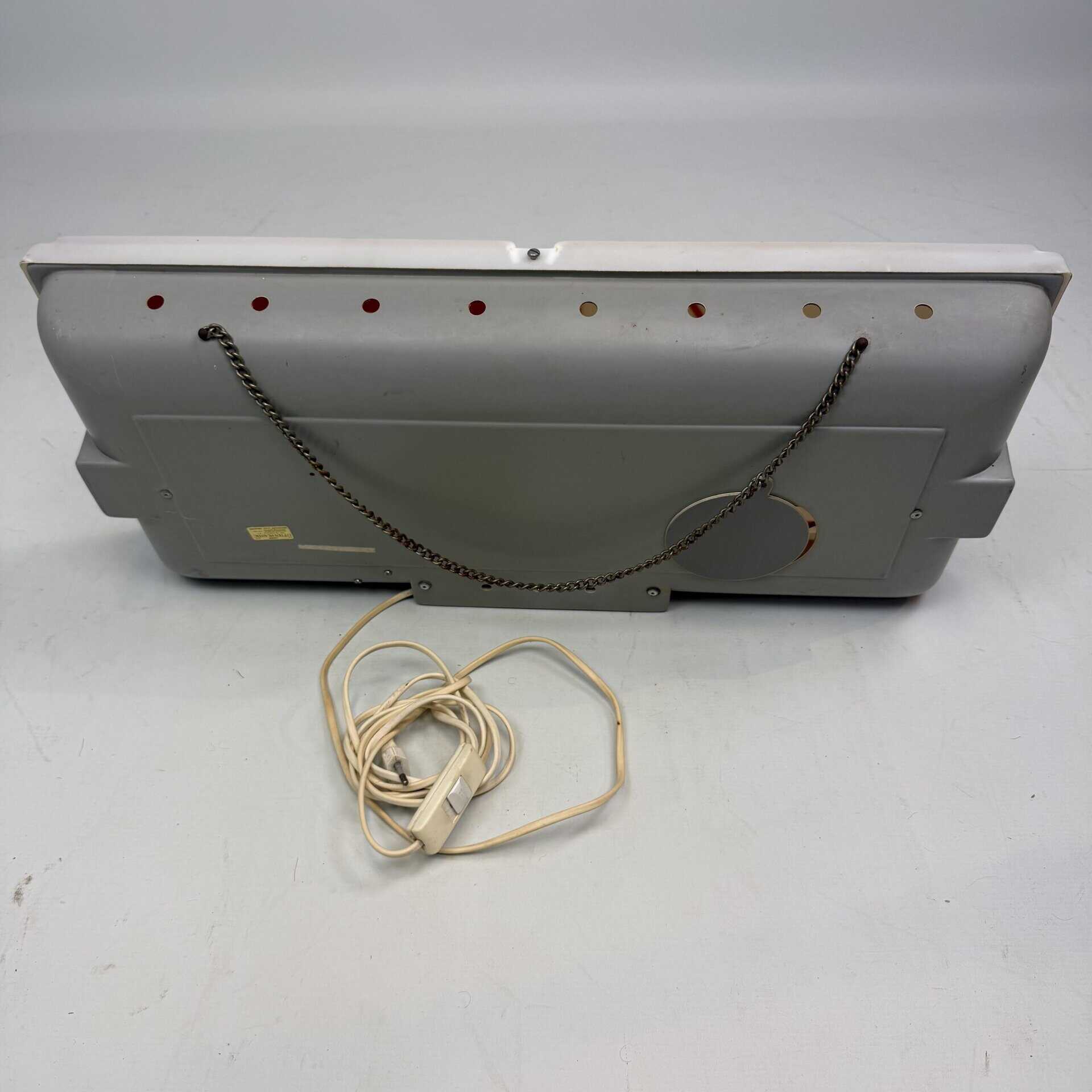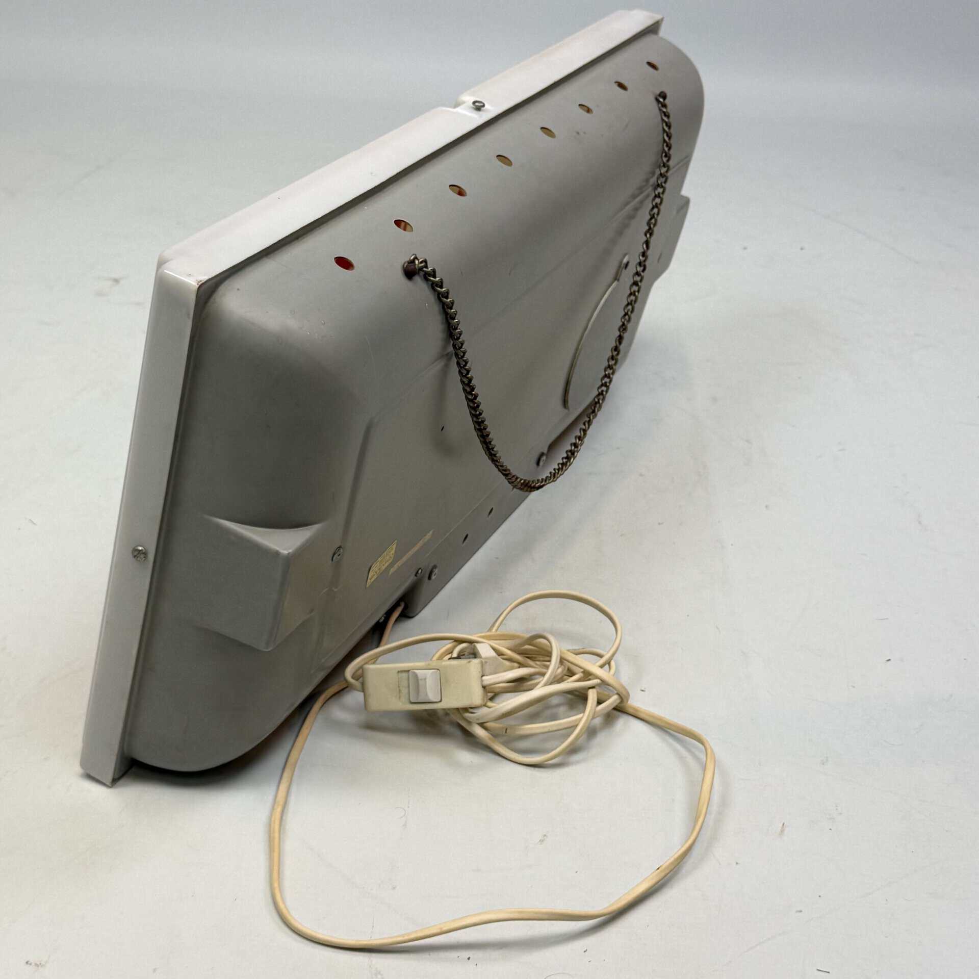 The illuminated sign is fitted with a metal chain and an electrical cable