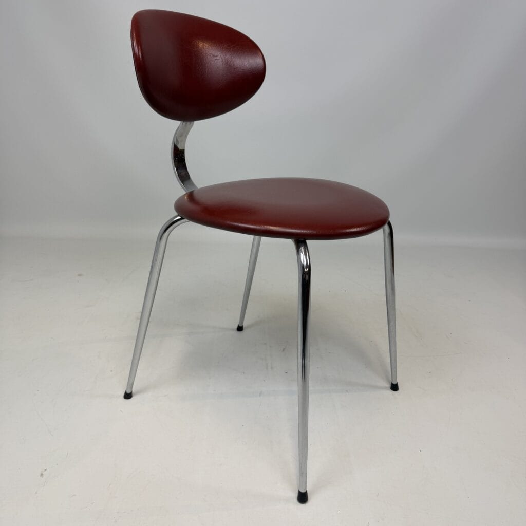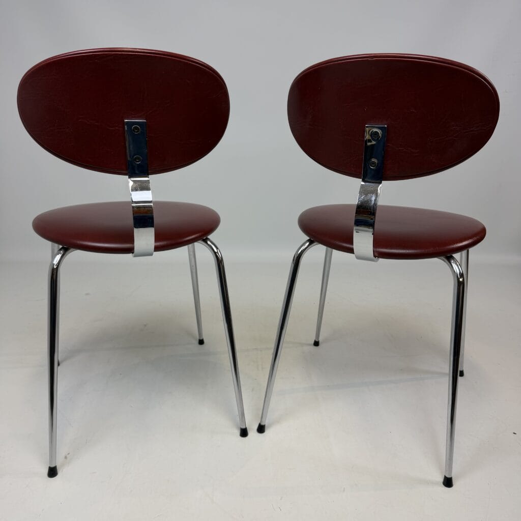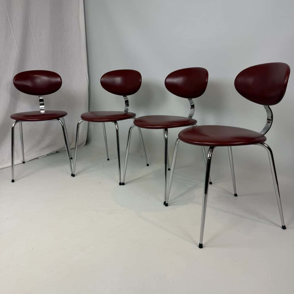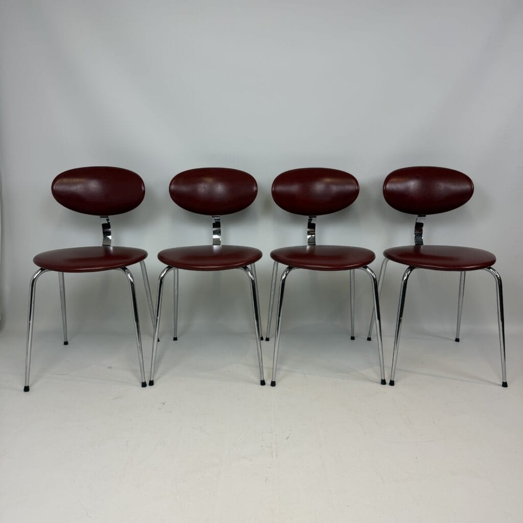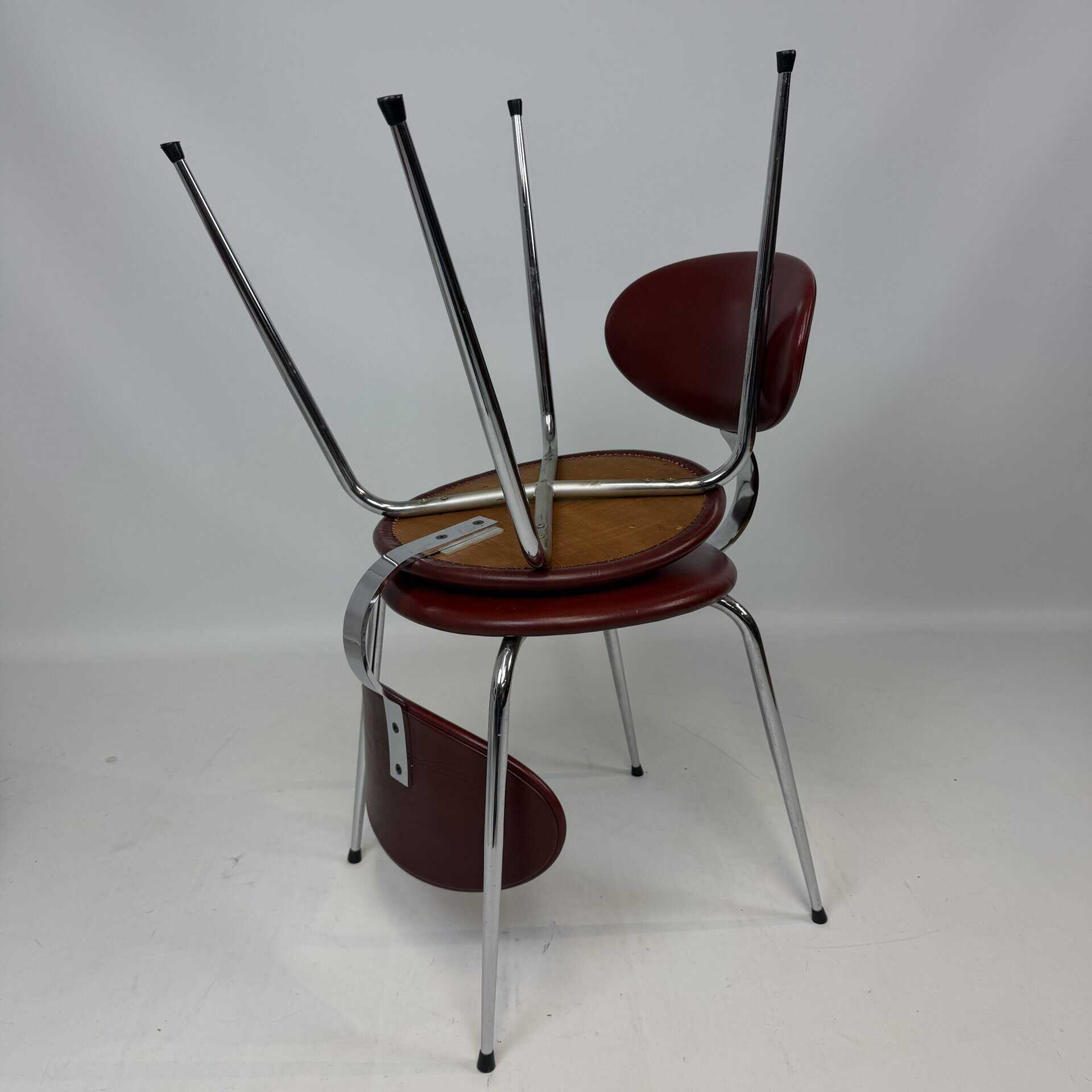 4 vintage chairs with chrome-plated legs and burgundy skai seat and back