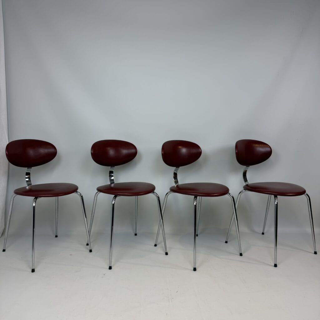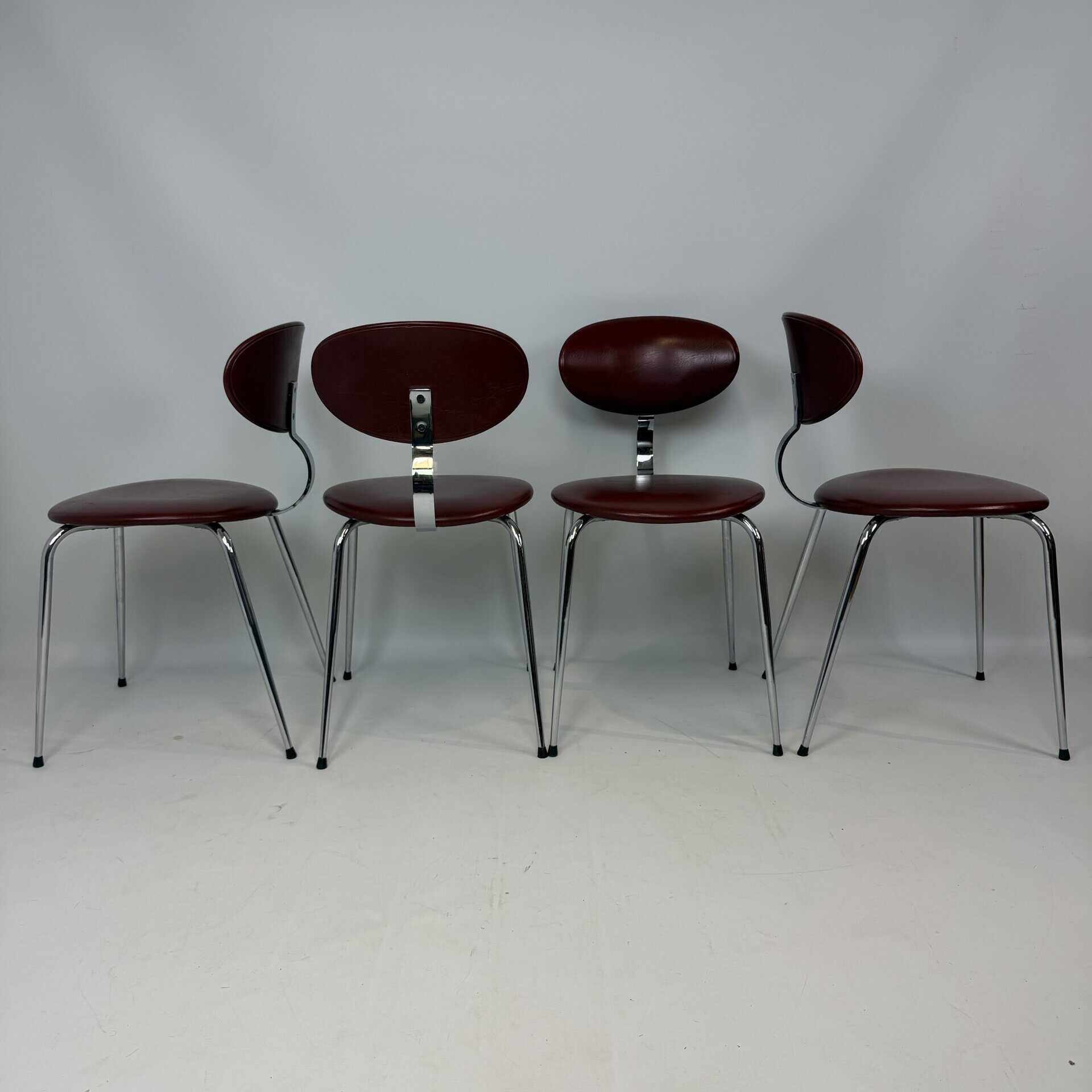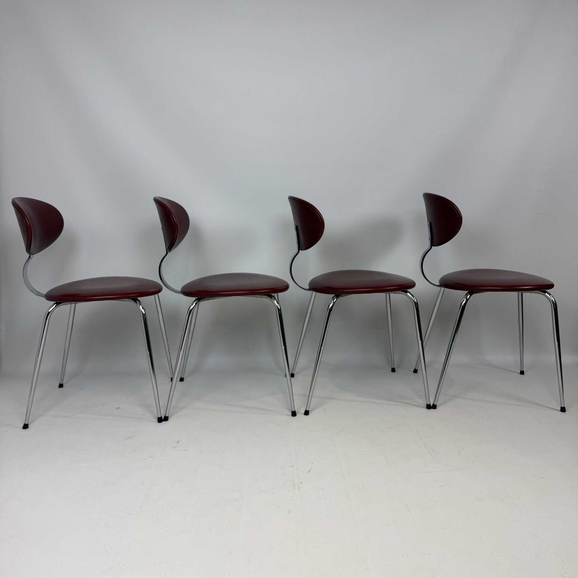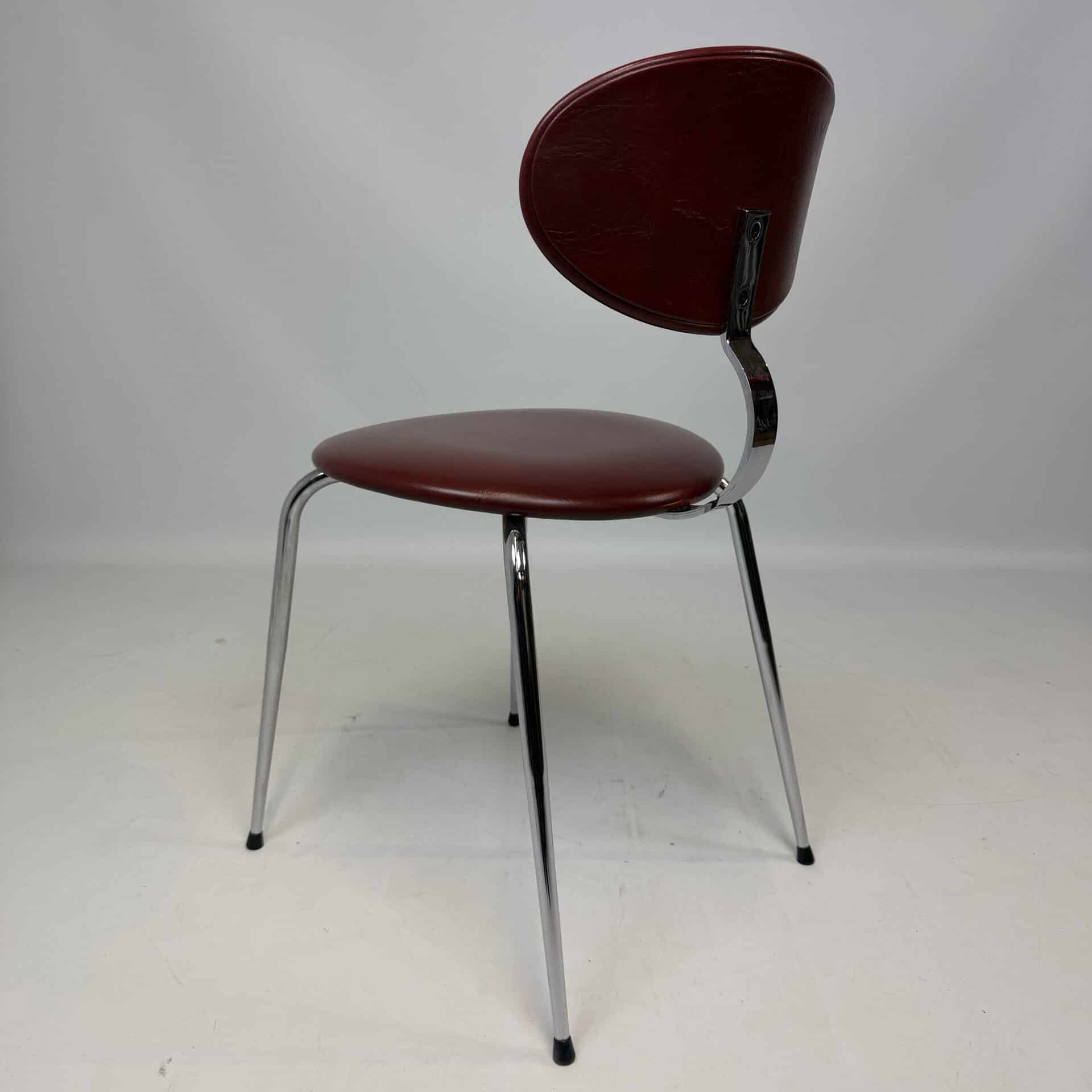 4 vintage chairs with chrome-plated legs and burgundy skai seat and back