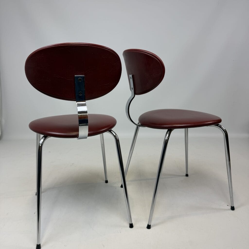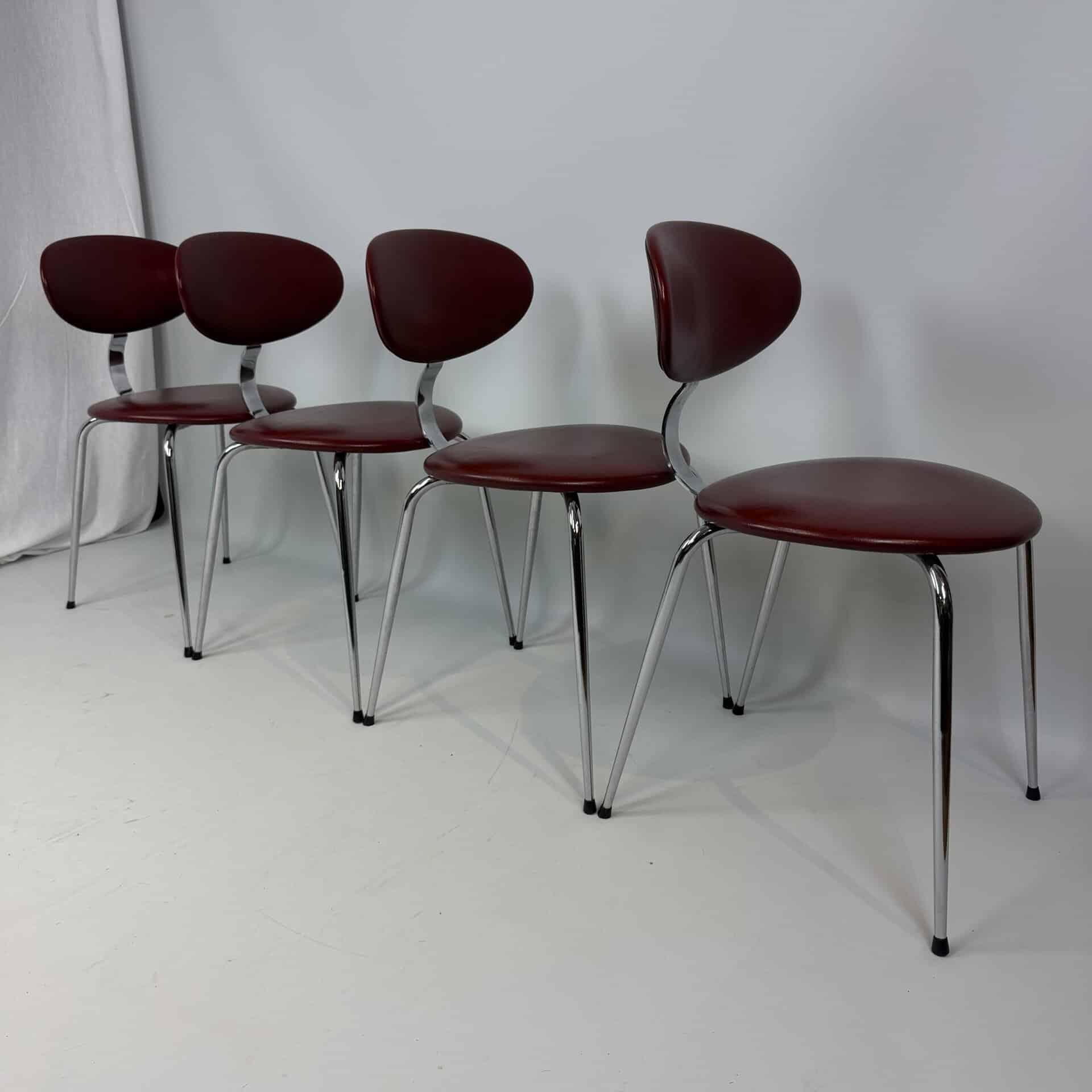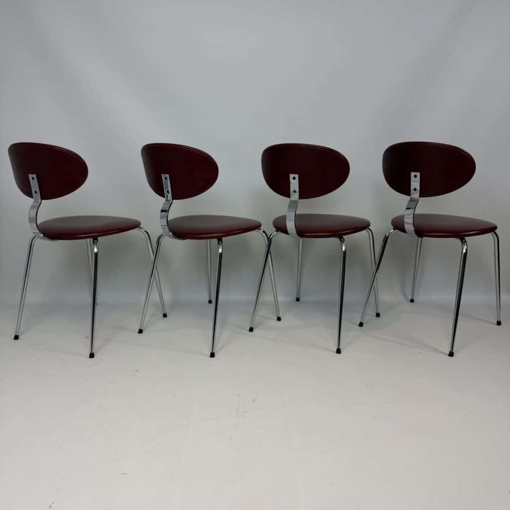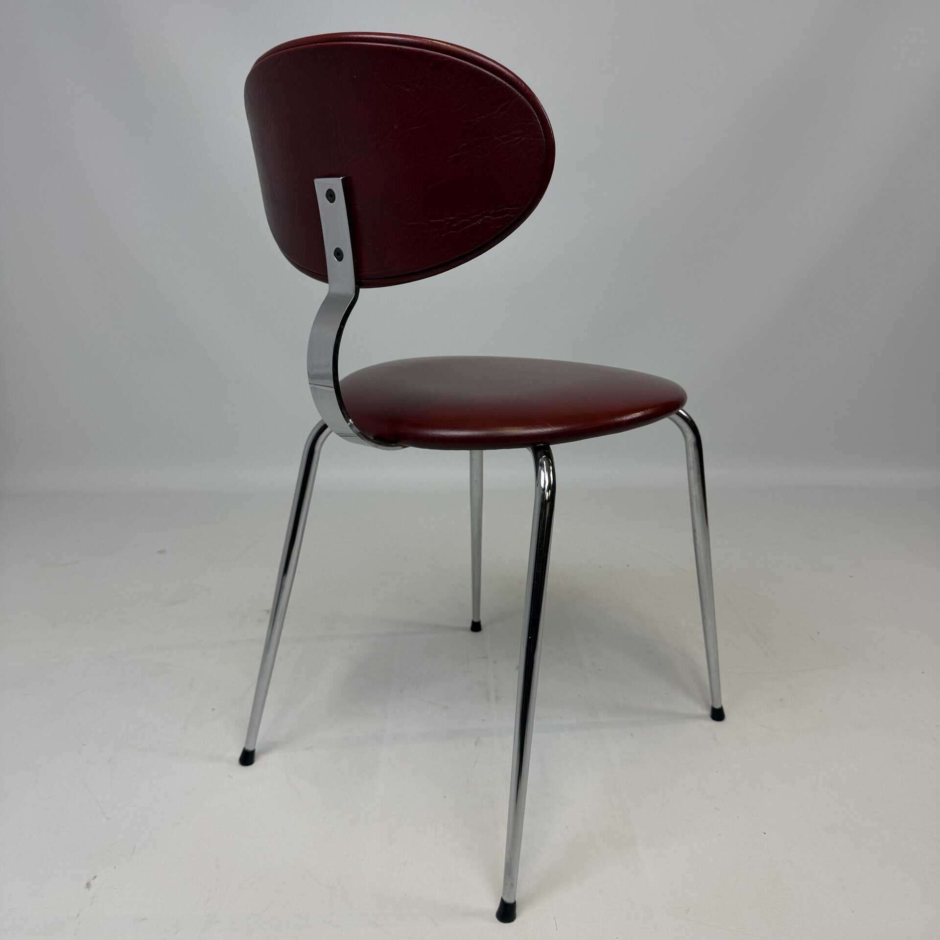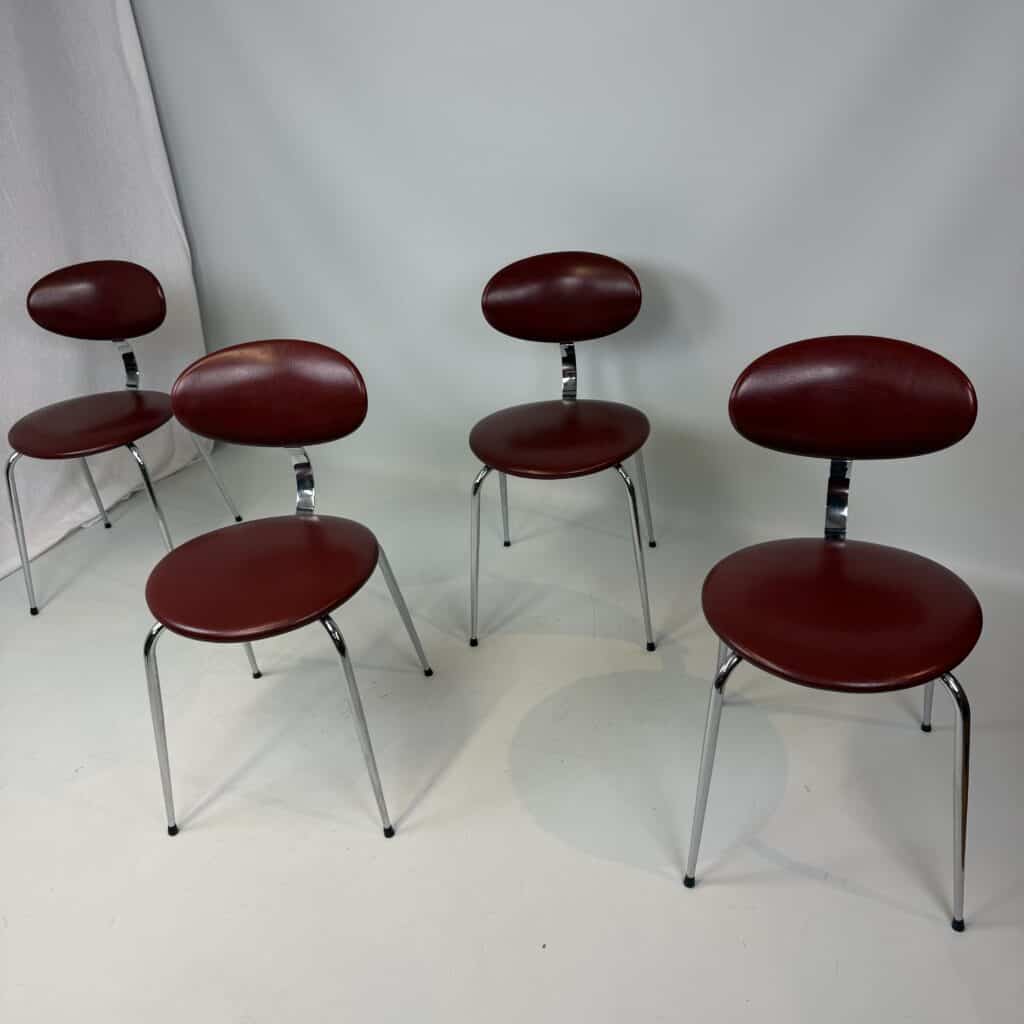 4 vintage chairs with chrome-plated legs and burgundy skai seat and back