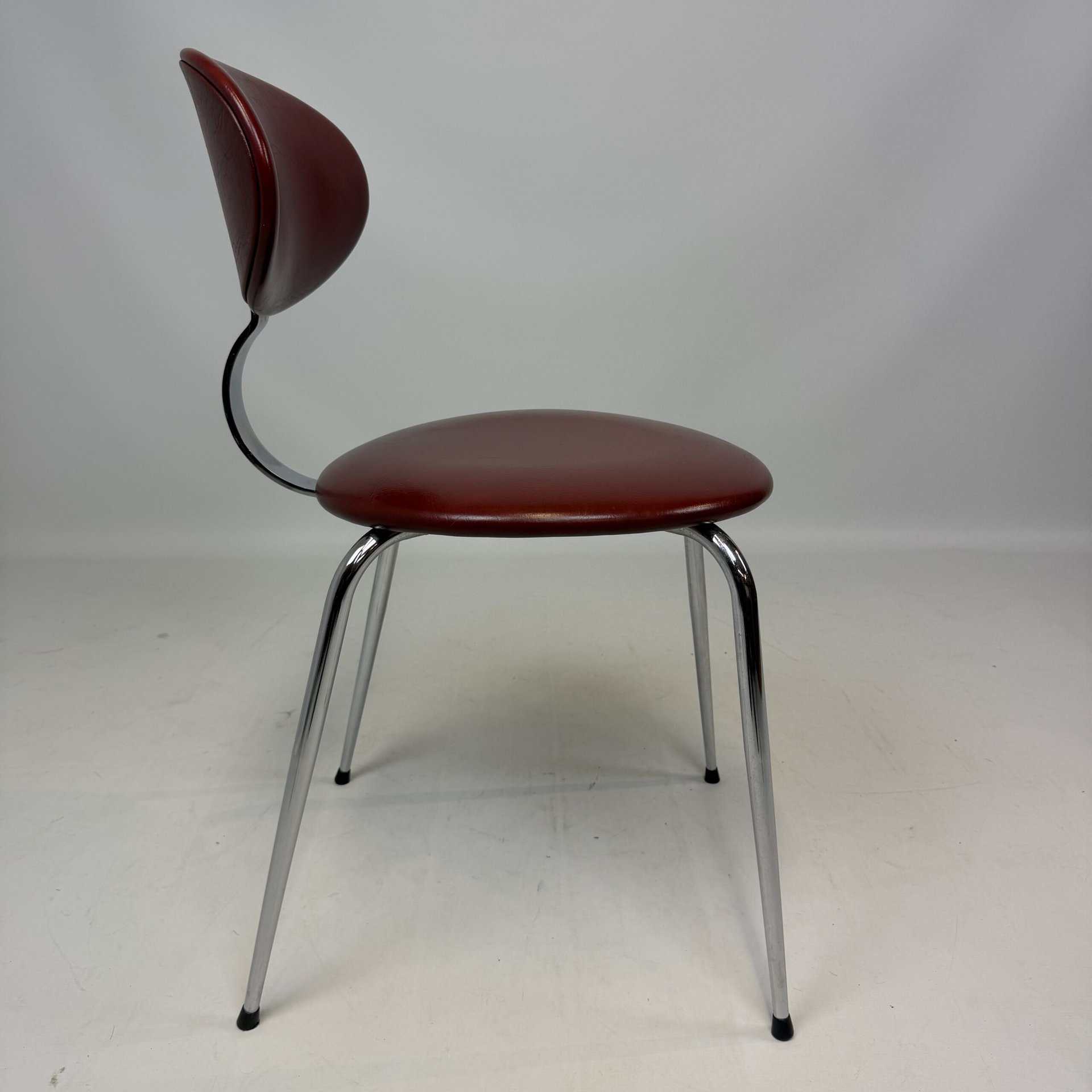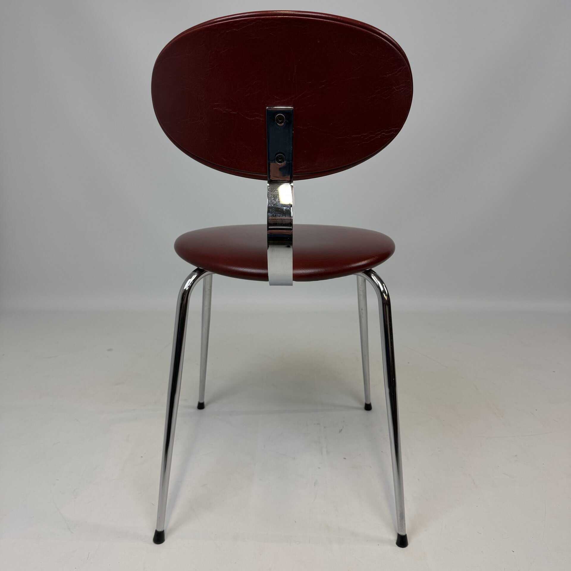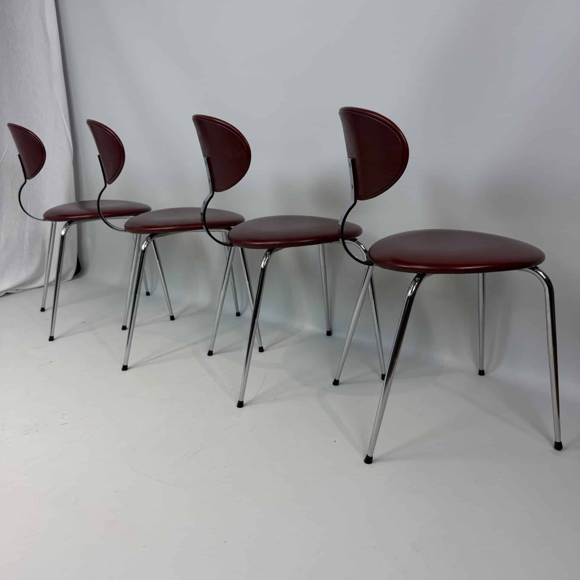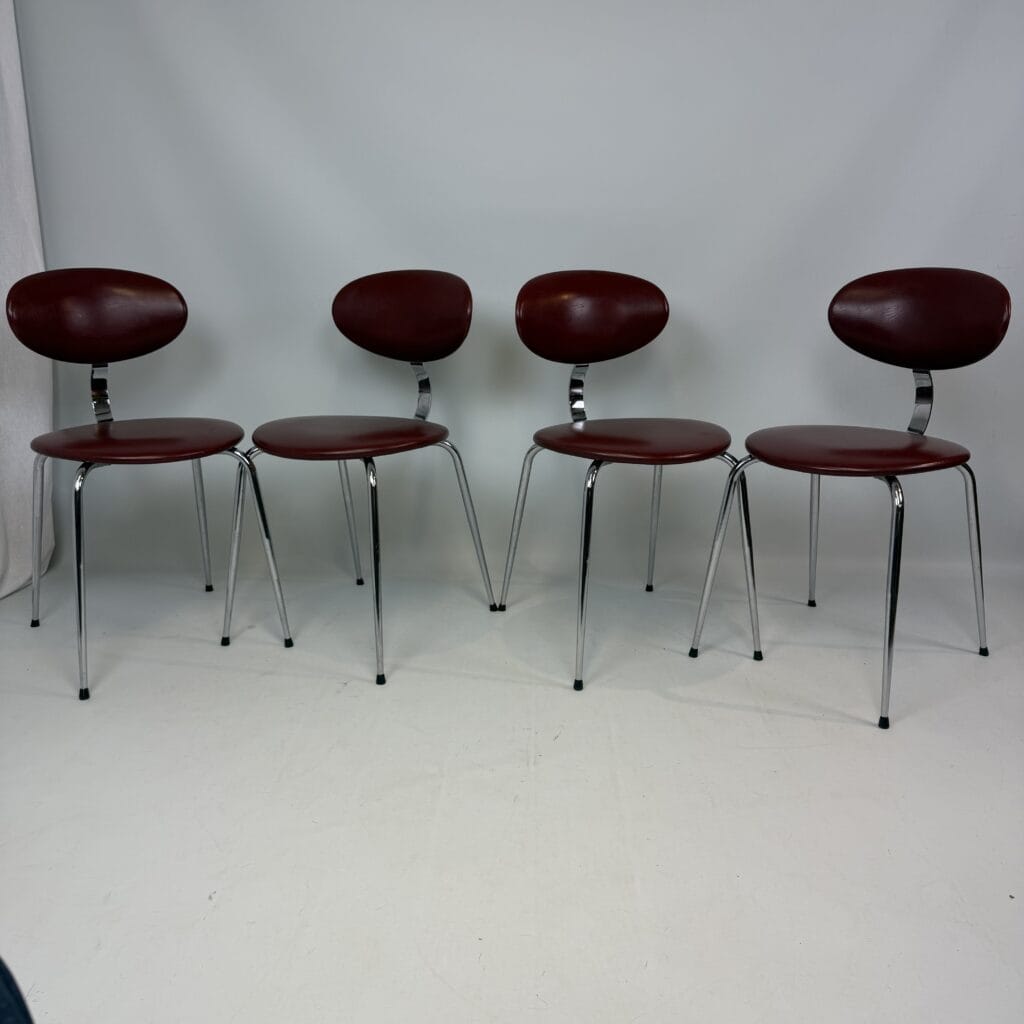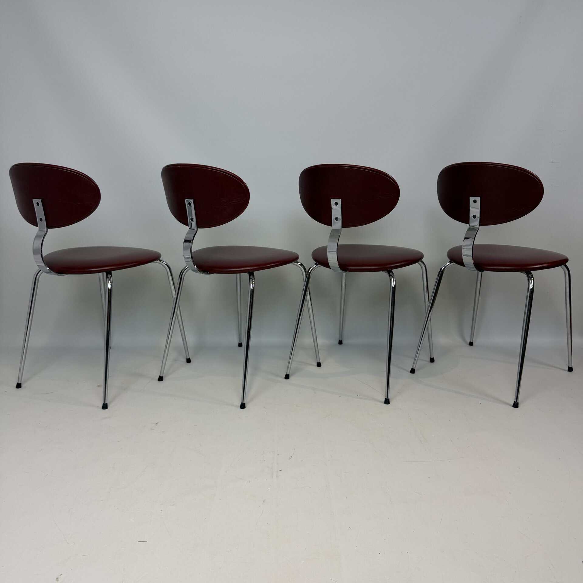 4 vintage chairs with chrome-plated legs and burgundy skai seat and back