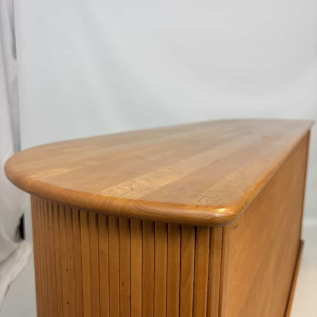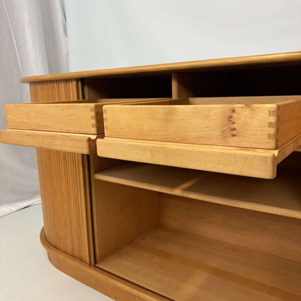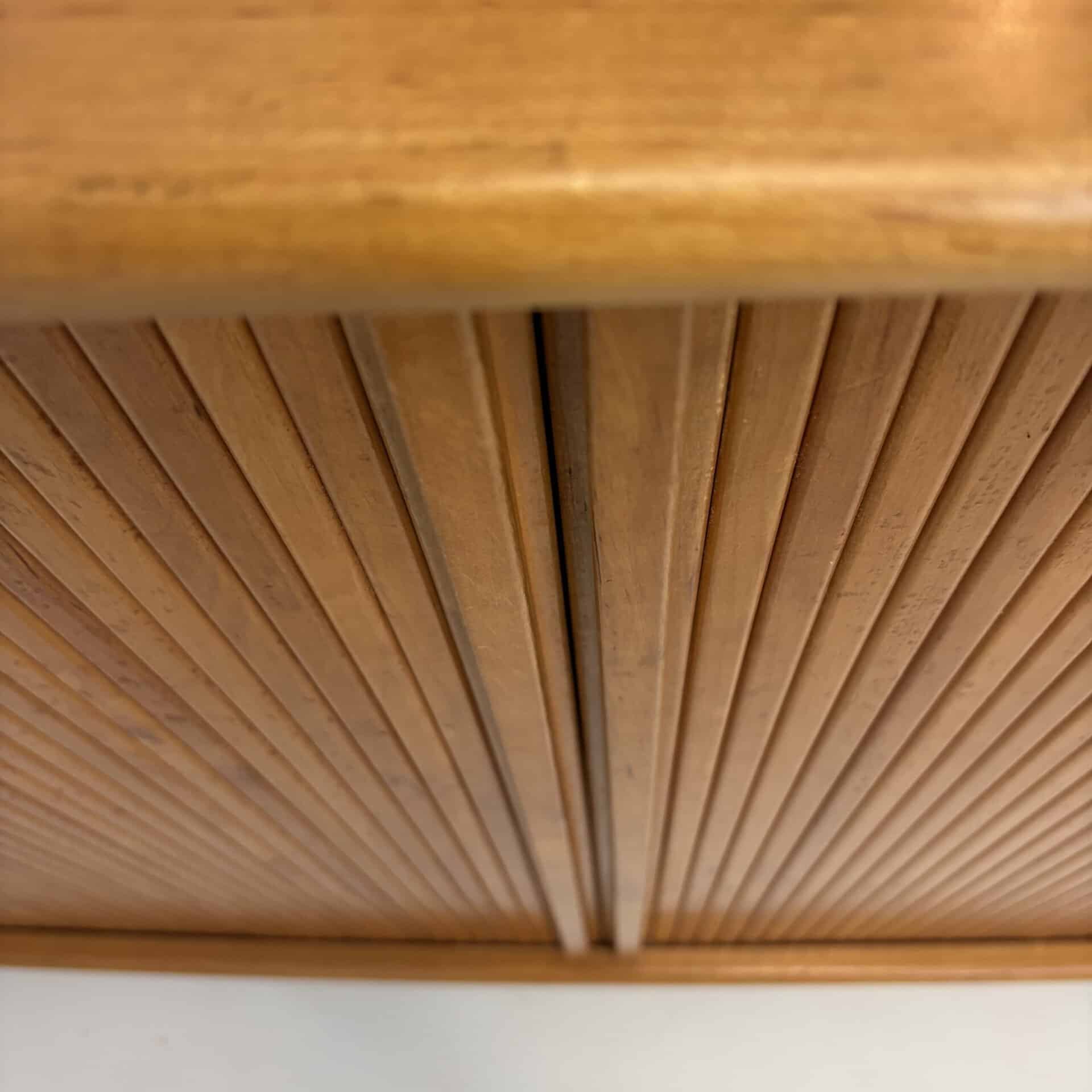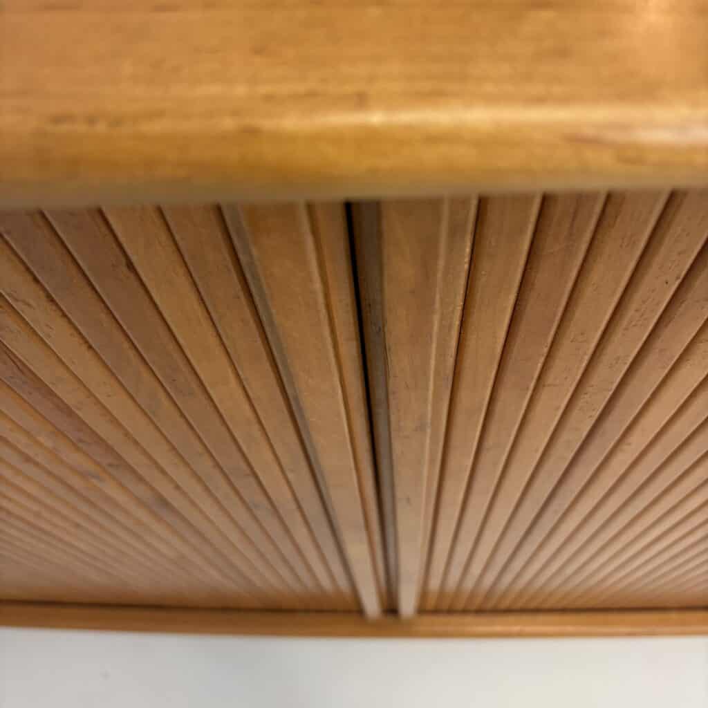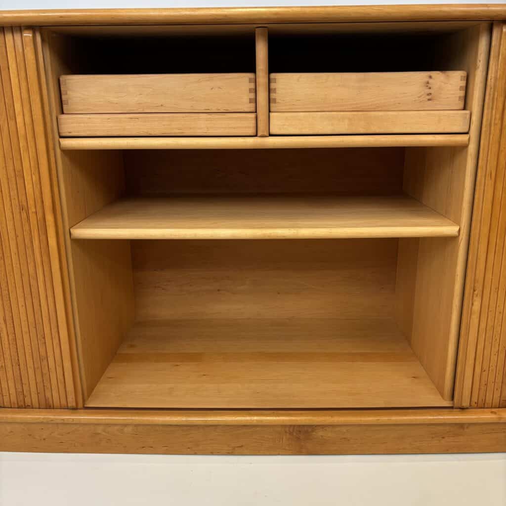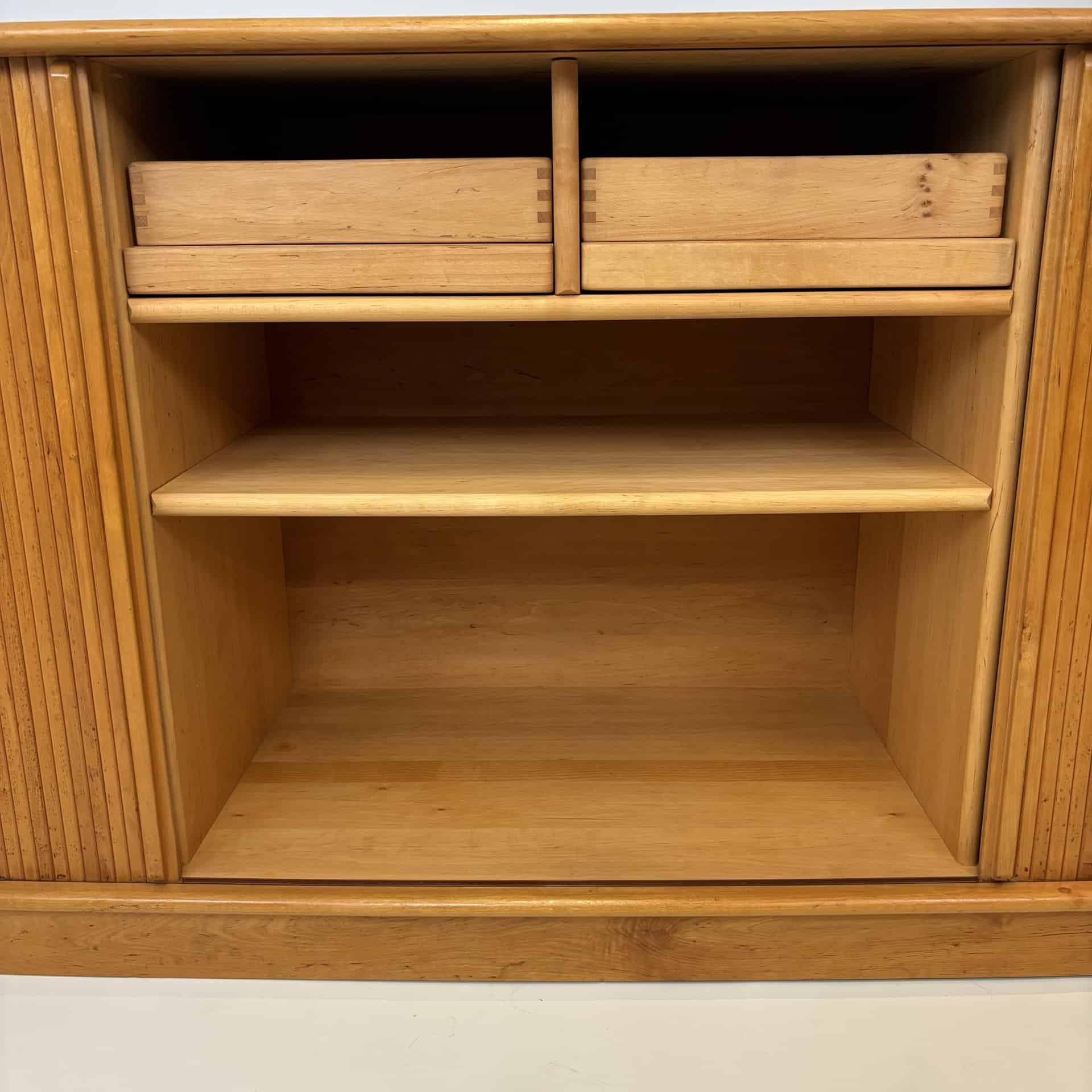 The tambour doors slide smoothly to the back of the cabinet rather than swinging open