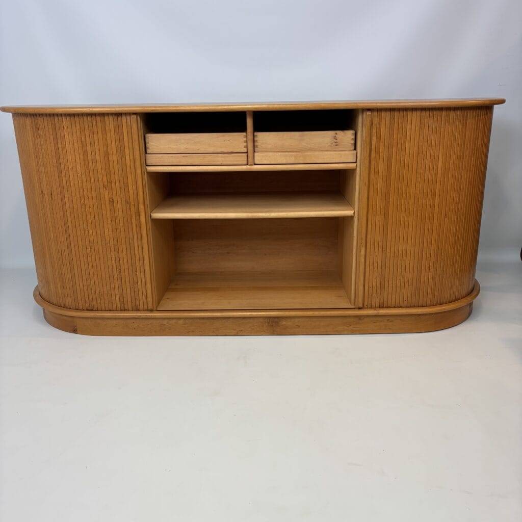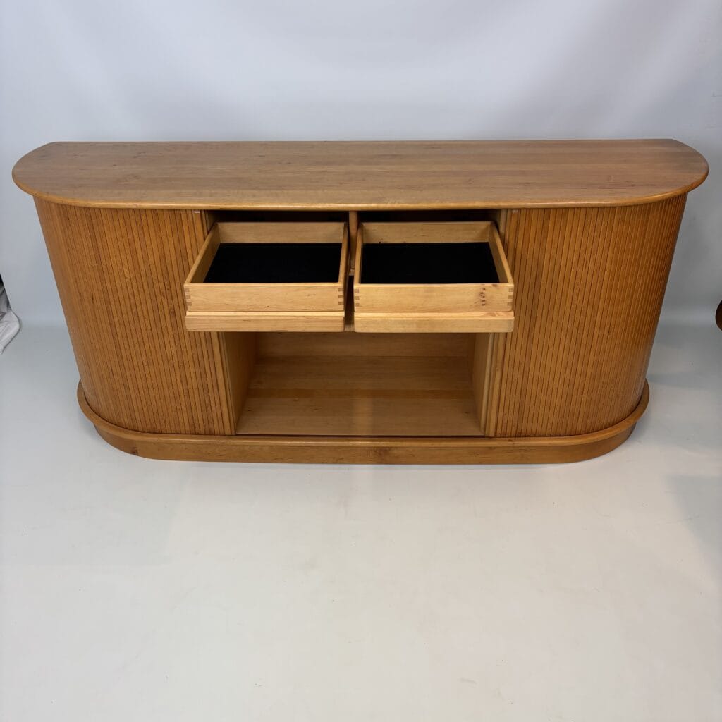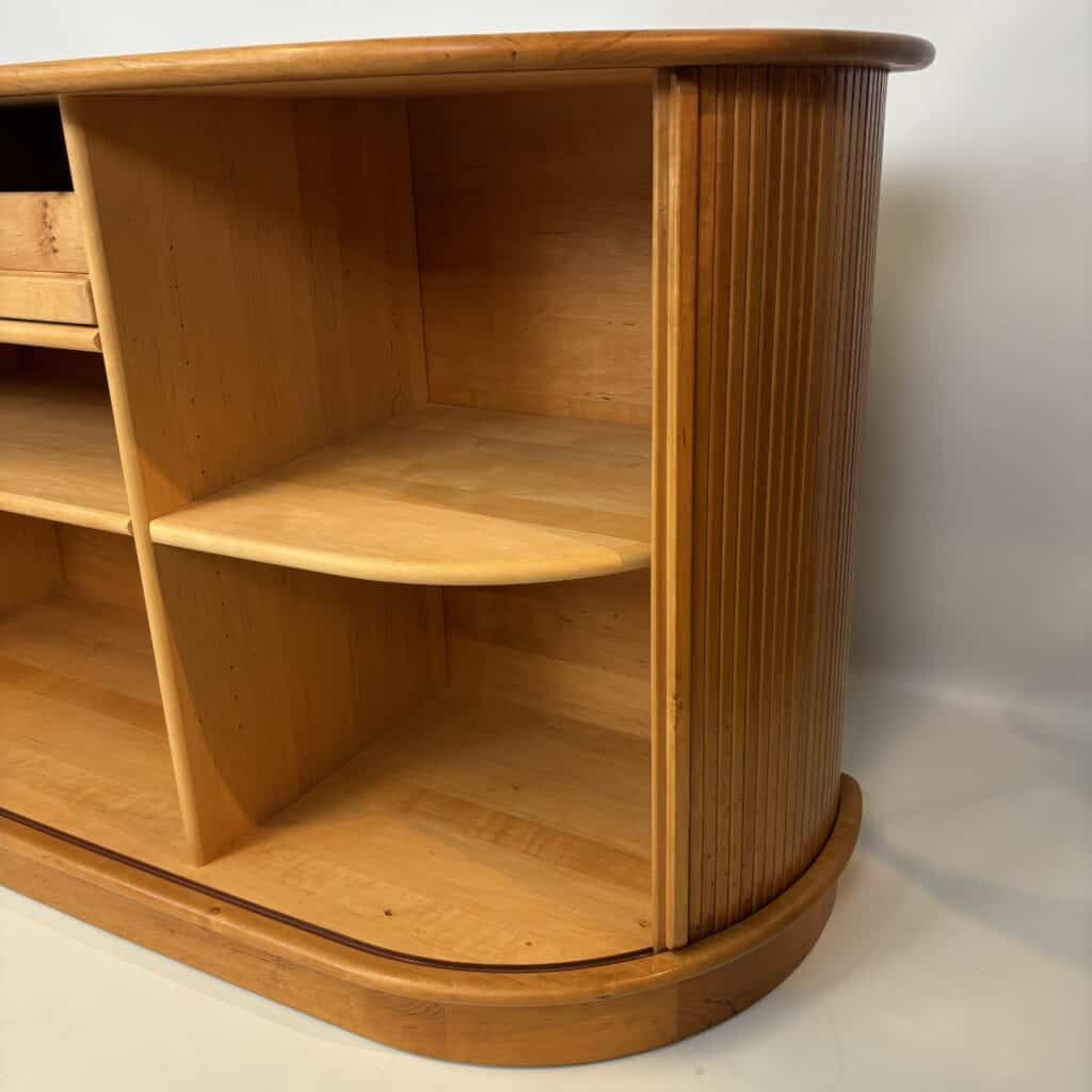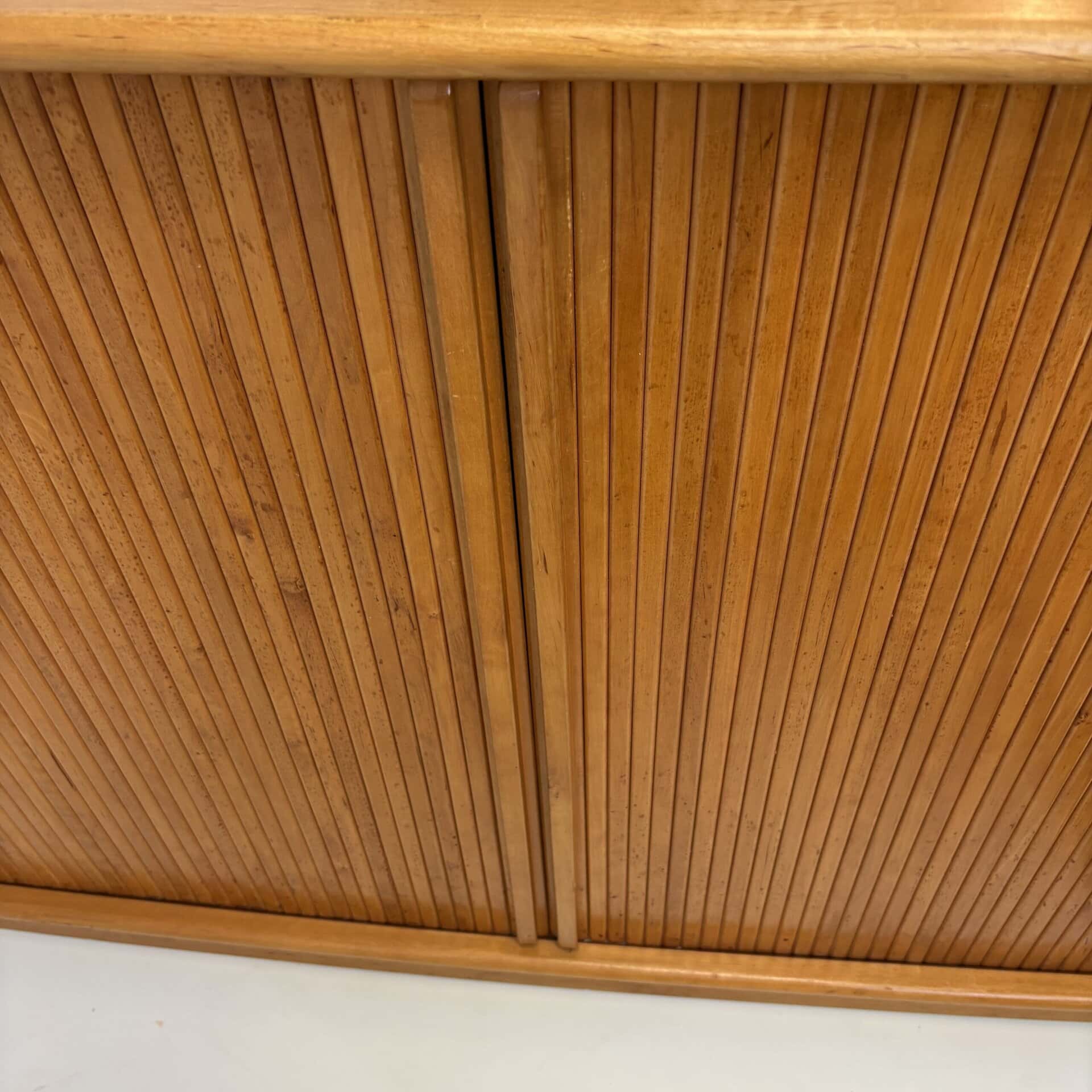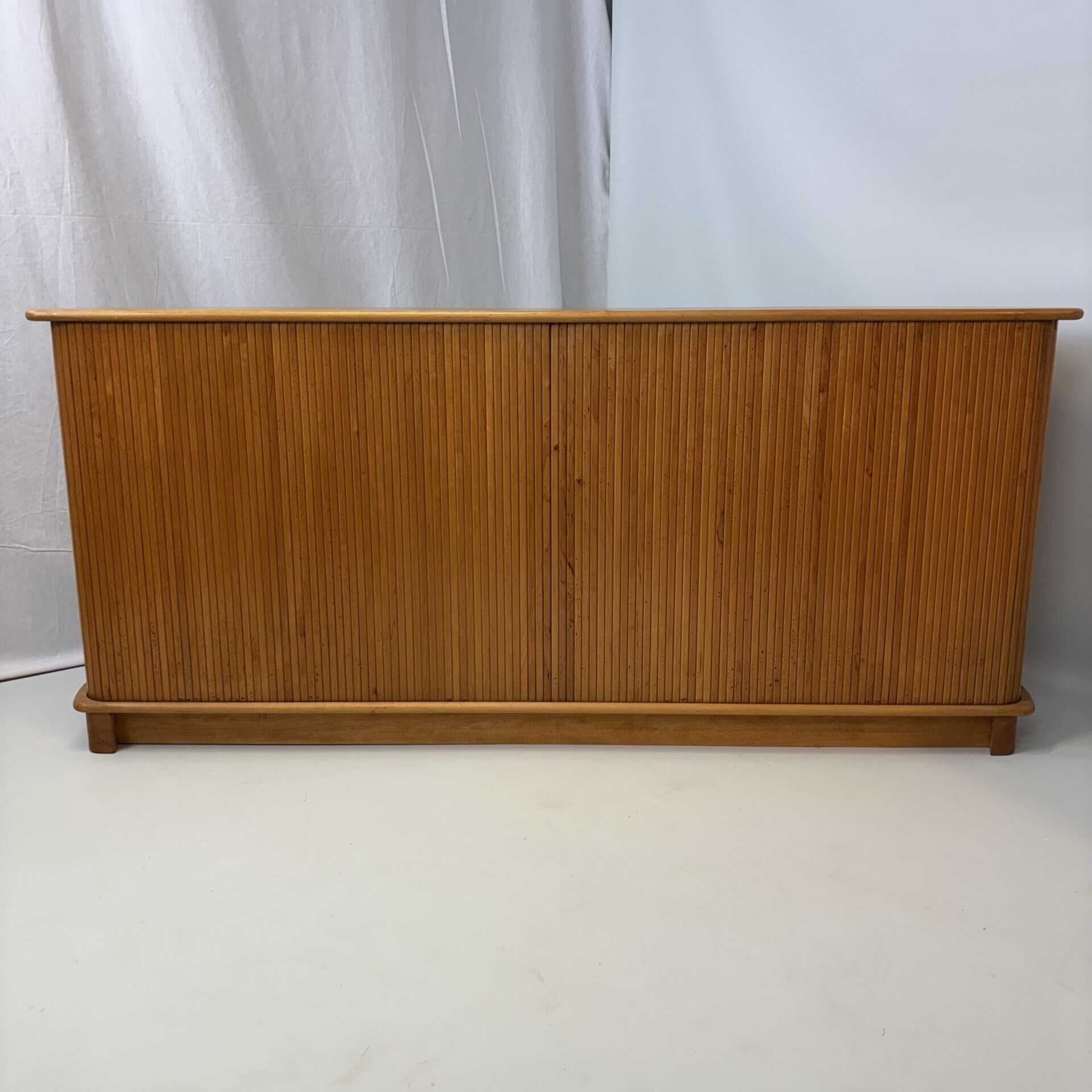 The tambour doors slide smoothly to the back of the cabinet rather than swinging open