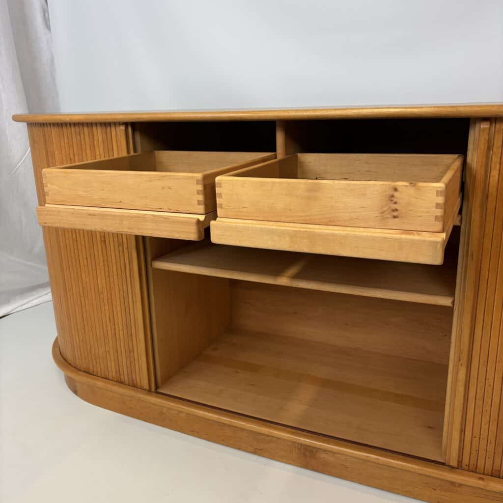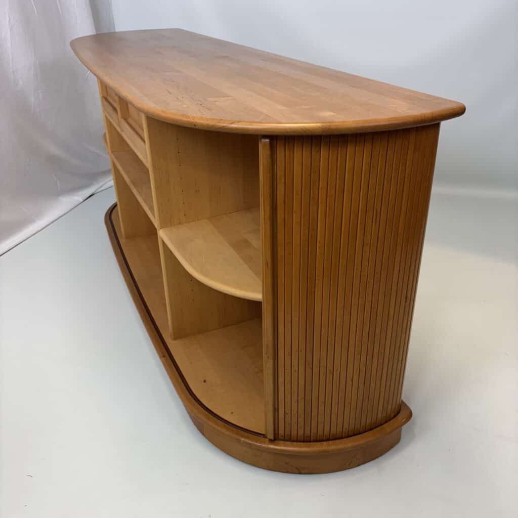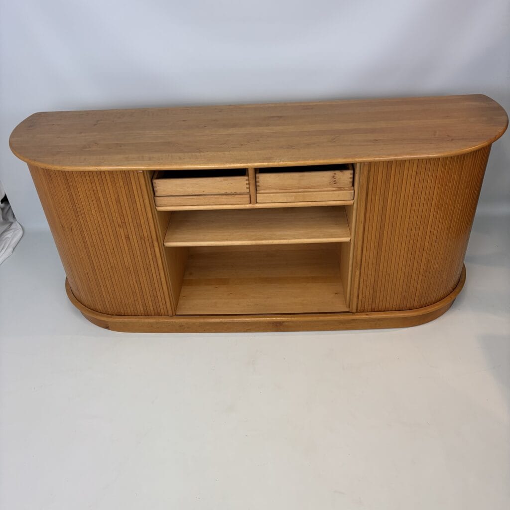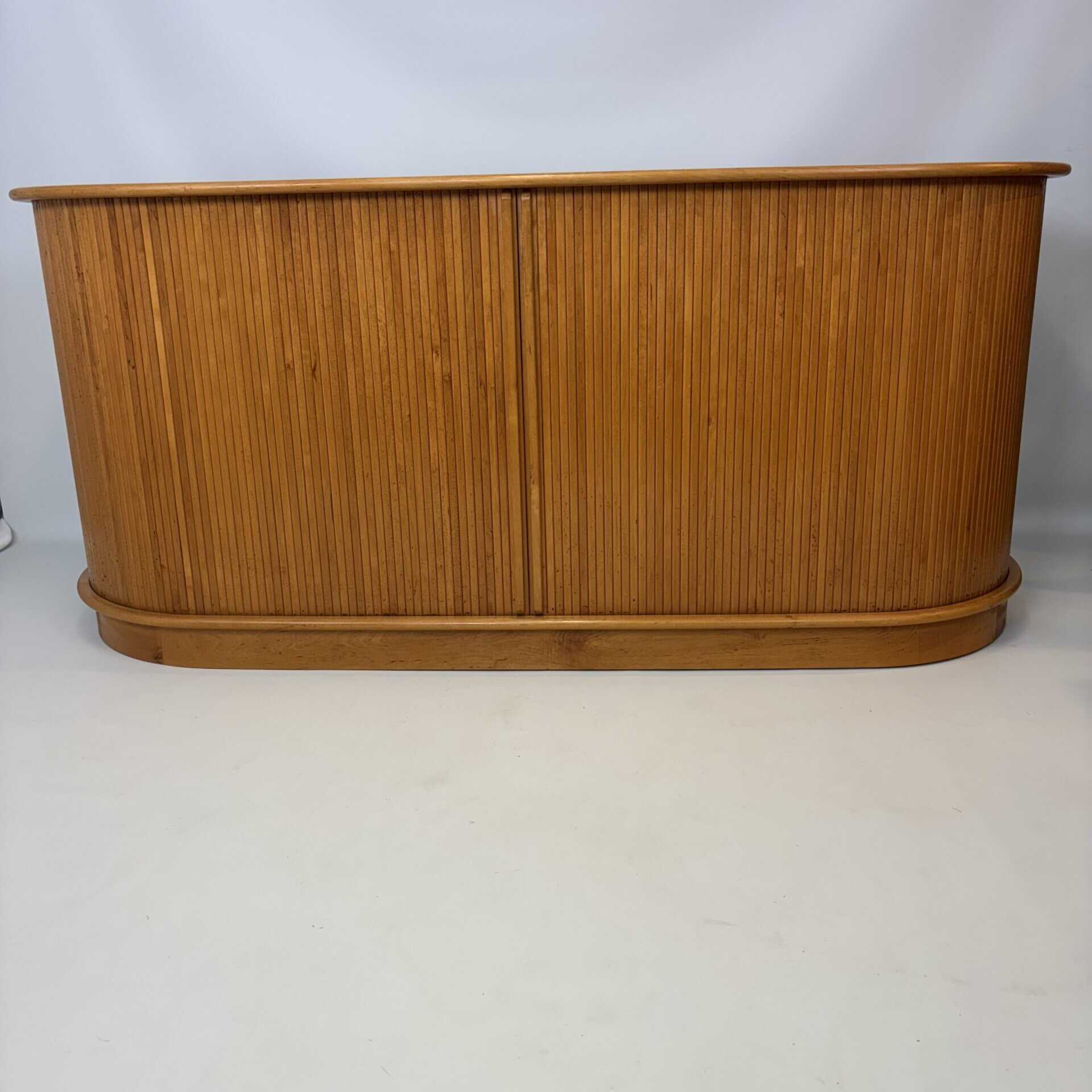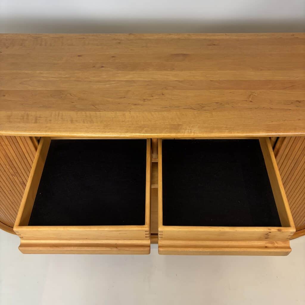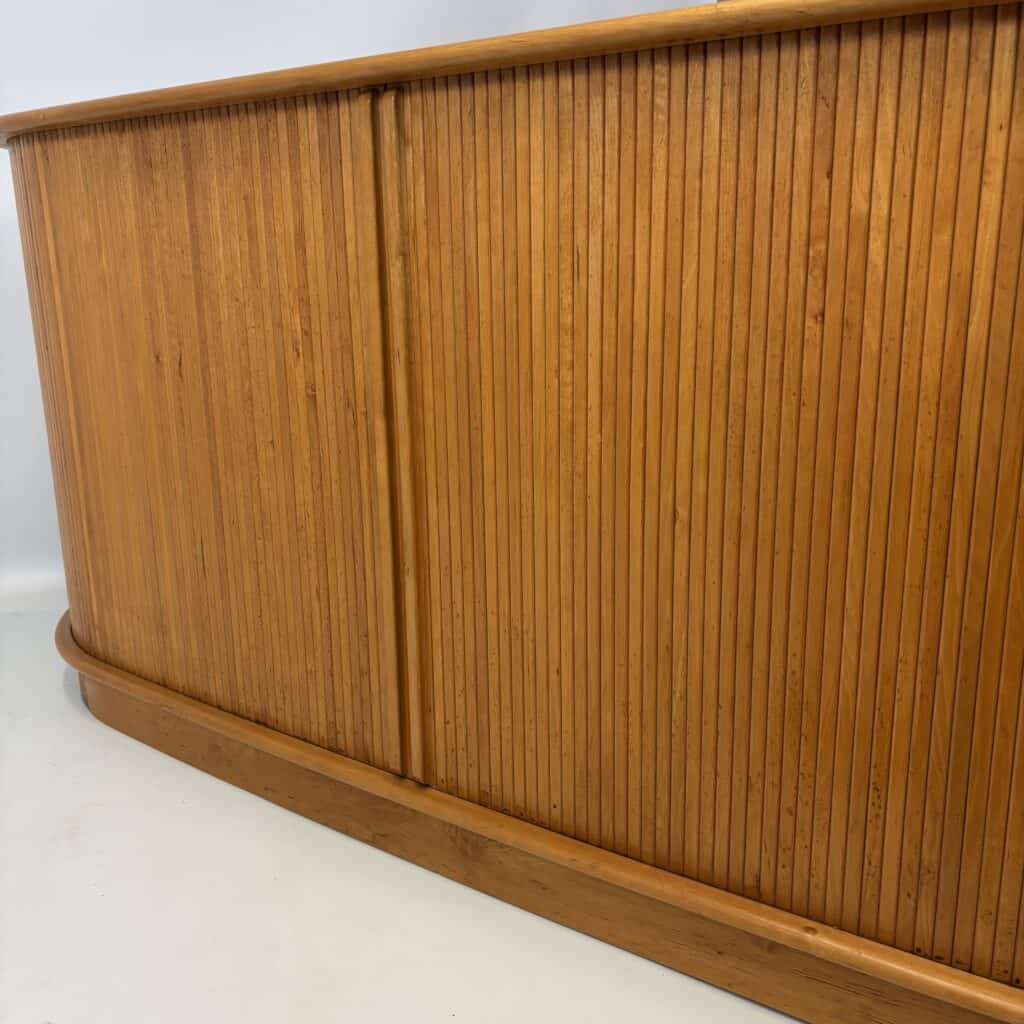 The tambour doors slide smoothly to the back of the cabinet rather than swinging open