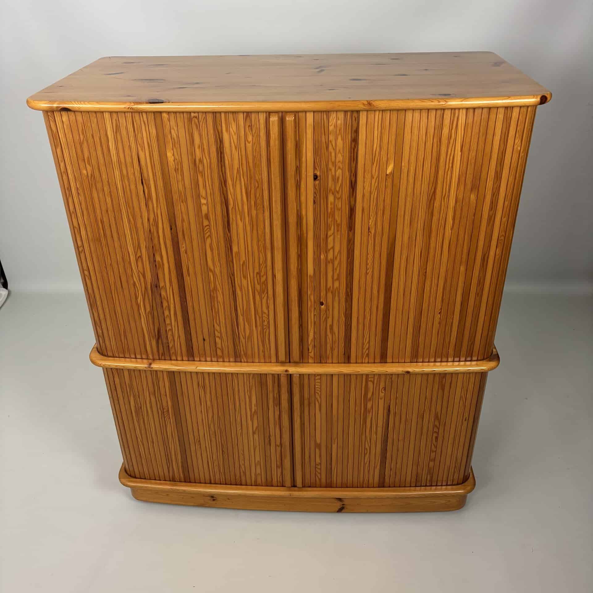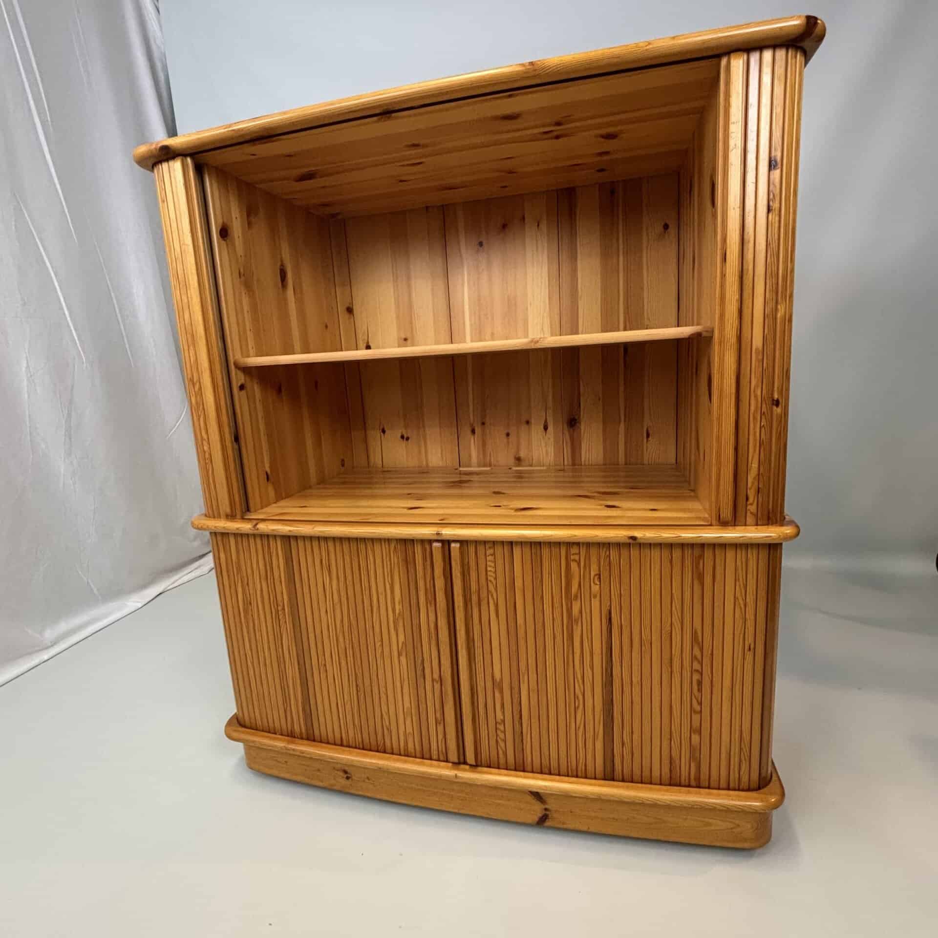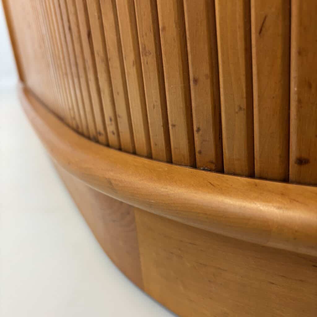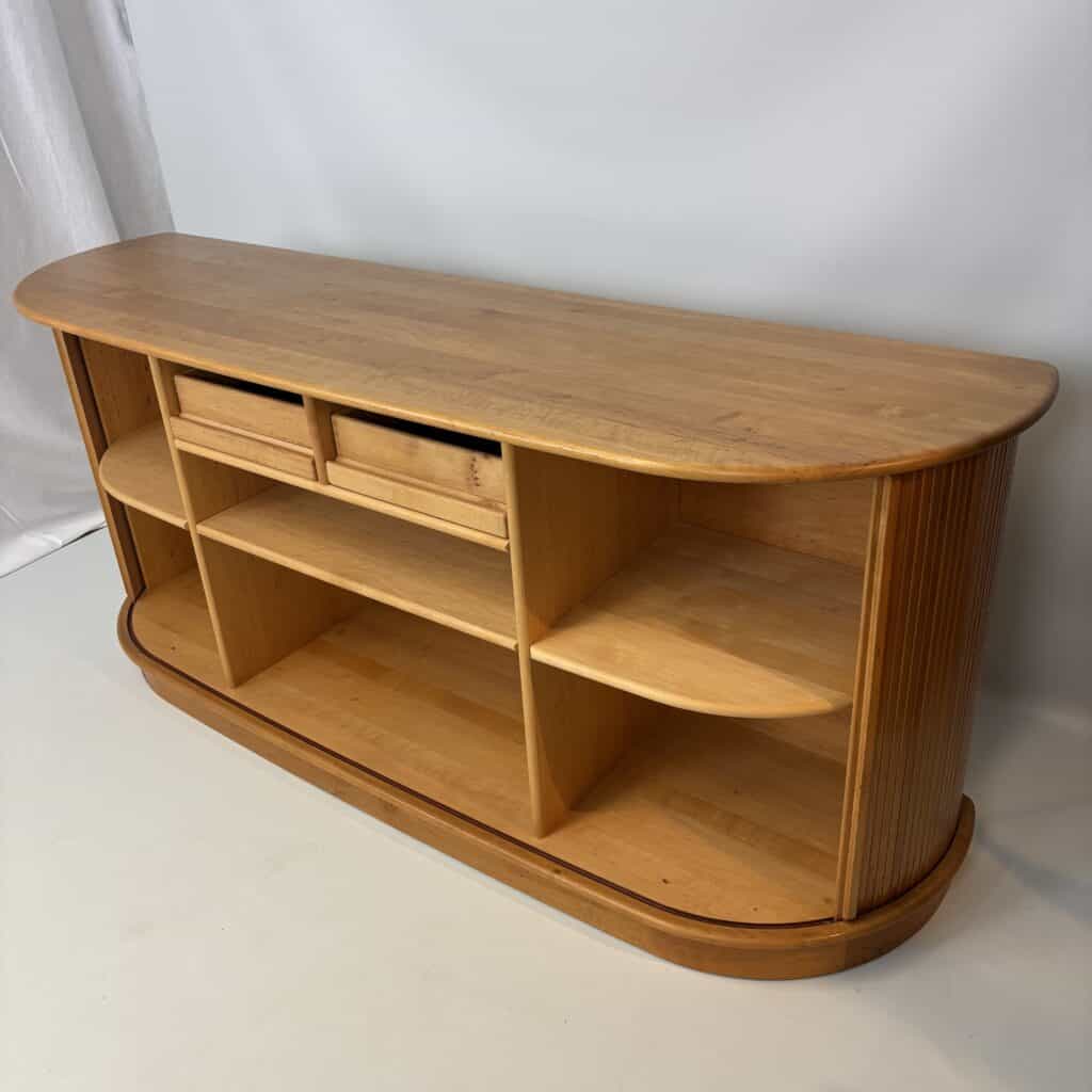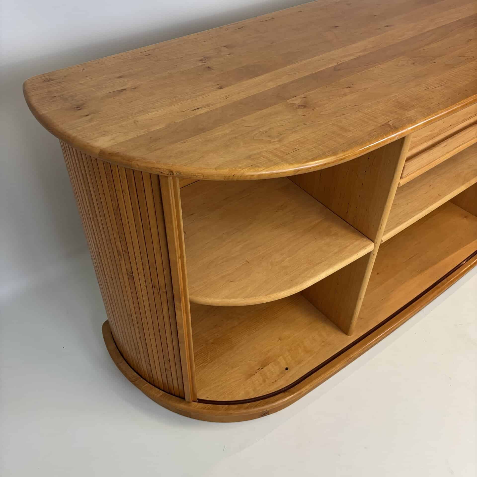 The tambour doors slide smoothly to the back of the cabinet rather than swinging open