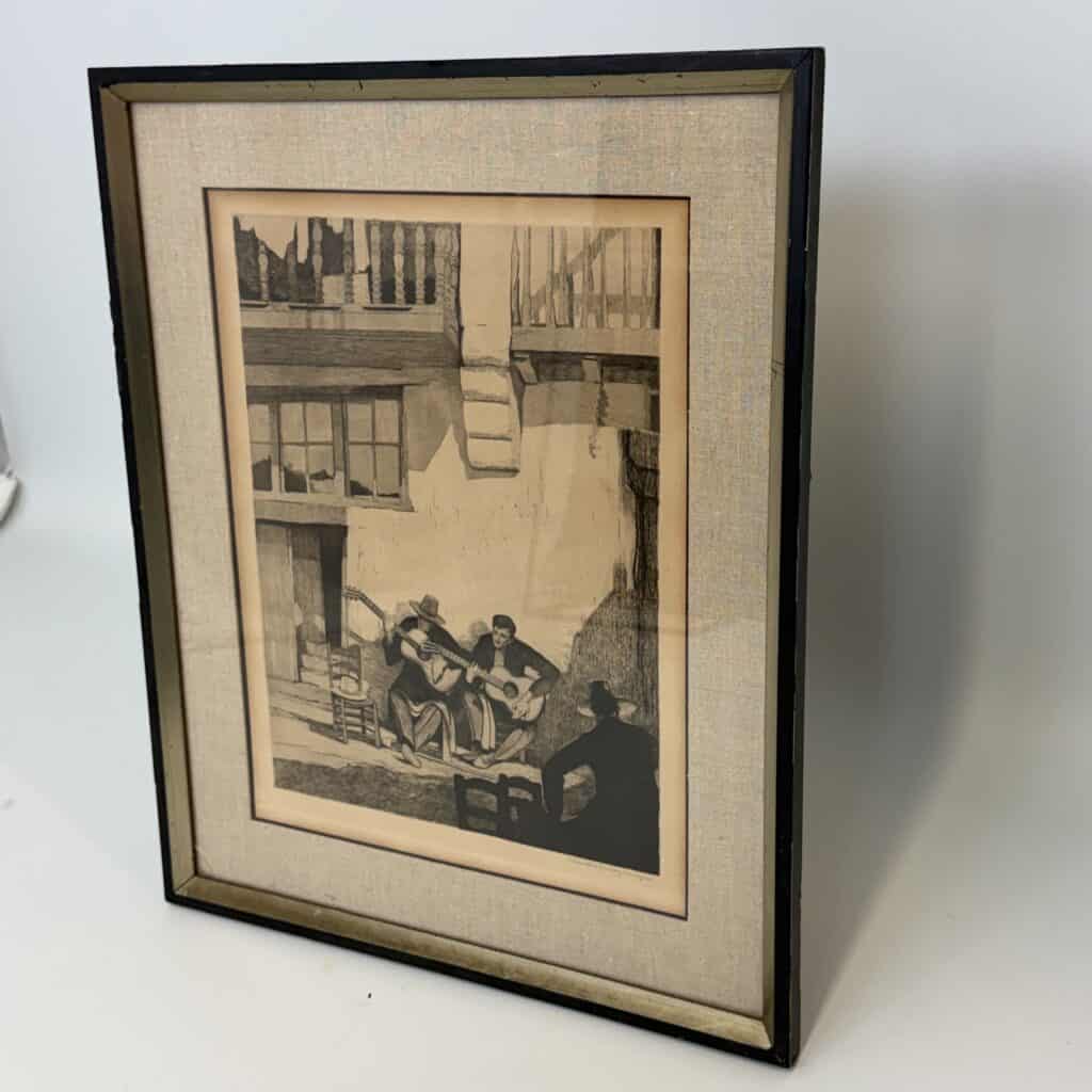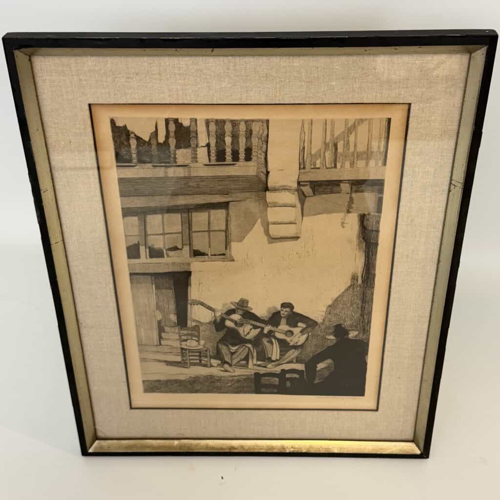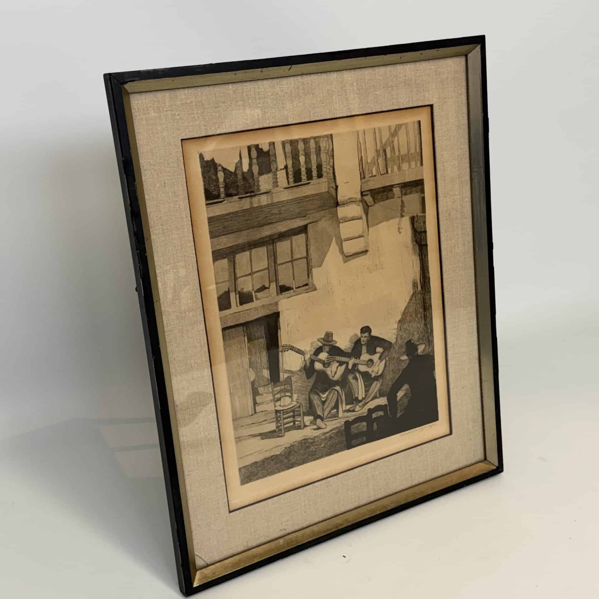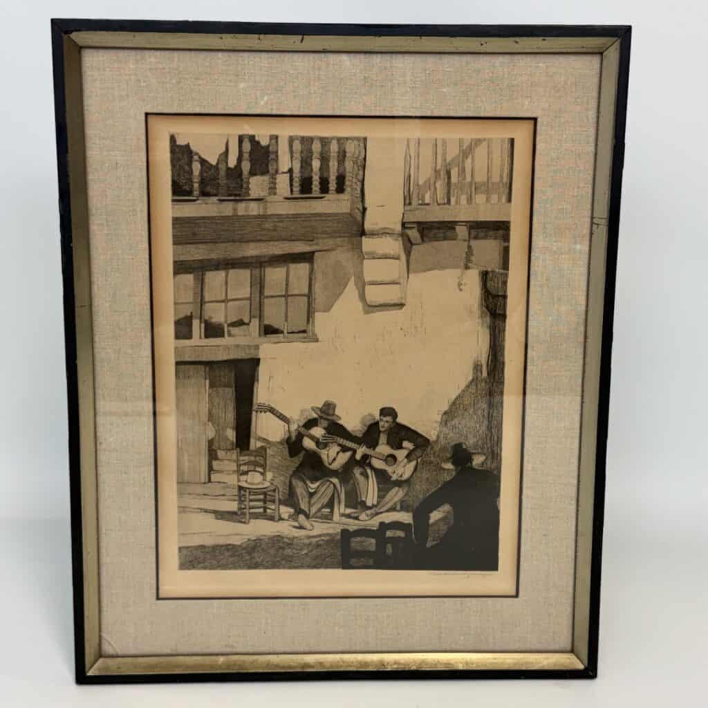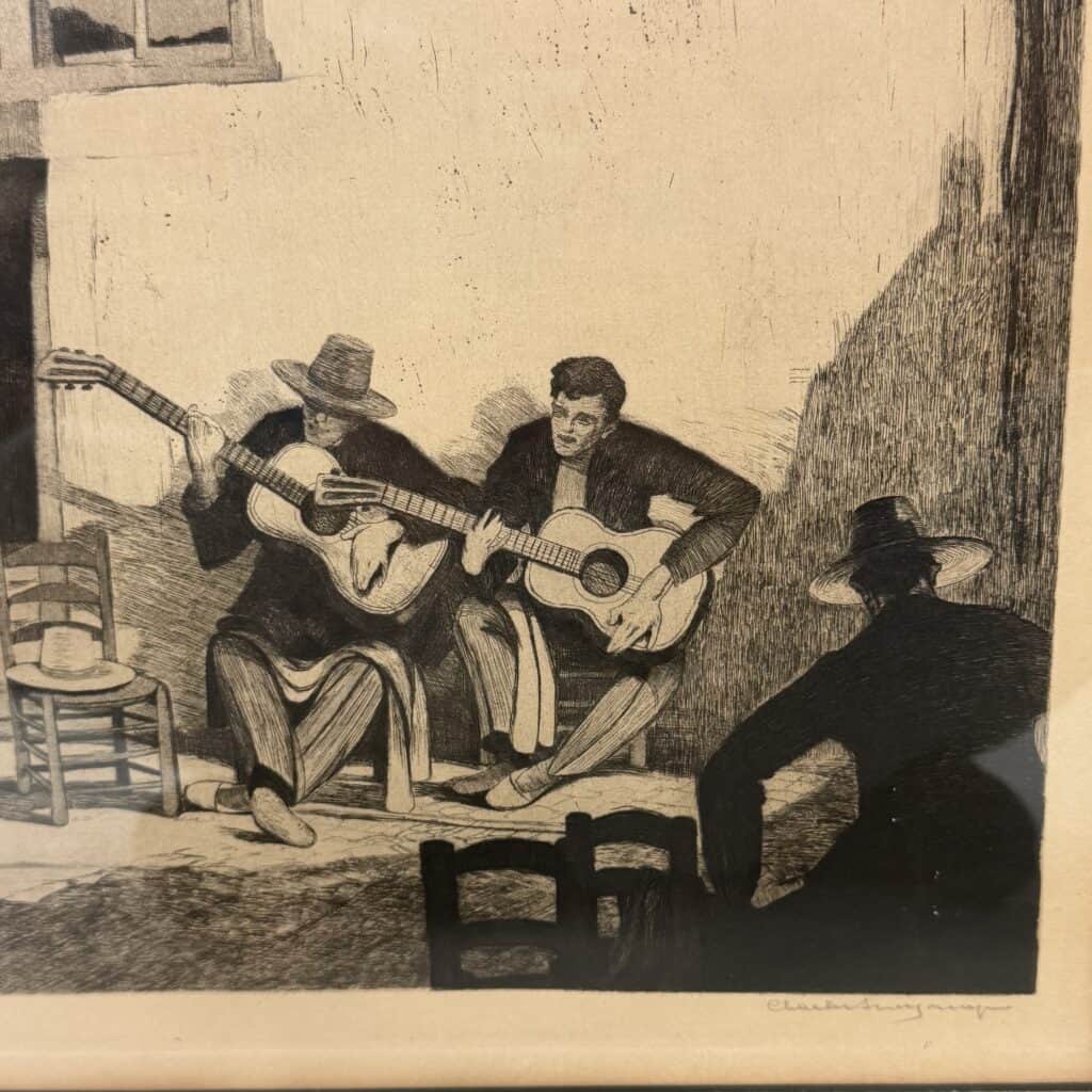 This well-known scene depicts two men playing guitar and a third figure watching them, in what appears to be a Mediterranean setting. Charles Swyncop was a Brussels painter, draughtsman, and lithographer who often traveled to Italy and Spain. The etching is printed on handmade paper and is a well-known work by the artist.