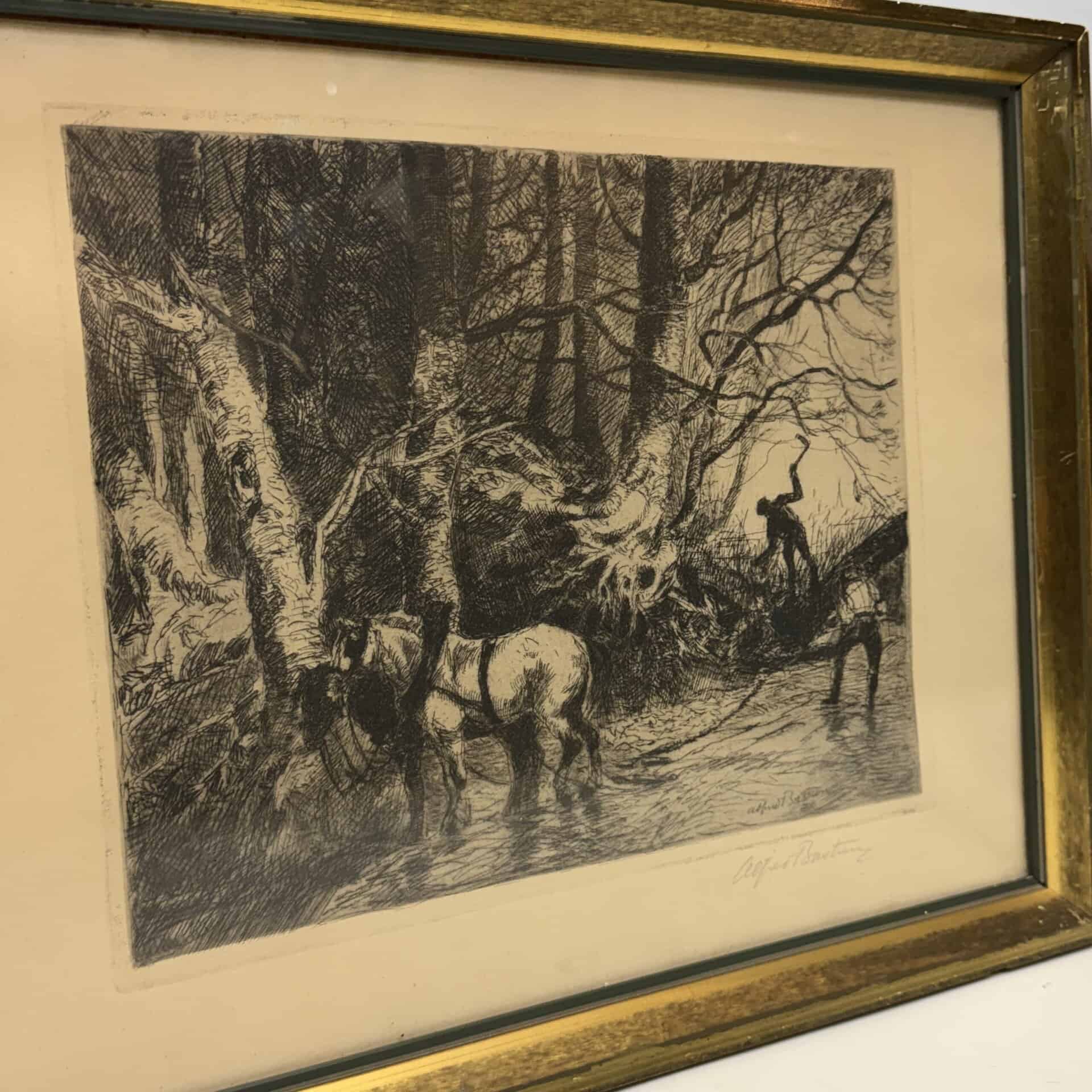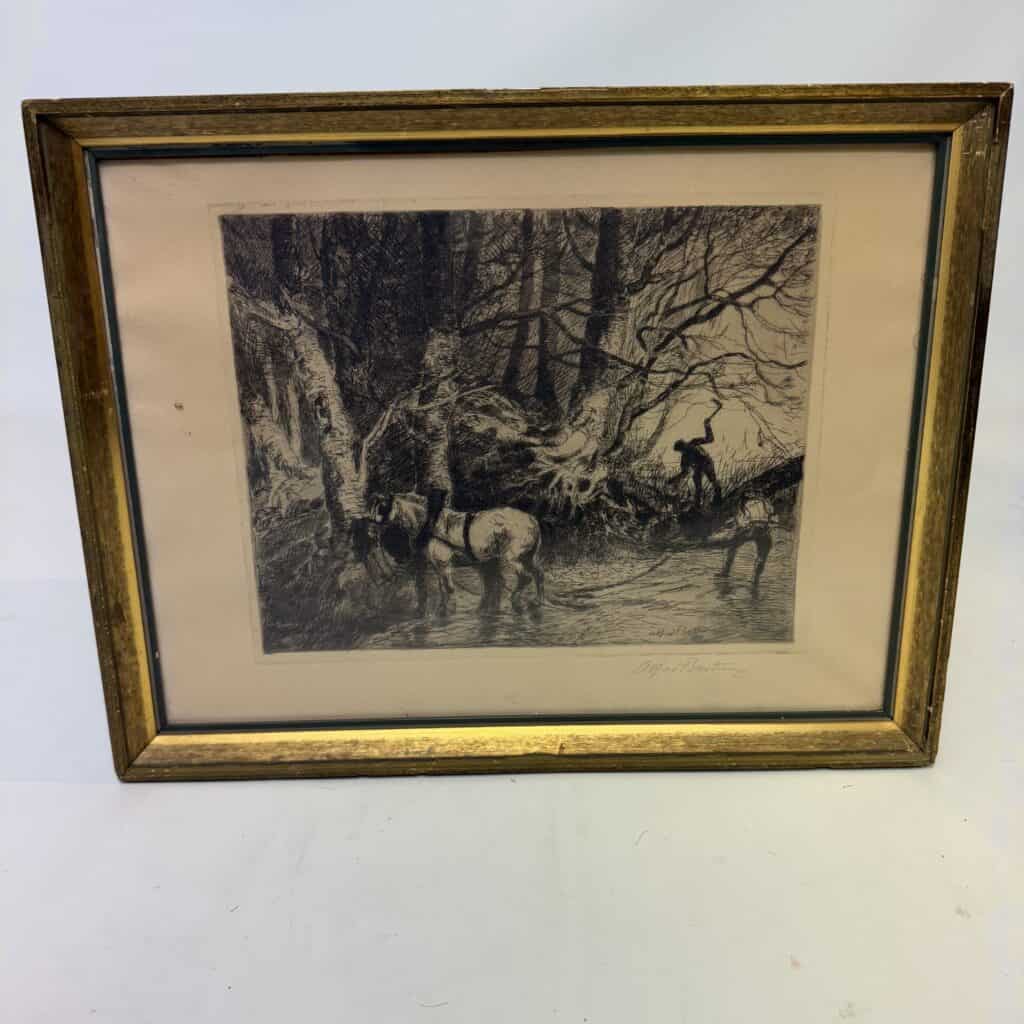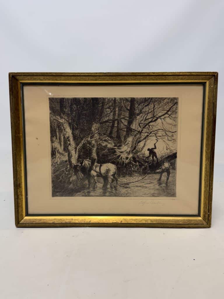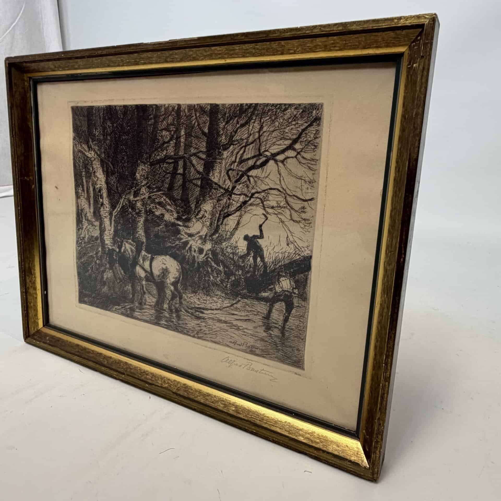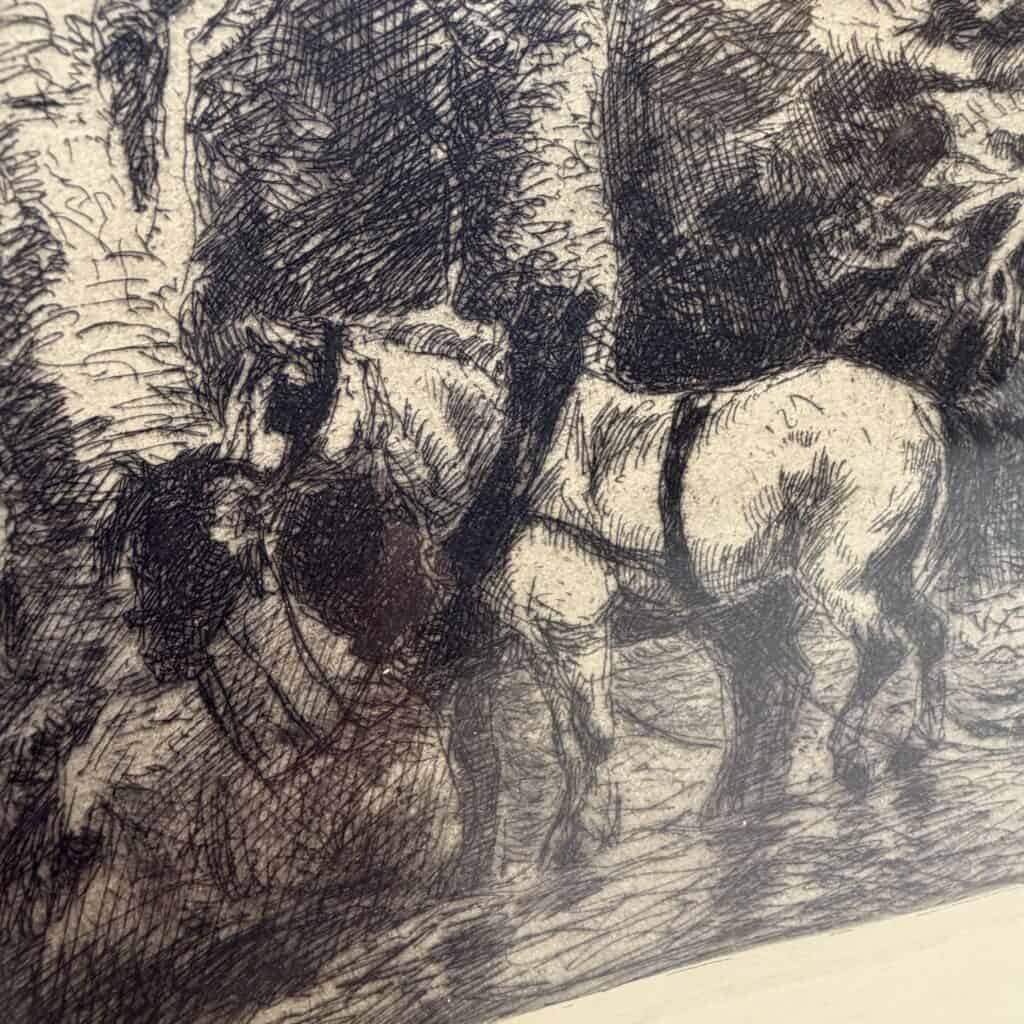 This etching depicts woodcutters at work with horses in the foreground in a wooded area.